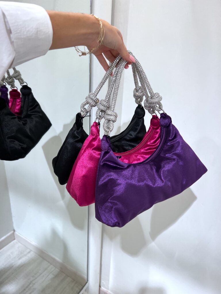 I colori che troverete ripetersi sia per borse che scarpe sono: il fucsia, viola, nero e oro, con cascate di strass argentati. Ogni accessorio twentyfourhaitch fa la differenza, e anche con l’outfit più semplice in assoluto ti farà brillare.