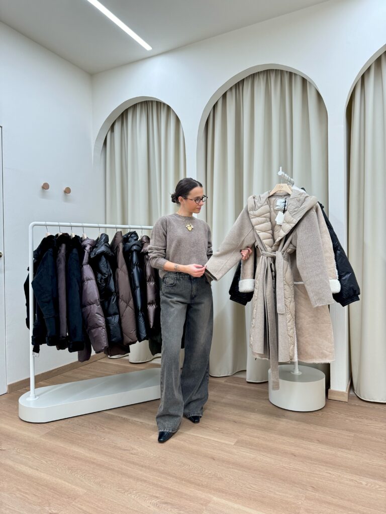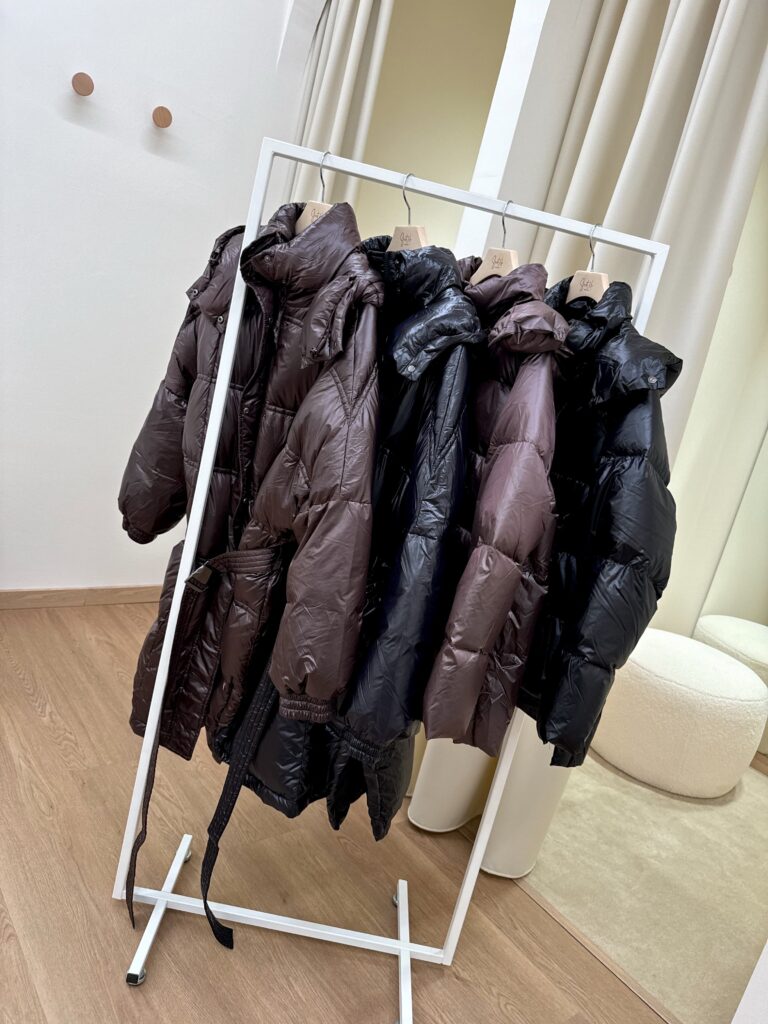 I dettagli che fanno la differenza in ogni capospalla: cinture in vita, bottoni gioiello, cappucci removibili e inserti in eco-pelliccia. L’attenzione ai materiali è al centro: tessuti di qualità e imbottiture in vera piuma accompagnano la ricerca del comfort, senza rinunciare all’eleganza.
