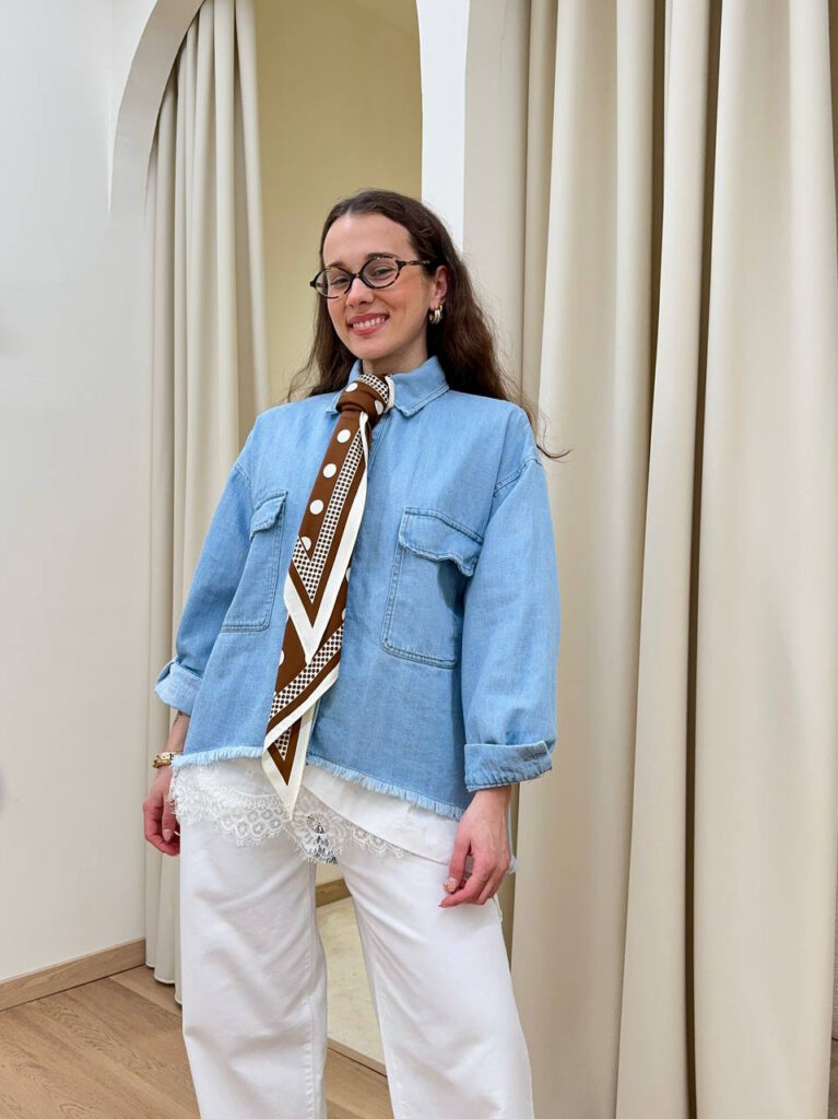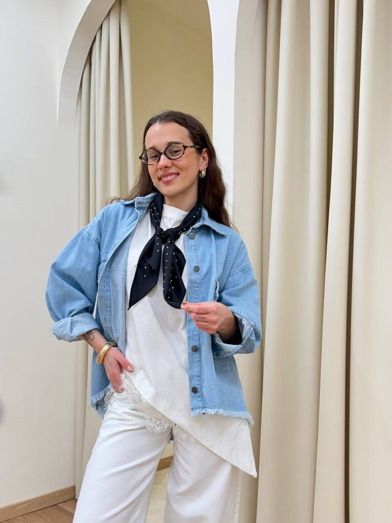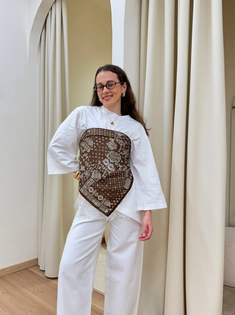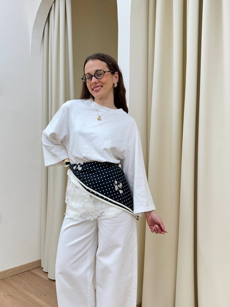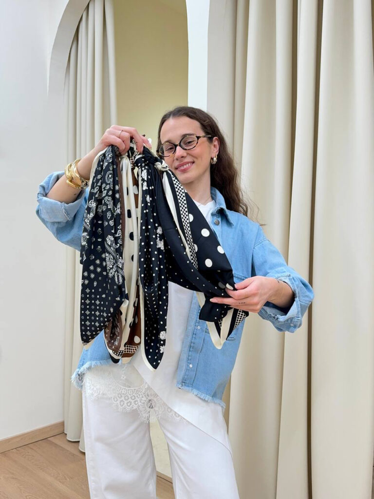 Un foulard può essere annodato in vita su un vestito, su una gonna o sopra a capi oversize come t-shirt e camicie, in pizzo o in fantasia aggiunge movimento e personalità all’outfit.