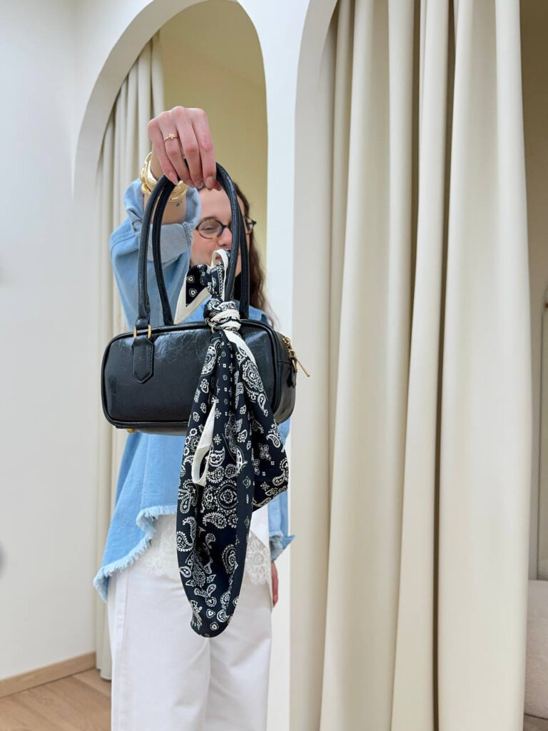 Legato al manico di una borsa, il foulard diventa un elemento decorativo raffinato. È un modo semplice per rinnovare un accessorio senza cambiarlo completamente.