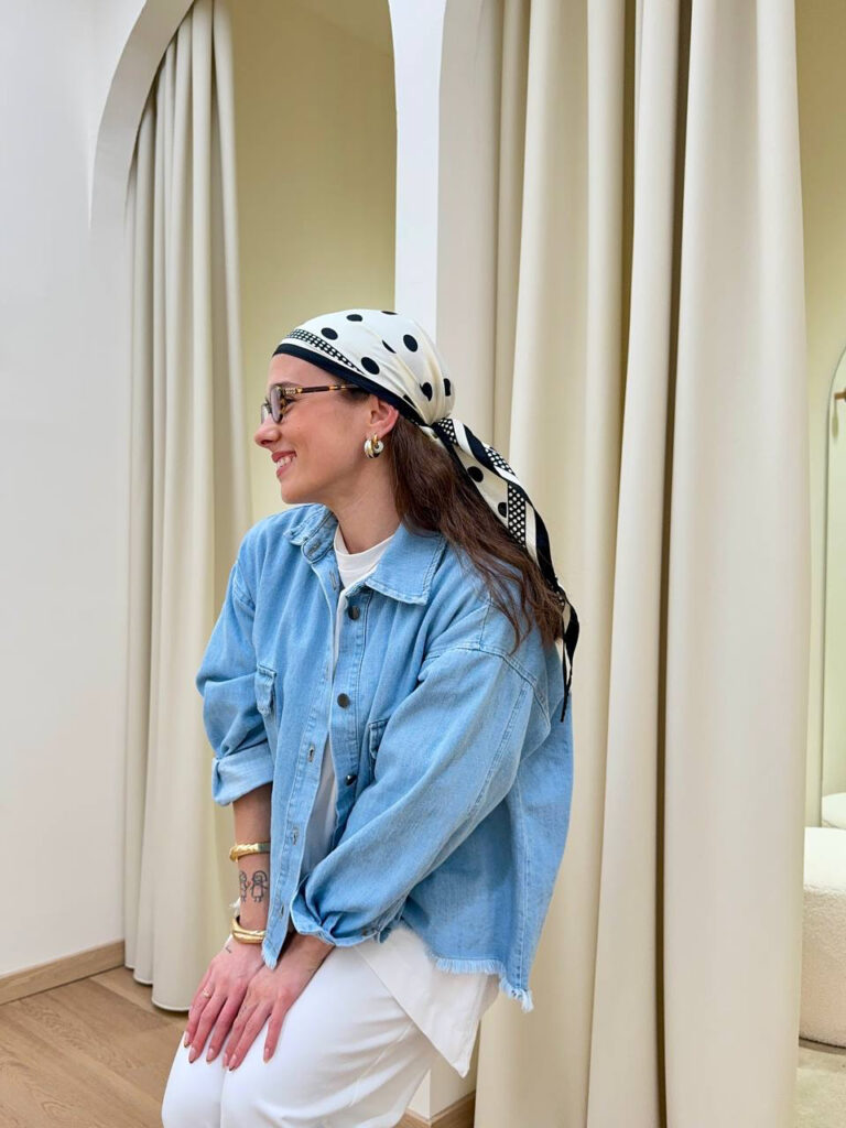 Indossato come bandana, coprendo la testa e annodato dietro, il foulard richiama uno stile bohémien e rilassato, ideale per l’estate o per un look da viaggio. Si può usare anche come fascia, annodarlo sopra la testa in stile pin-up oppure intrecciarlo su un’acconciatura.