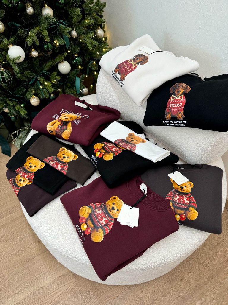 Per i momenti più rilassati abbiamo selezionato maglioni morbidi, felpe e t-shirt con stampe e ricami natalizi: orsetti, fiocchi di neve, dettagli ironici o romantici che scaldano il cuore (e il guardaroba). Perfetti da abbinare a jeans o gonne in satin, per un look comodo ma curato, ideale per stare in famiglia senza rinunciare al mood natalizio.