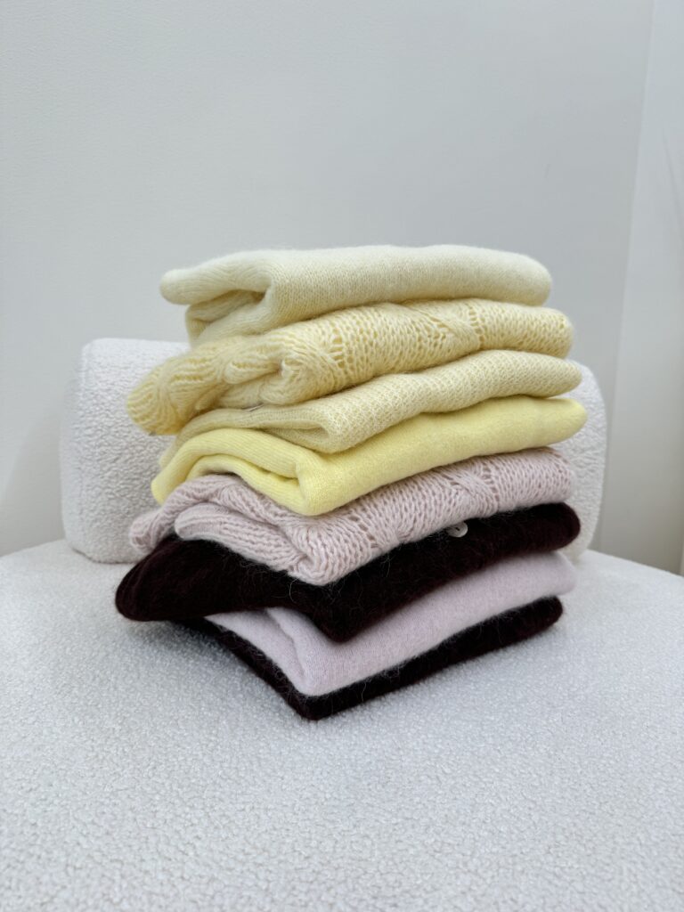 I toni della stagione si ispirano alla natura: crema, beige, grigio perla, marrone nocciola e verde oliva si mescolano a nuance più decise come bordeaux, blu notte e nero profondo. I filati morbidi e caldi, come misto lana, mohair, cachemire o viscosa elasticizzata, garantiscono comfort e vestibilità impeccabile, senza rinunciare a un tocco di eleganza.