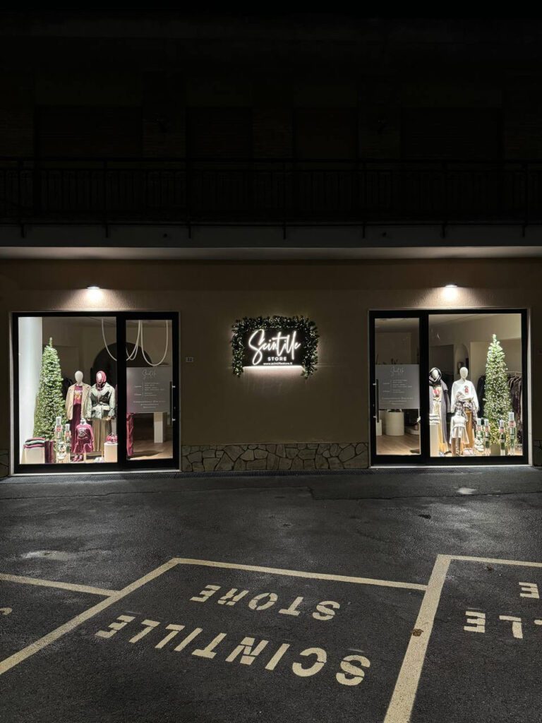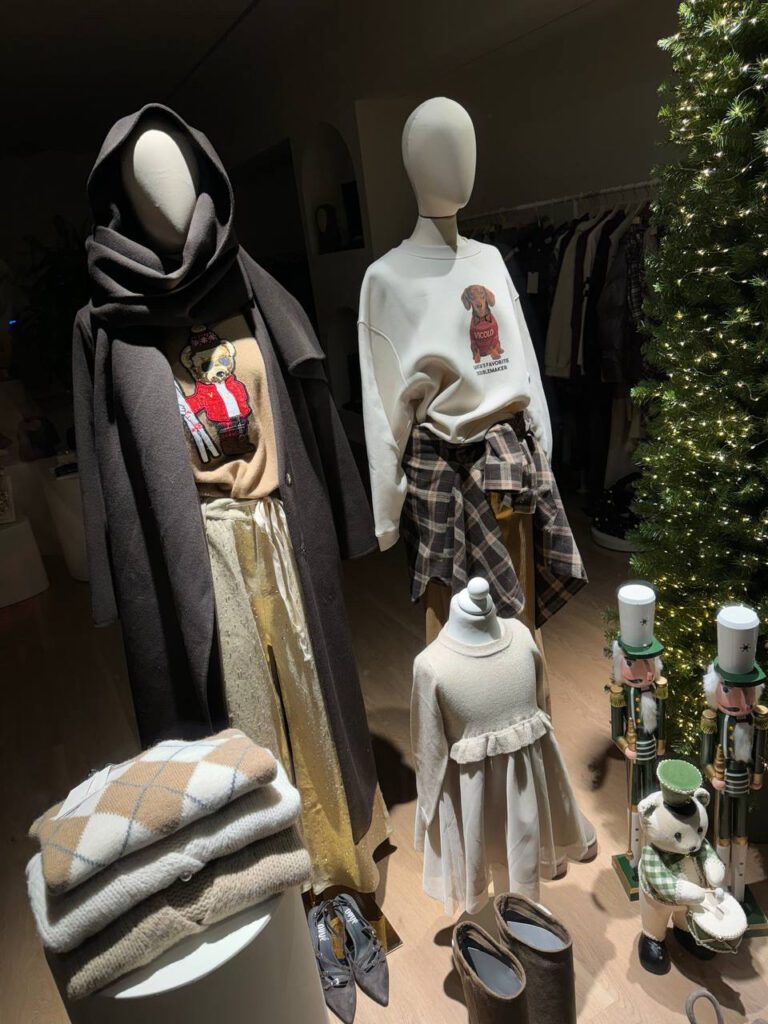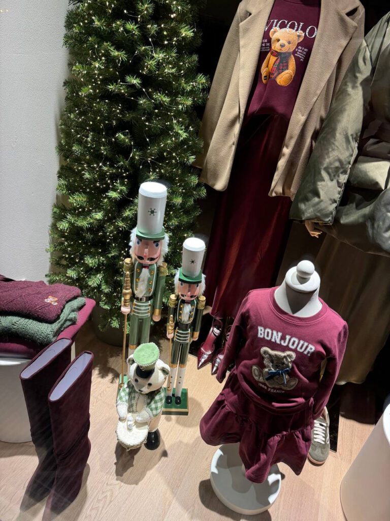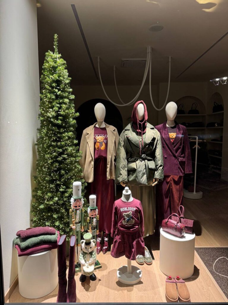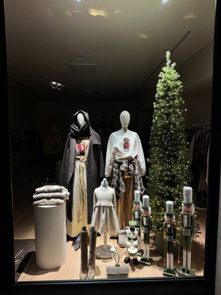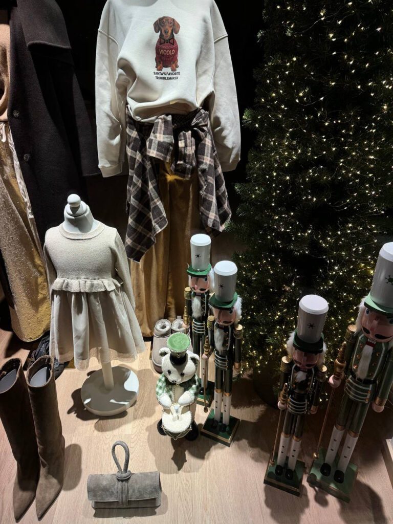 Entrambe le vetrine sono illuminate da grandi alberi verdi, ricchi di luce e riflessi dorati che accompagnano chi passa a fermarsi anche solo per un istante. Le loro chiome brillanti creano la cornice perfetta per presentare la nostra selezione dedicata alle feste: calda, sofisticata, accogliente. Accanto agli alberi, abbiamo scelto gli Schiaccianoci, simbolo natalizio per eccellenza, aggiunge un tocco fiabesco che fa tornare bambini.