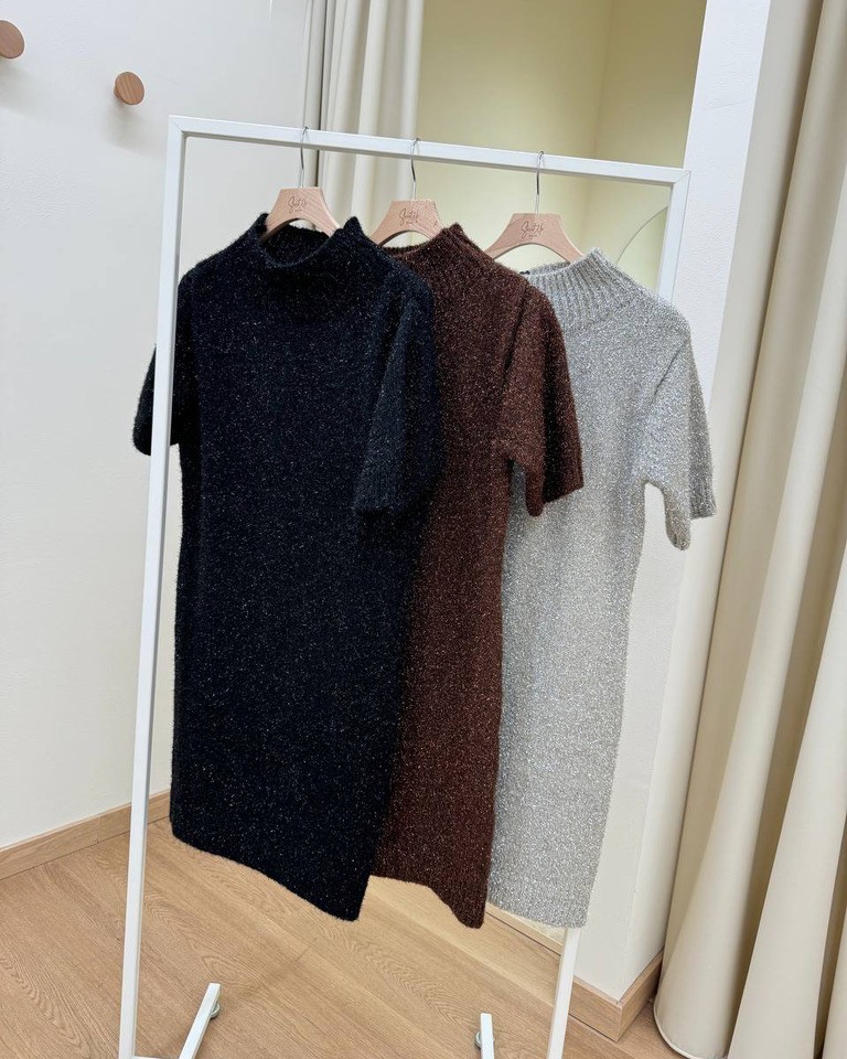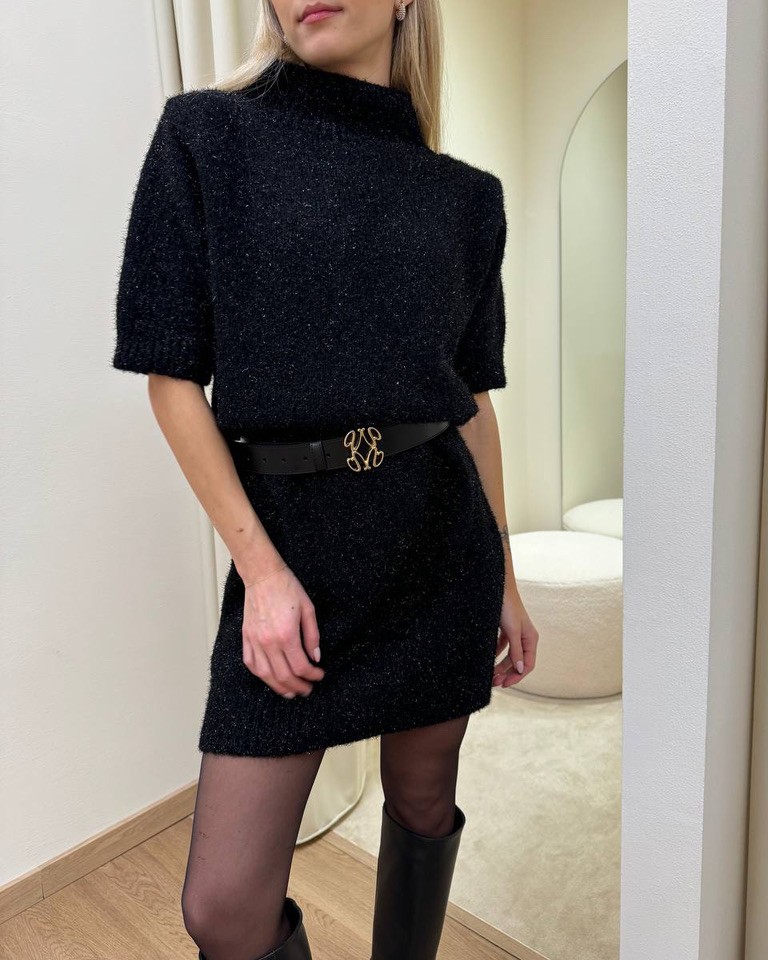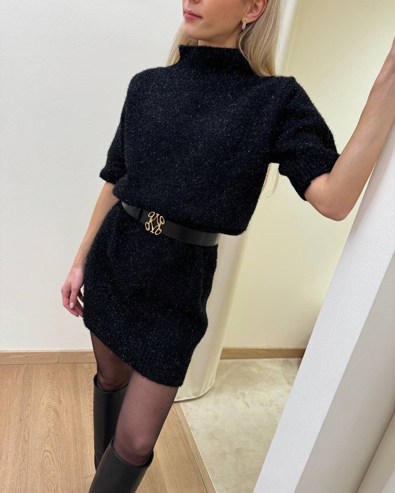 Abito in maglia nero con lurex in tono, con lana e viscosa. Modello corto a mezze maniche e collo alto. Vestibilità regolare.