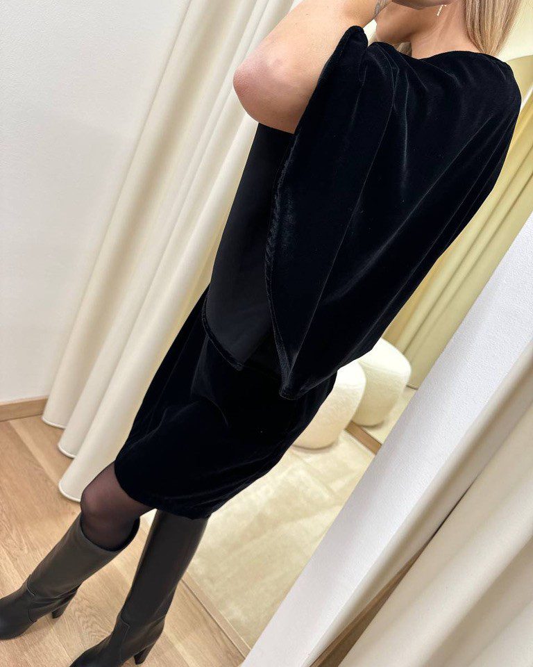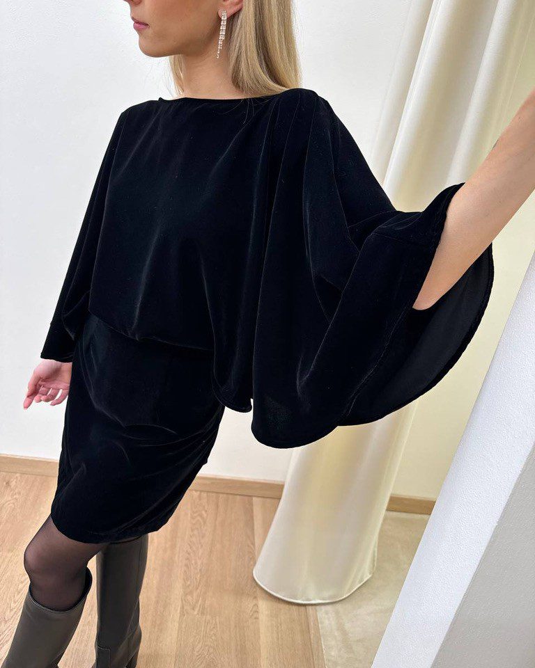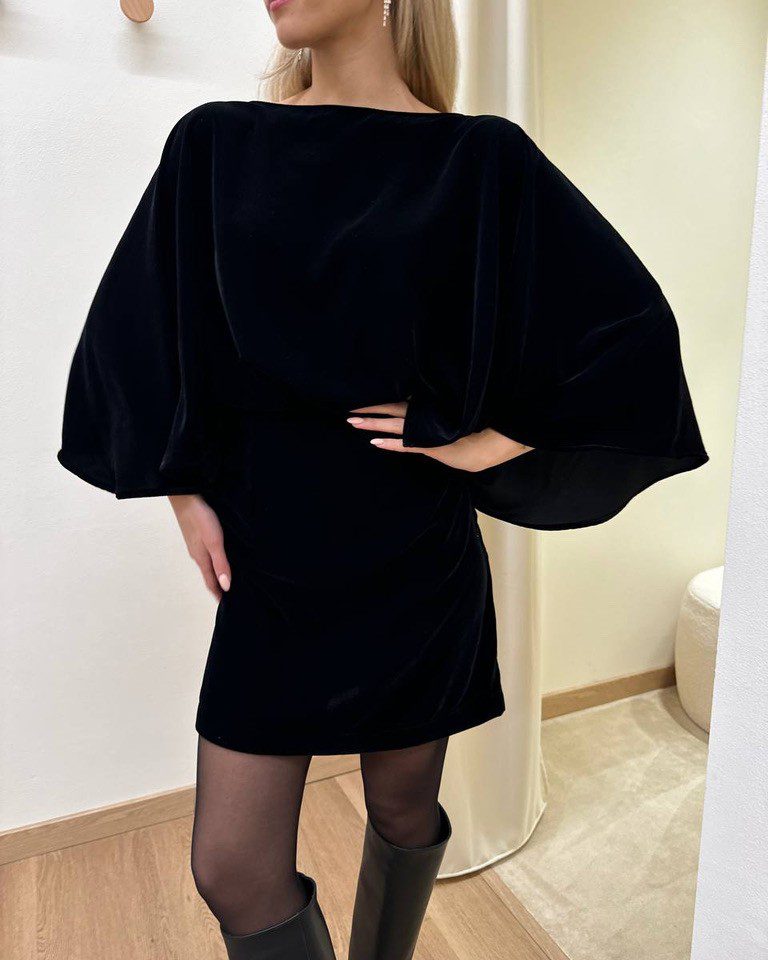 Vestito corto in velluto nero, modello corto con scollo a barca e maniche ampie a pipistrello. Vestibilità regolare ed elasticizzata.