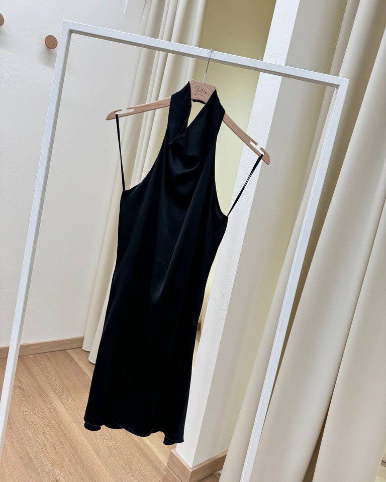 Vestito nero in raso di viscosa, modello corto con scollo all’americana e chiusura al collo con bottoni, scollo ad anello e profondo sul dietro. Vestibilità regolare ed elasticizzata.