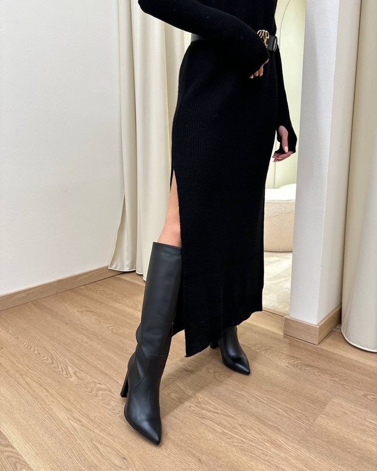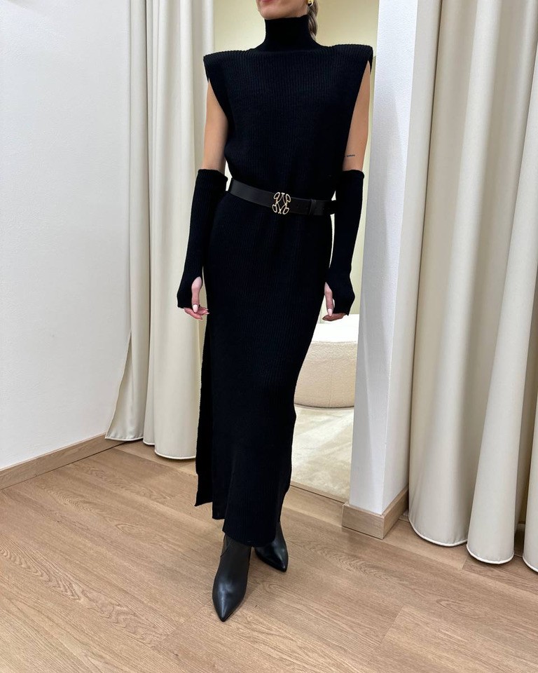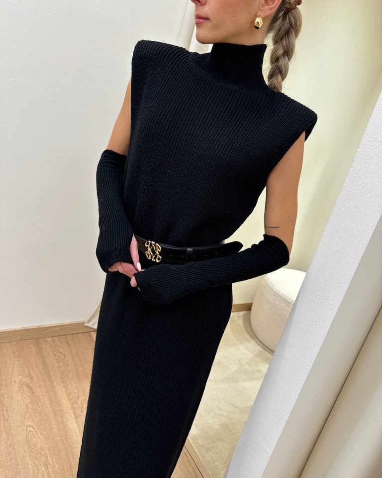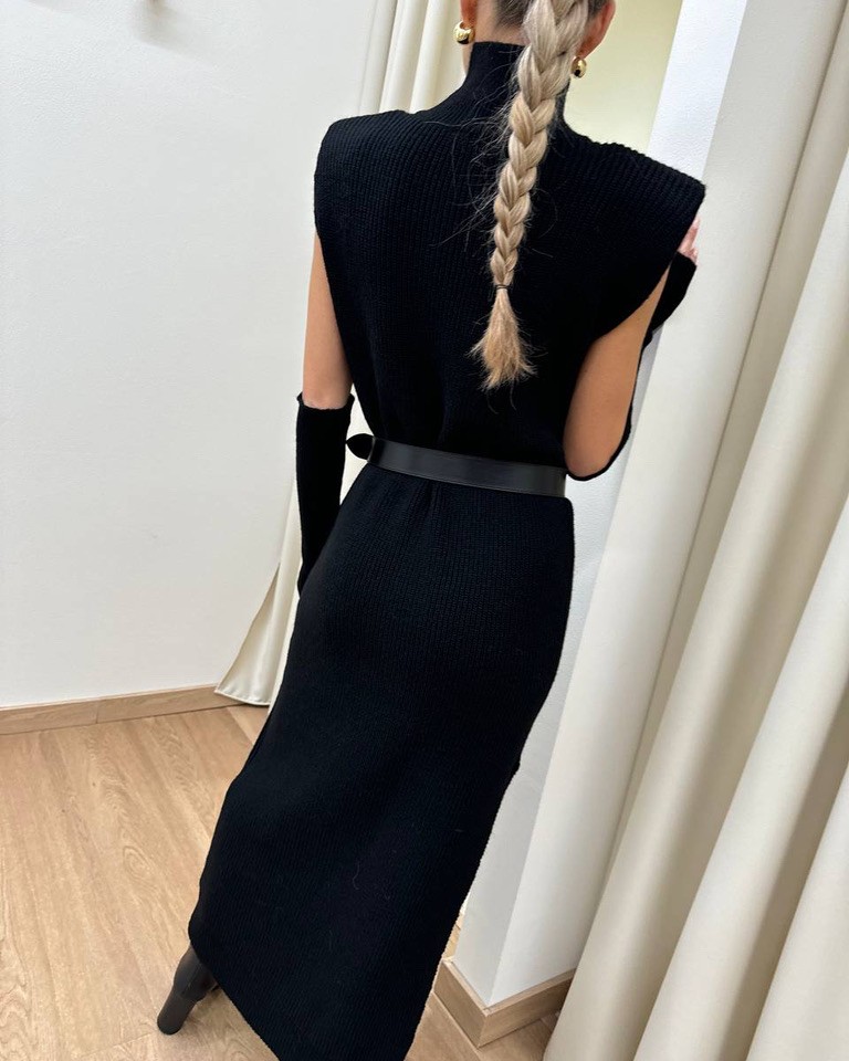 Abito nero in maglia con lana, viscosa e alpaca. Modello lungo e smanicato con collo alto, spalle larghe con spalline interne imbottite, spacco laterale e manicotti abbinati.