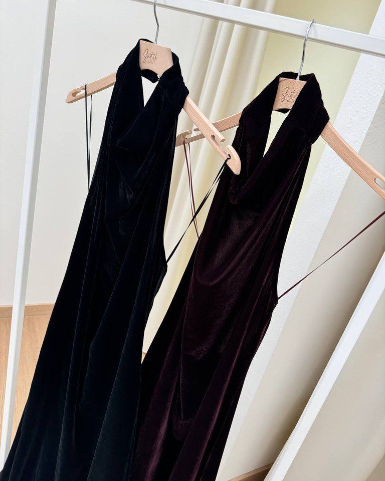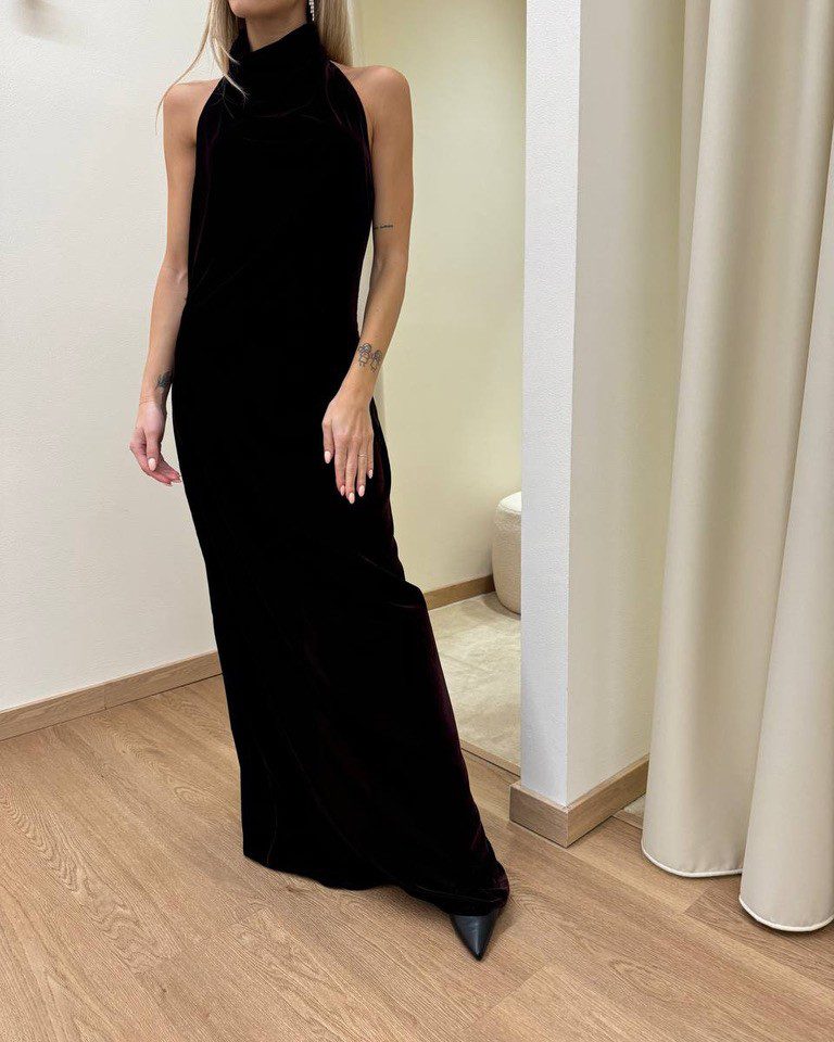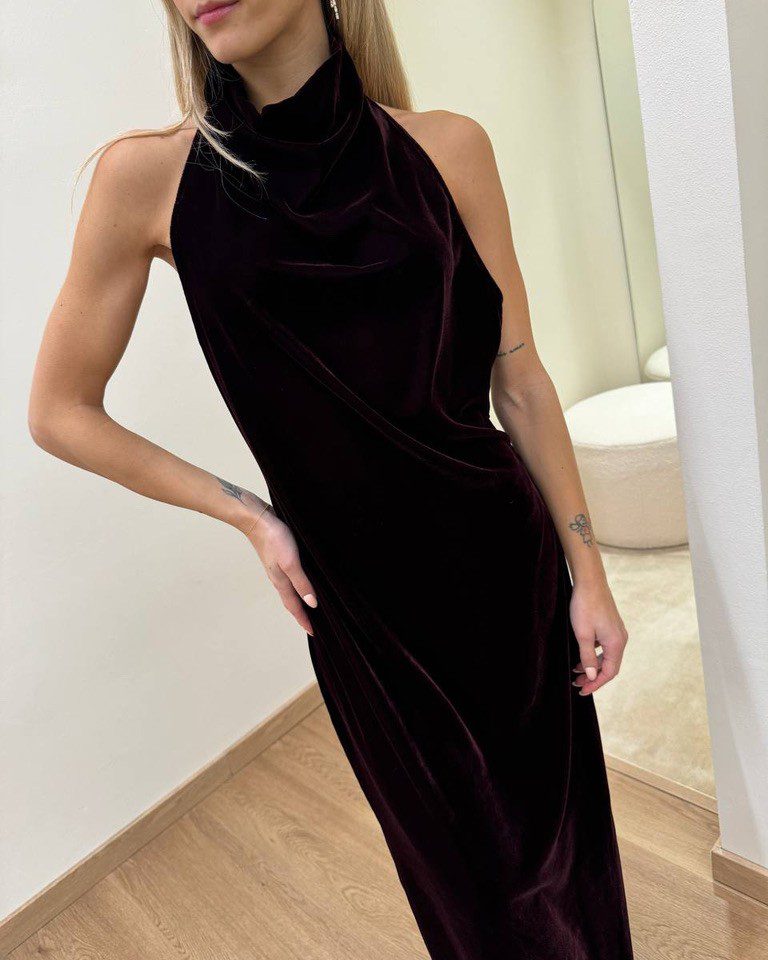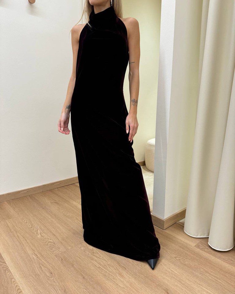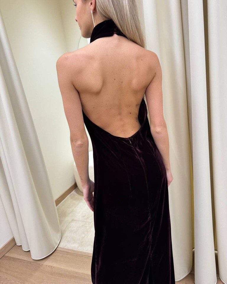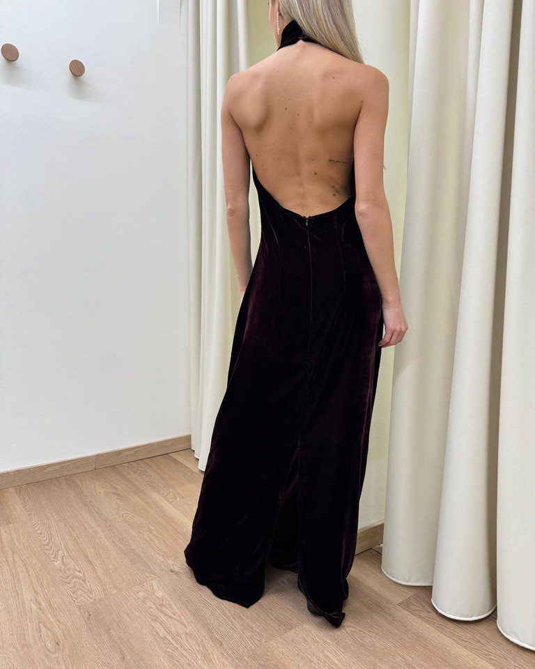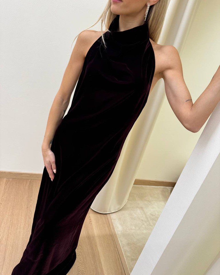 Abito in velluto bordeaux, modello lungo, scollo all’americana con schiena scoperta e spacco centrale sul dietro. Chiusura dietro con zip invisibile e bottoncini al collo. Vestibilità regolare.