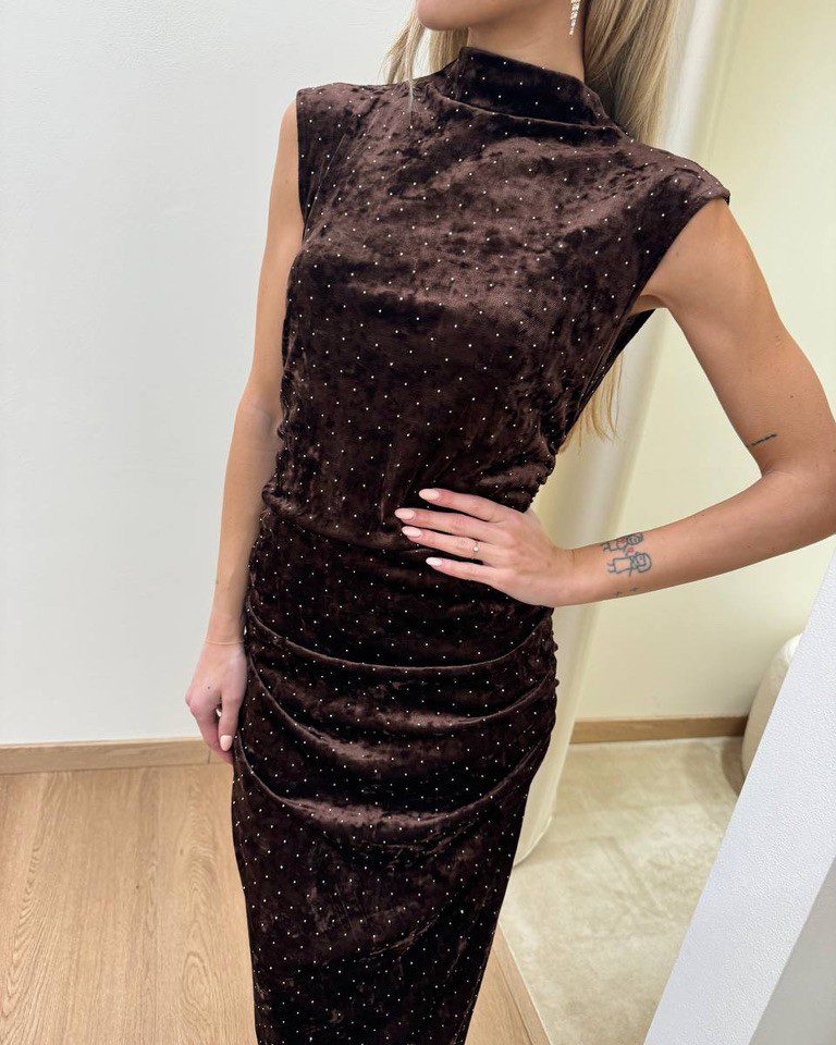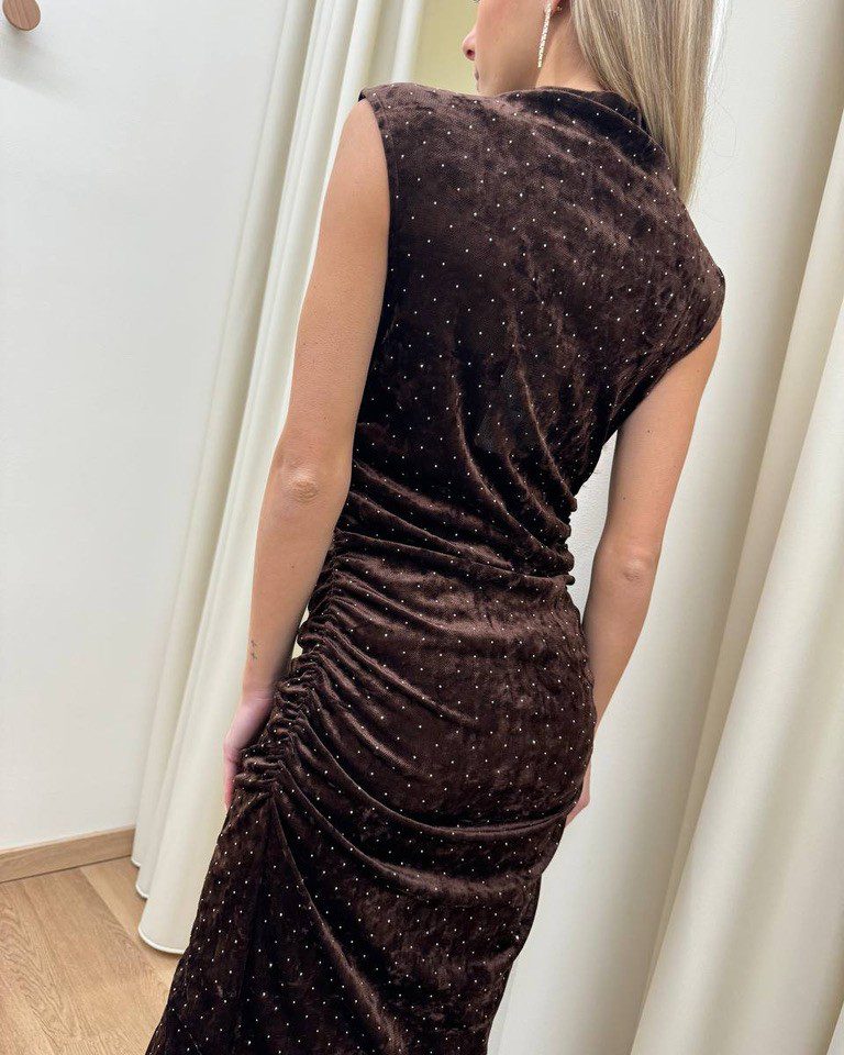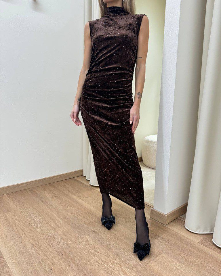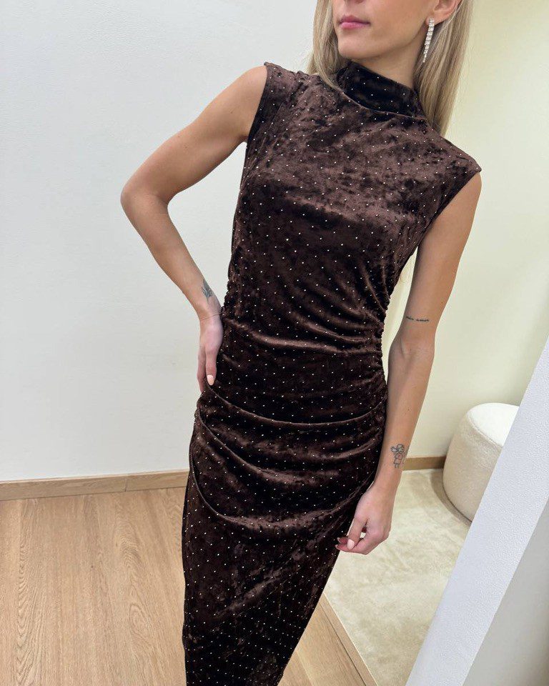 Vestito in velluto moro con strass, modello midi smanicato con collo vulcano e drappeggi sui fianchi. Vestibilità aderente elasticizzata.