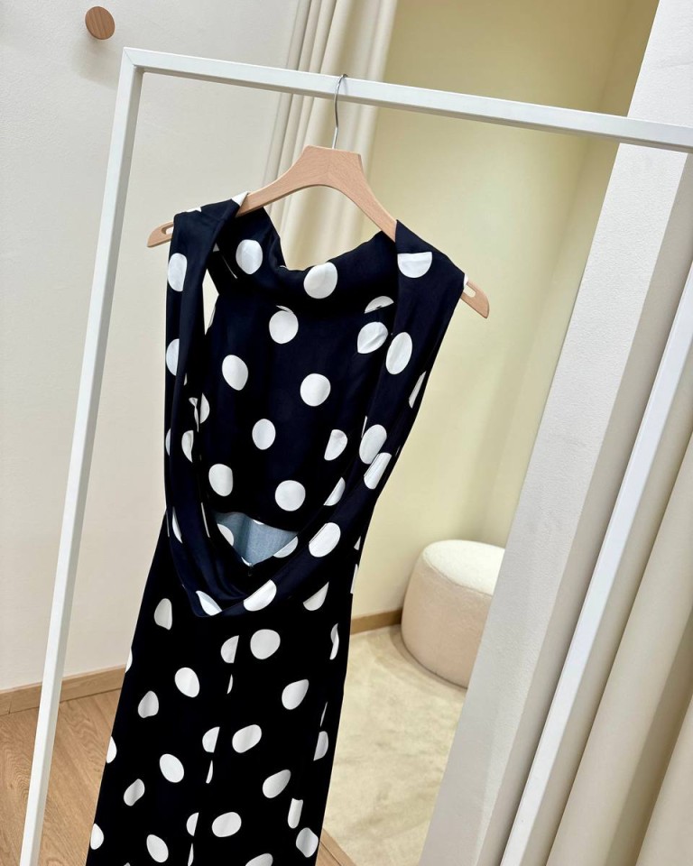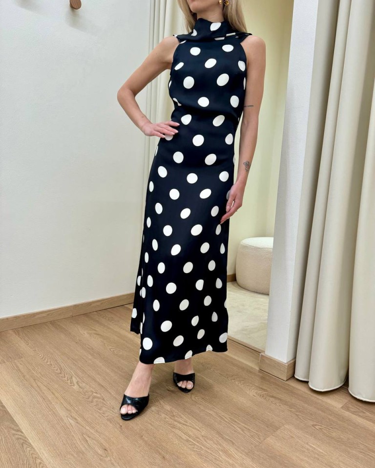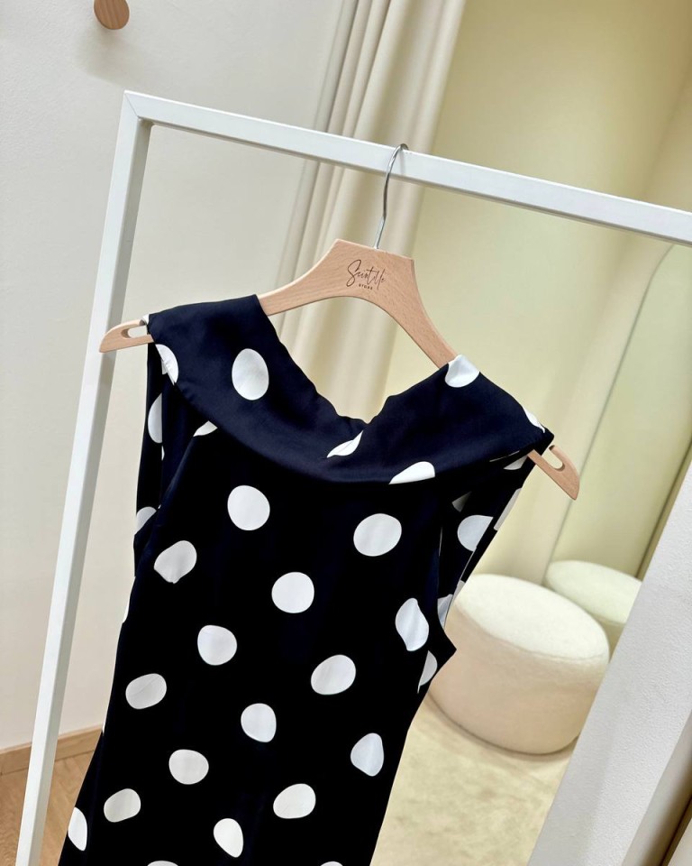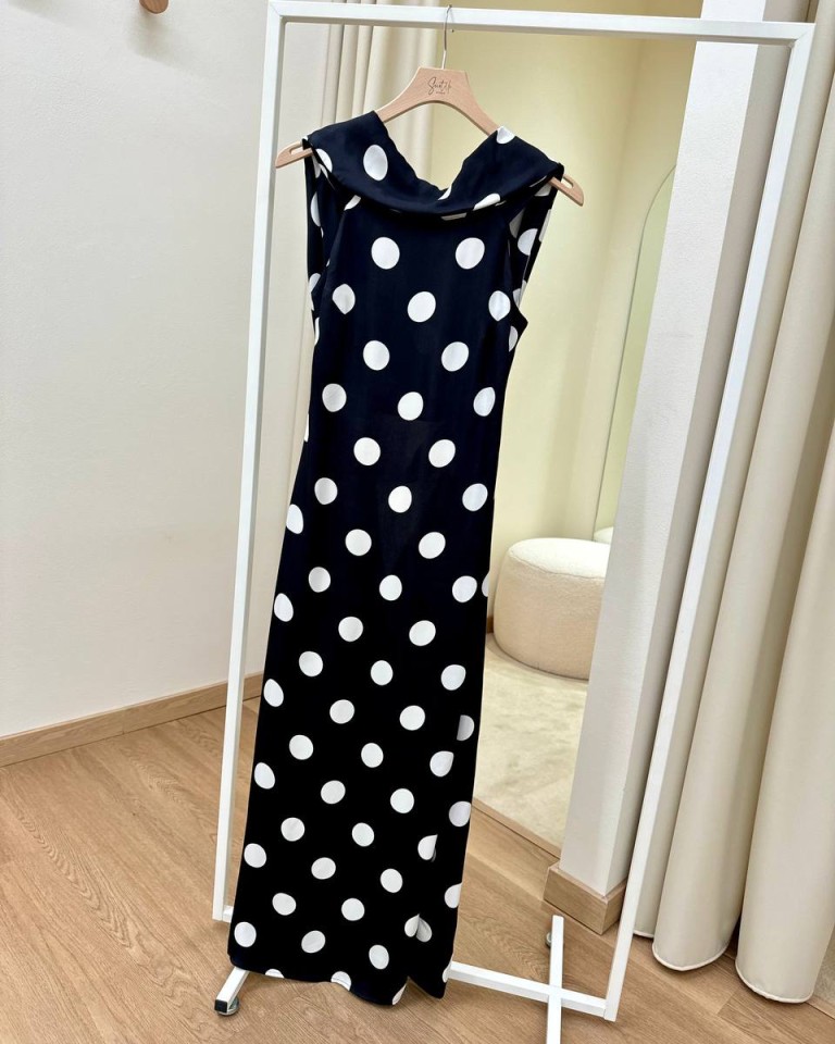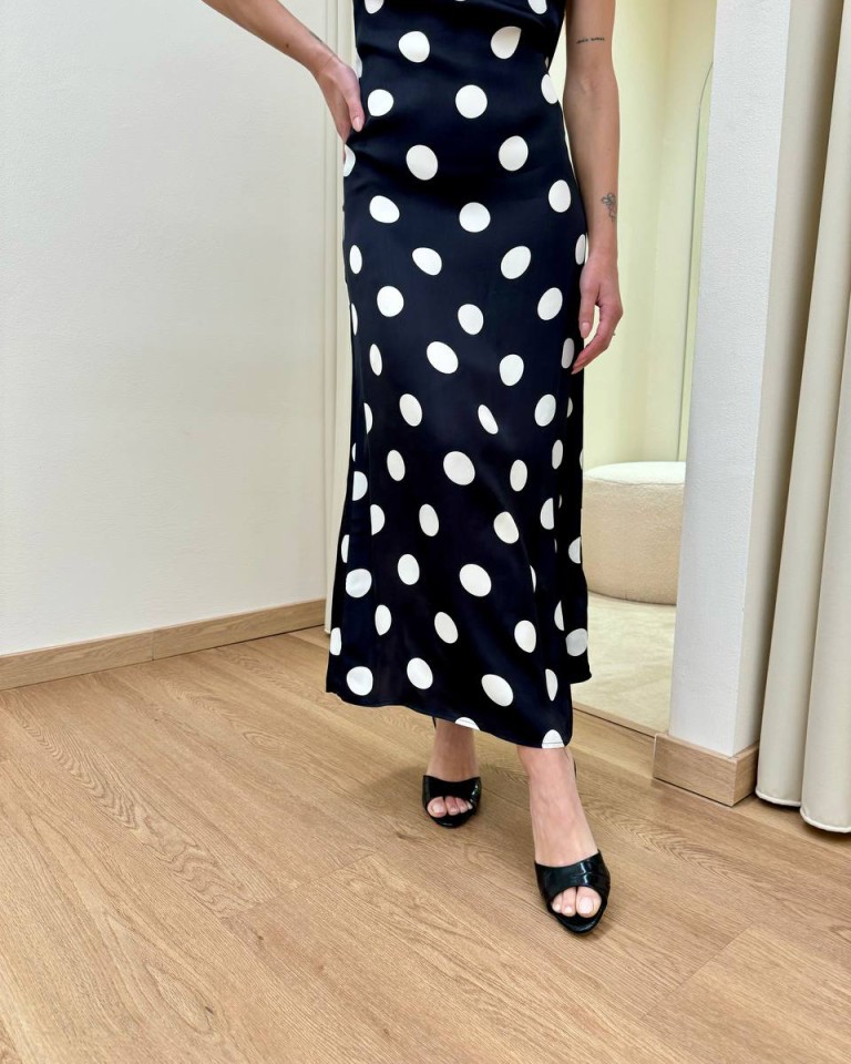 Abito nero con pois grandi bianchi, modello midi, dritto con scollo a barca e scollo profondo sulla schiena, chiusura dietro con zip invisibile. Vestibilità regolare.
