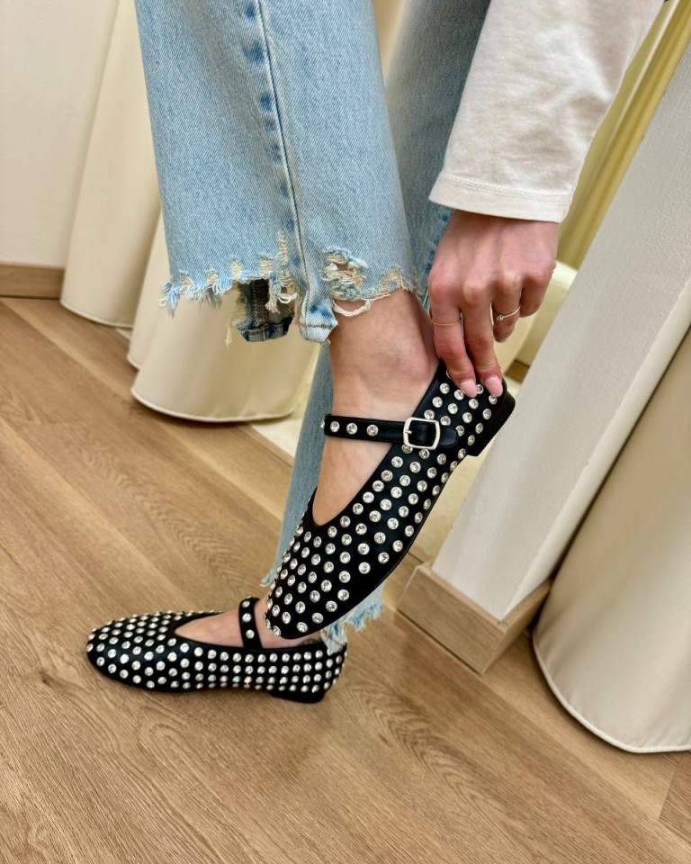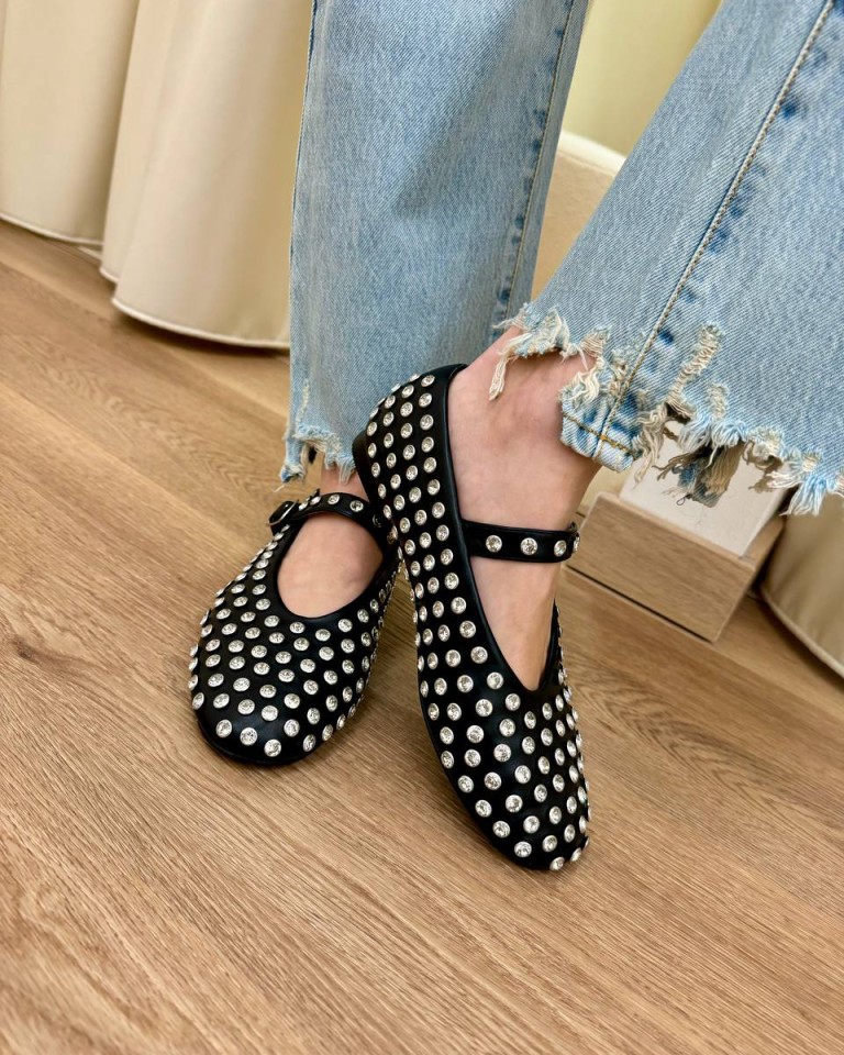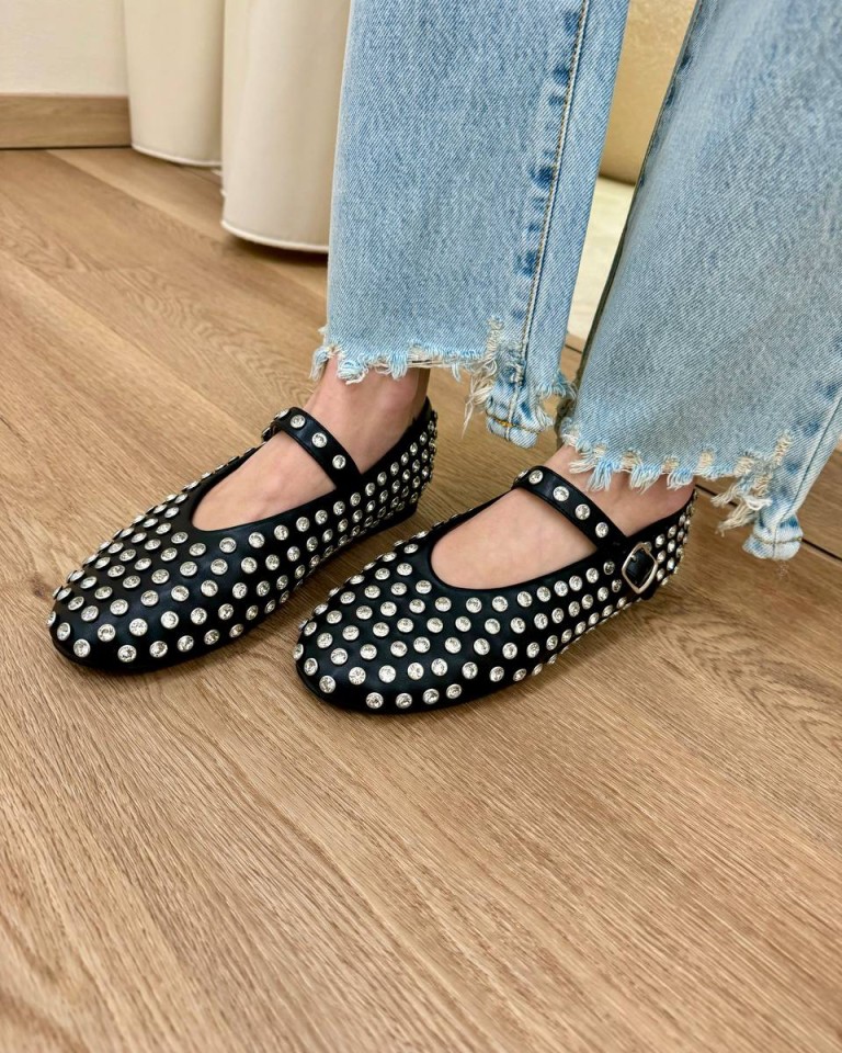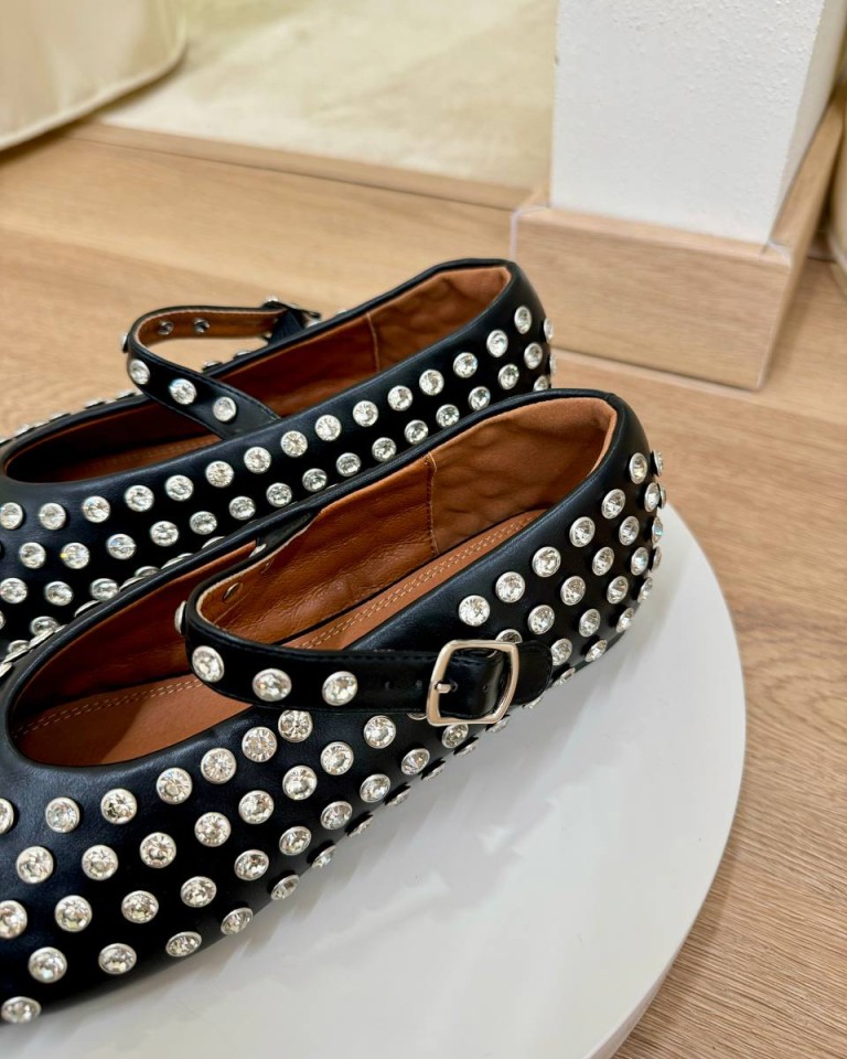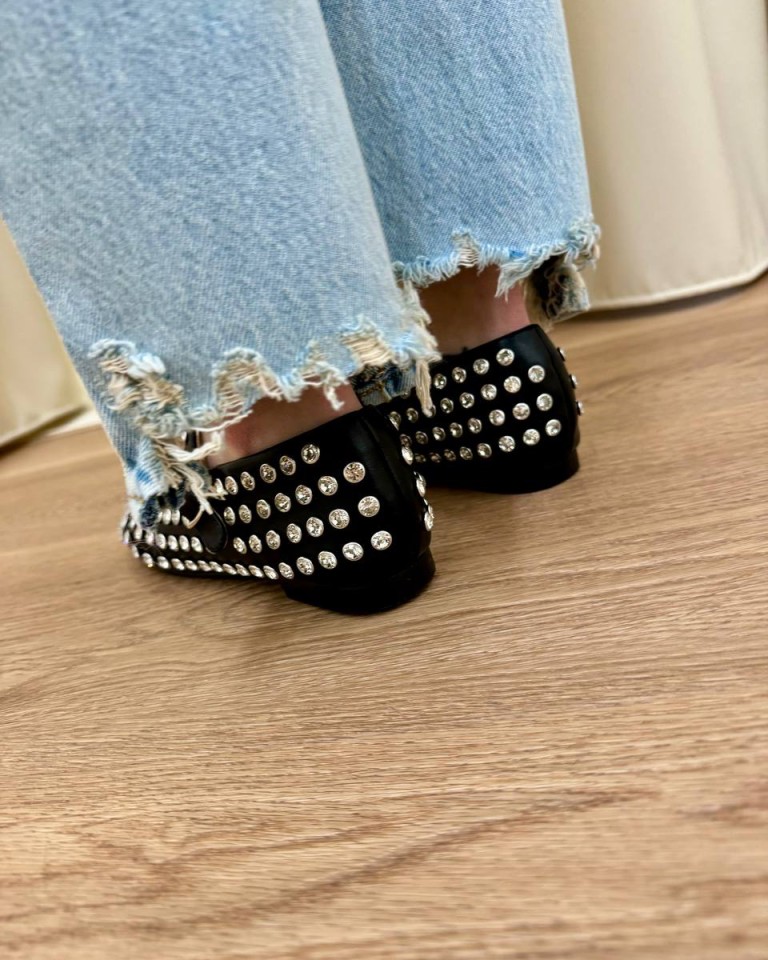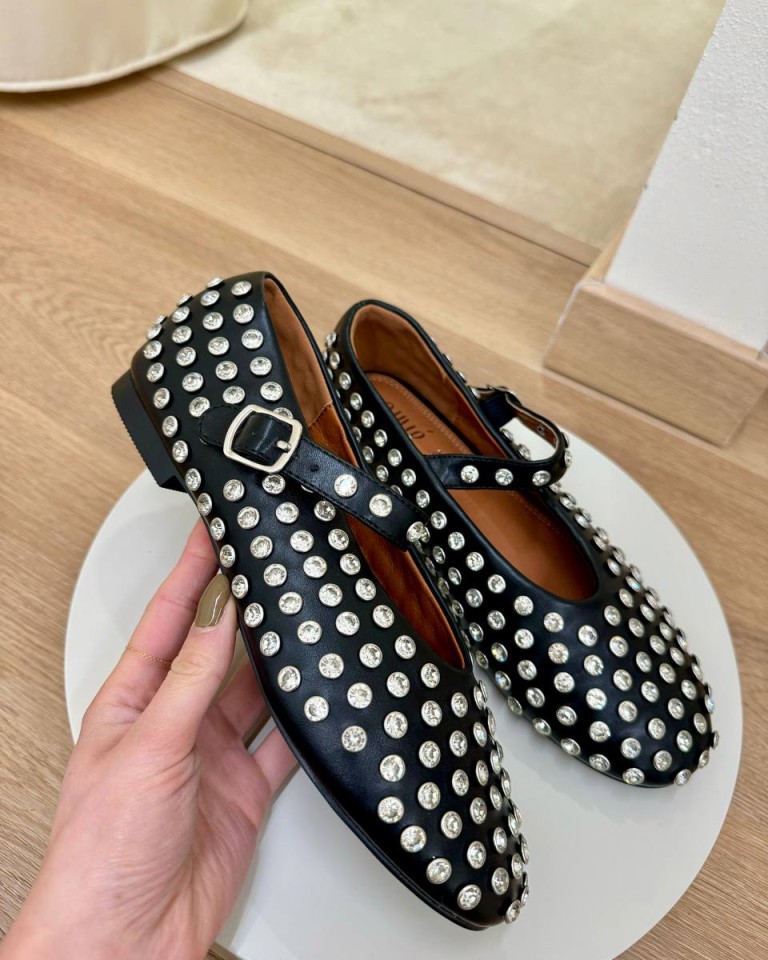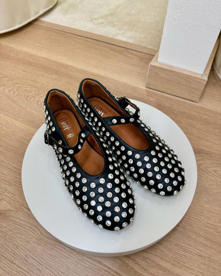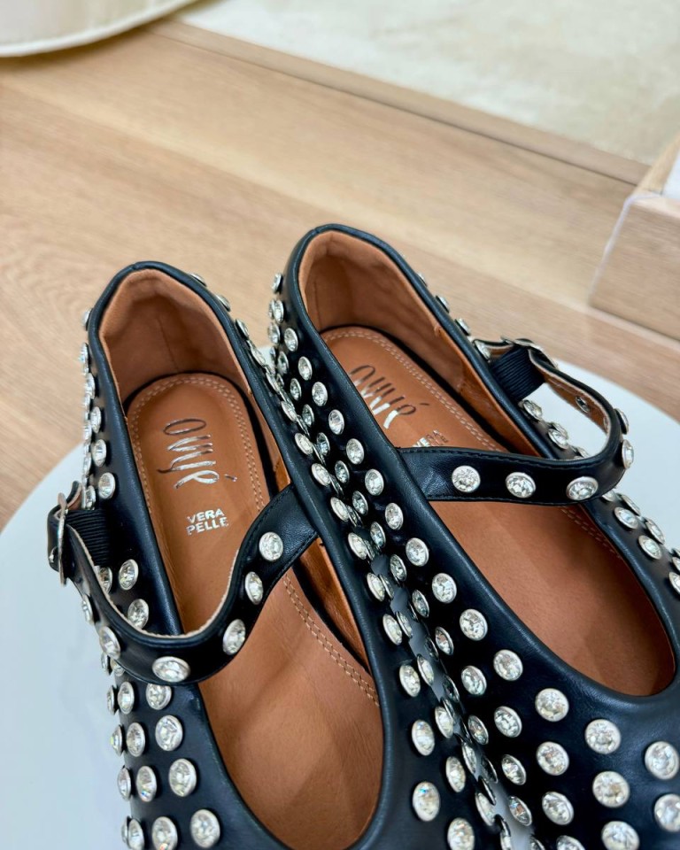 Ballerina nera ricoperta da strass in vera pelle, modello con punta stondata e chiusura con cinturino centrale regolabile. Calzata regolare.