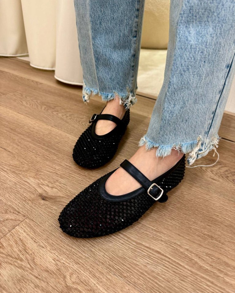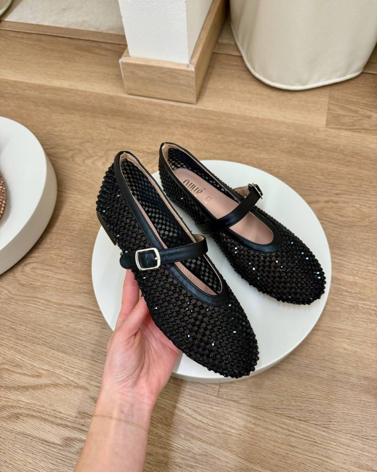 Ballerina in rete semitrasparente nera con strass in tono, modello flat con cinturino, tacco 1cm circa . Calzata regolare.