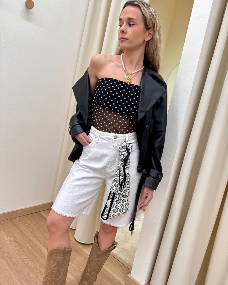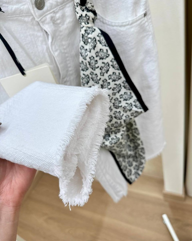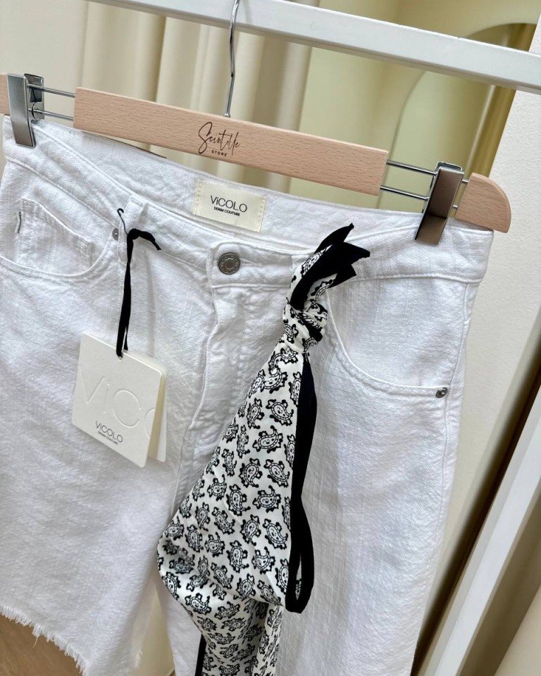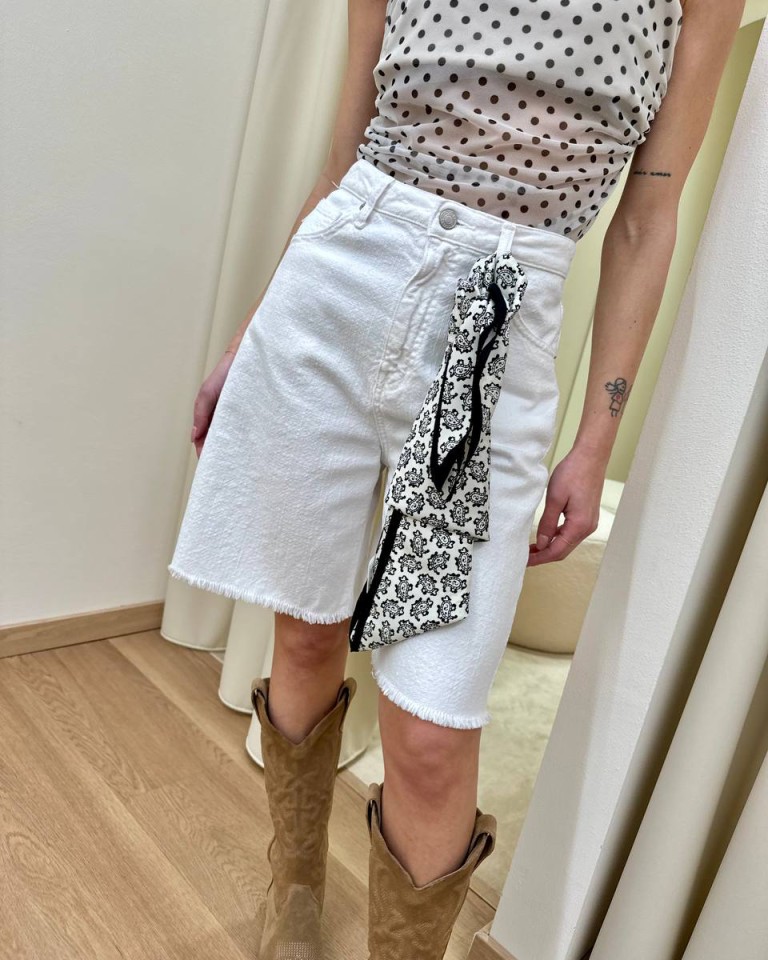 Bermuda in denim effetto tweed bianco, modello a vita alta, orlo sfrangiato, cinque tasche, foulard abbinato stampa paisley, chiusura con bottone e zip. Vestibilità regolare.