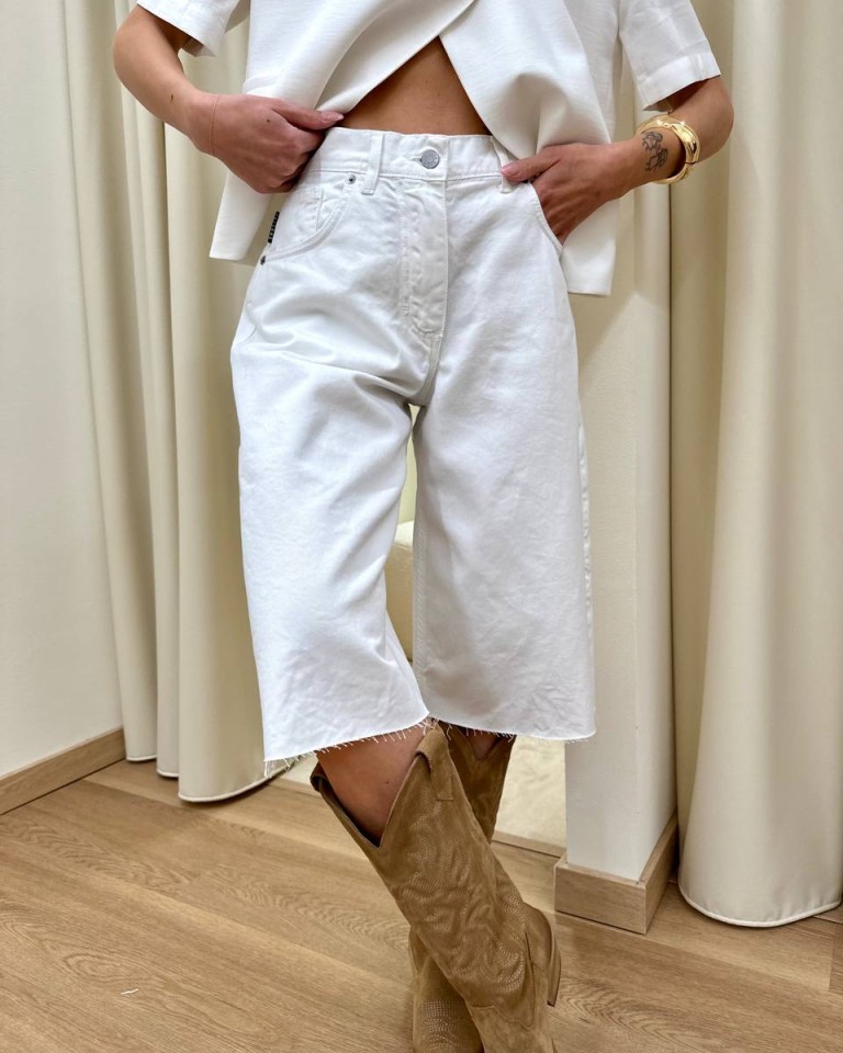 Bermuda in denim bianco, modello vita alta, cinque tasche e orlo taglio vivo, chiusura con zip e bottone. Vestibilità regolare.
