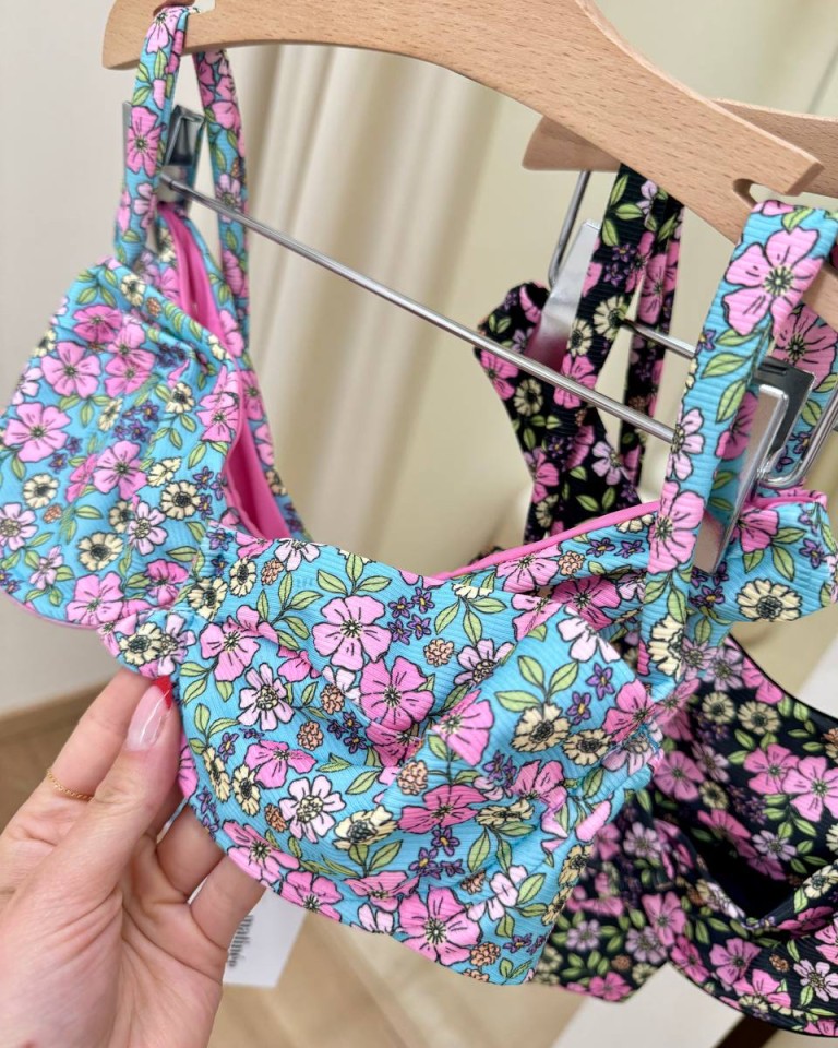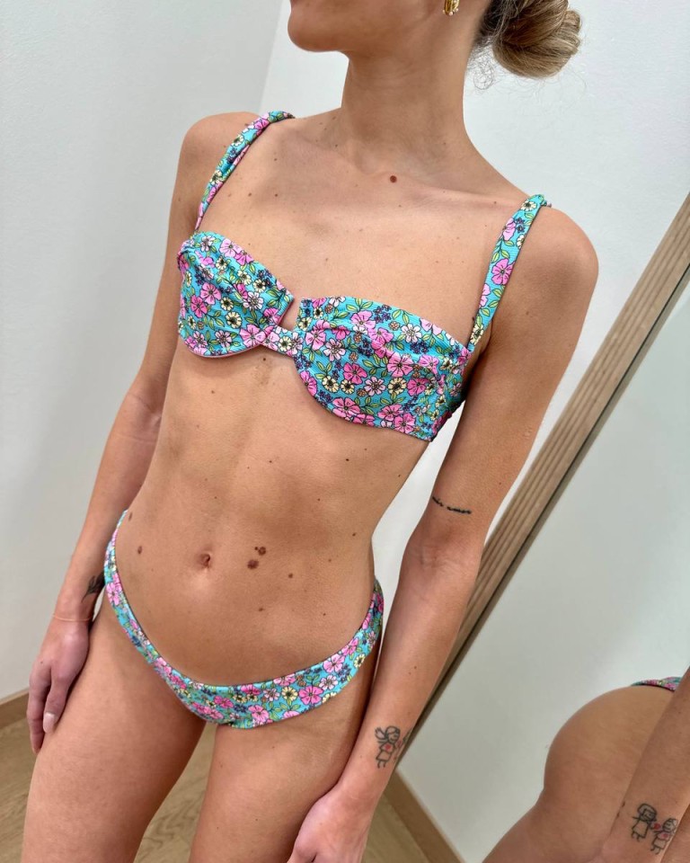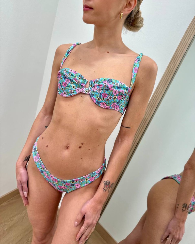 Bikini Adele turchese in fantasia a fiori multicolor, top con ferretto senza imbottitura, spalline regolabili e chiusura a clip sul retro, slip a brasiliana con taglio a V. Vestibilità regolare, se si oscilla tra due taglie consigliamo la taglia sopra.