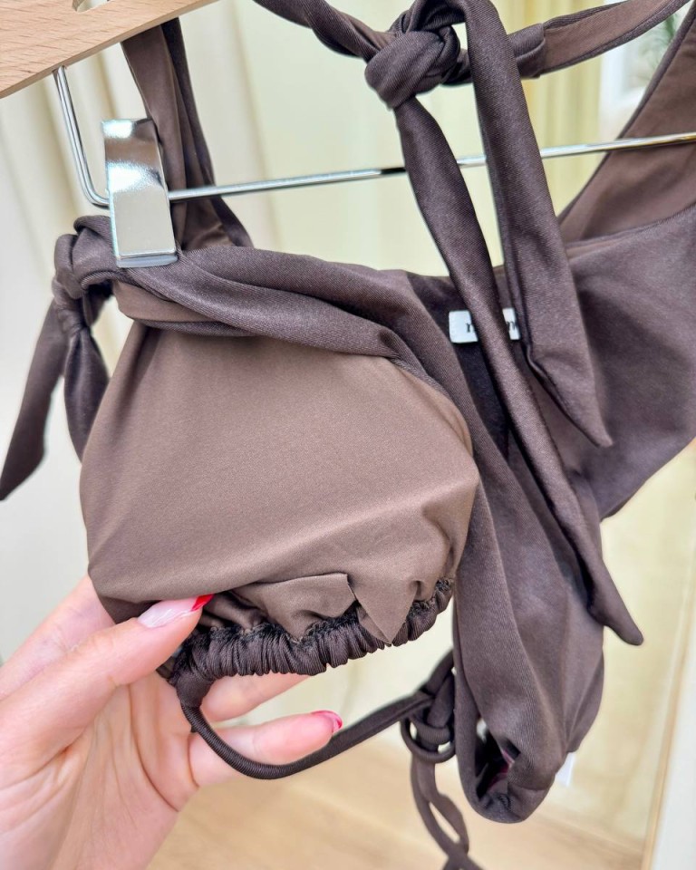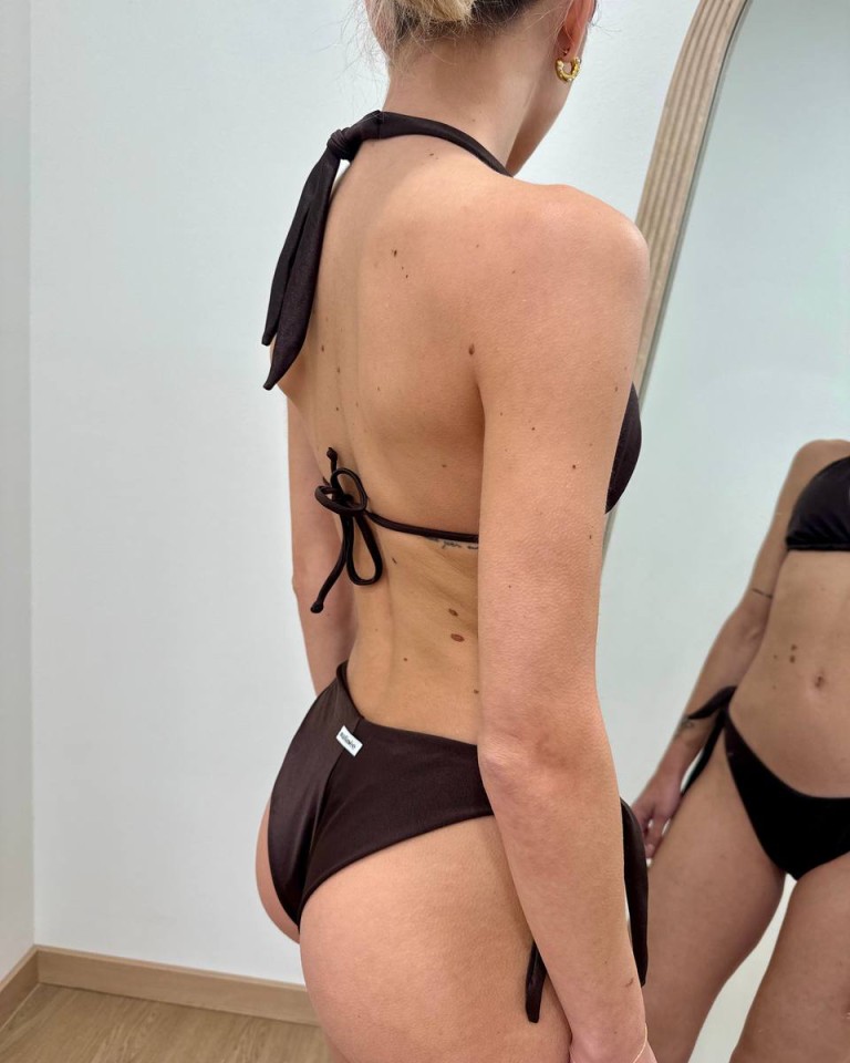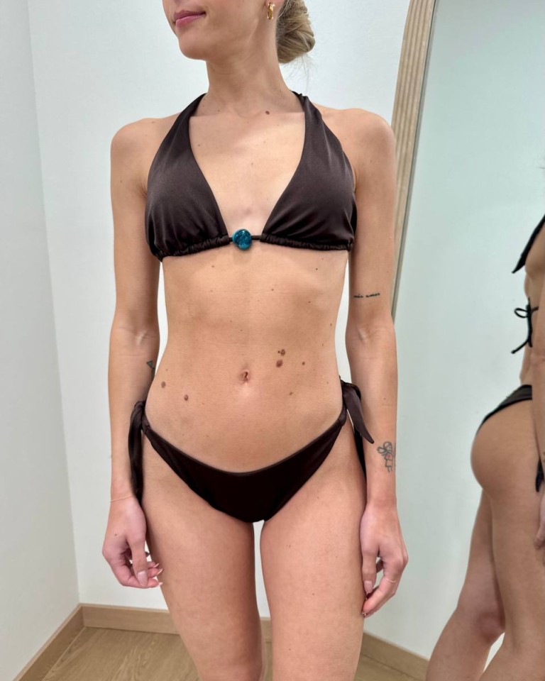 Bikini Benedetta lycra lucida seppia, top a a triangolo con pietra centrale a contrasto, imbottitura estraibile e chiusura con lacci regolabili, slip a brasiliana con laccetti laterali regolabili. Vestibilità regolare, se si oscilla tra due taglie consigliamo la taglia sopra.