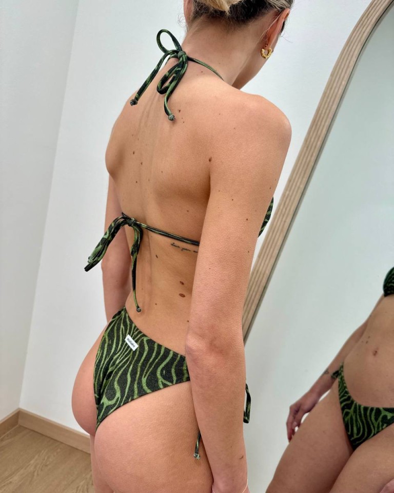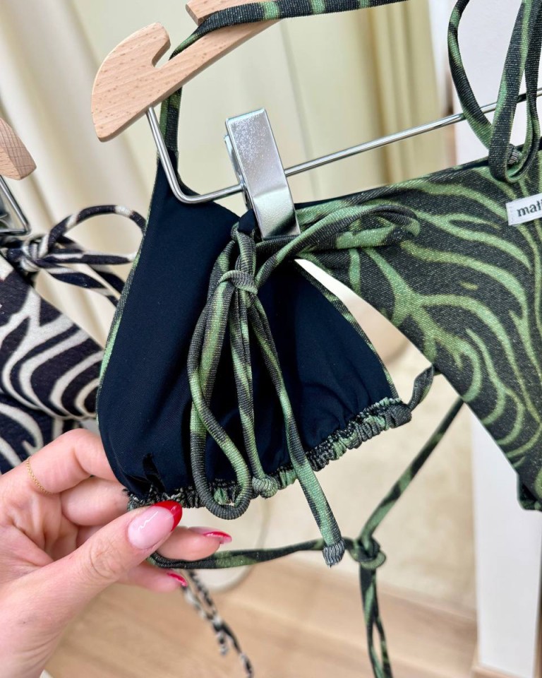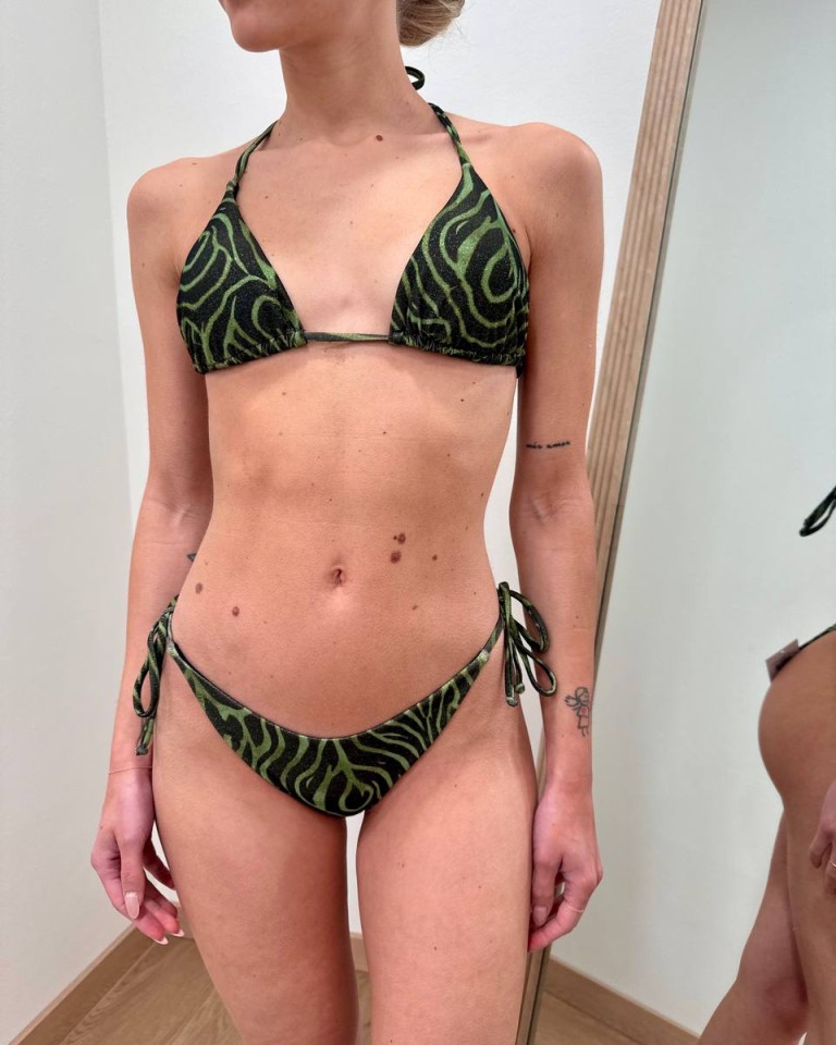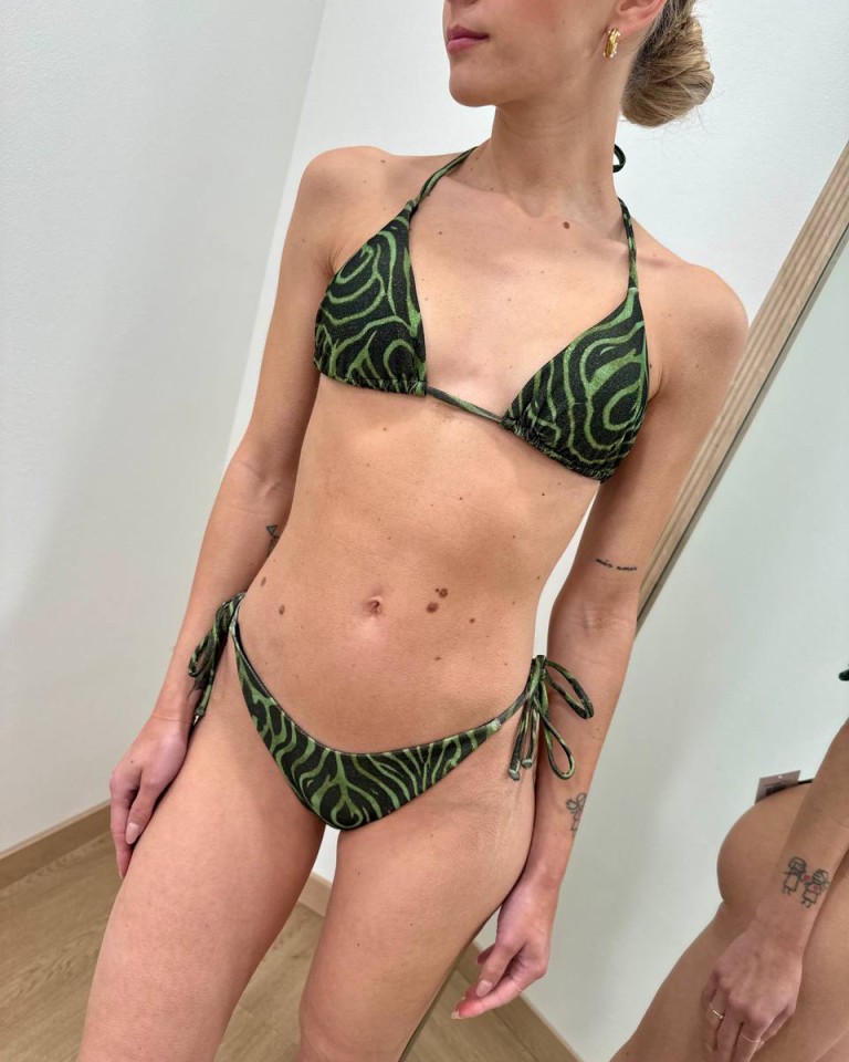 Bikini Kate in fantasia zebrata verde con lurex, top a triangolo con laccetti regolabili e coppe estraibili, slip sgambatura a brasiliana con laccetti laterali regolabili. Vestibilità regolare, se si oscilla tra due taglie consigliamo la taglia sopra.