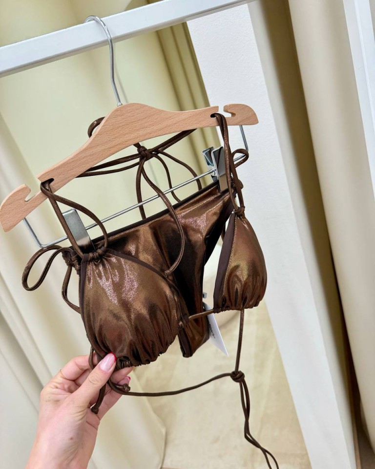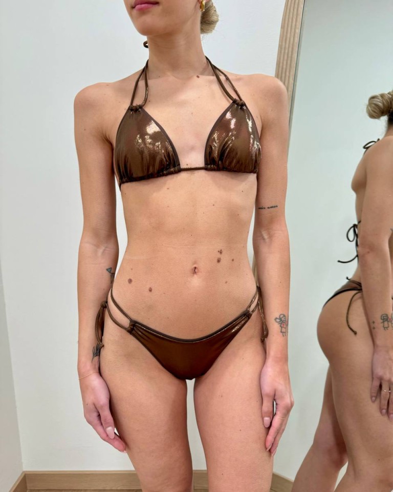 Bikini Pink in lycra lamè color marrone, top a triangolo con imbottitura estraibile e chiusura con lacci regolabili, slip sgambato con lacci laterali regolabili. Vestibilità regolare, se si oscilla tra due taglie consigliamo la taglia sopra.
