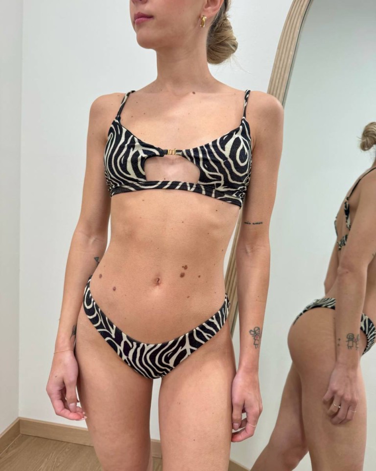 Bikini Taylor in fantasia zebrata bianca e moro con lurex, top a canotta con cutout frontale e logo in metallo dorato, spalline regolabili e imbottitura estraibile, chiusura a clip sul dietro, slip a brasiliana con taglio a V. Vestibilità regolare, se si oscilla tra due taglie consigliamo la taglia sopra.