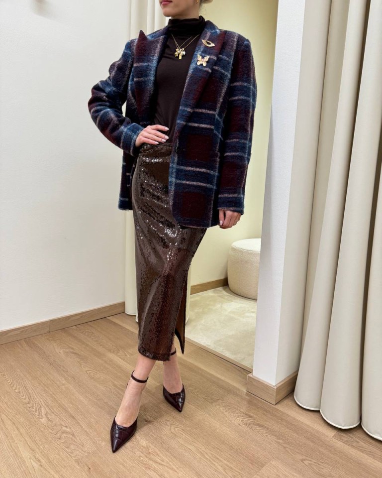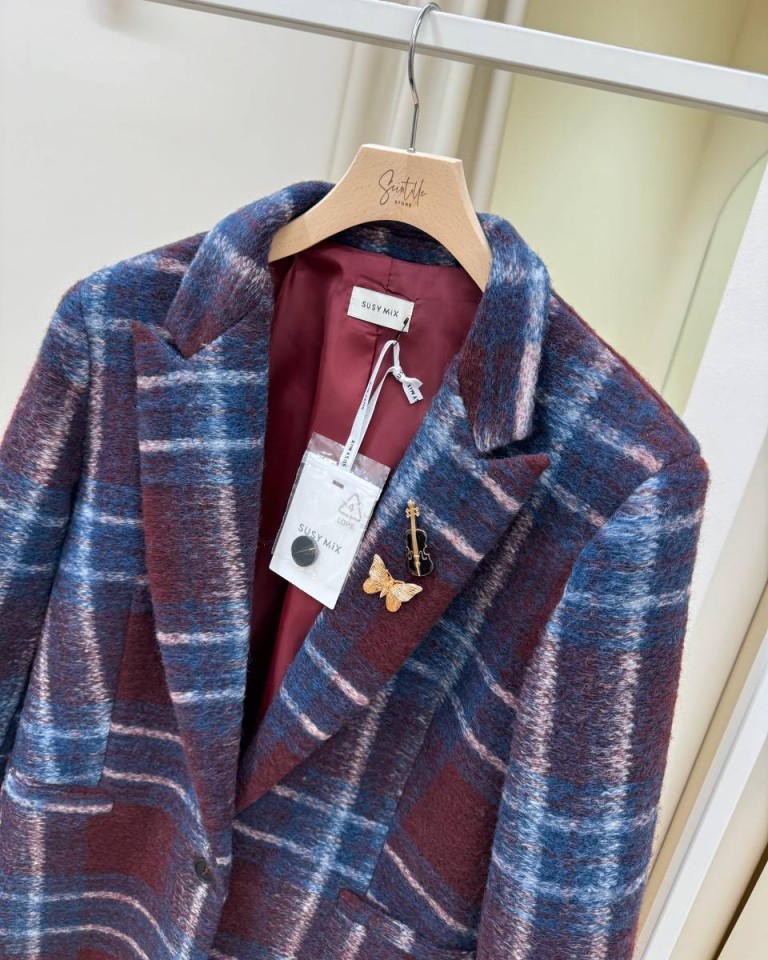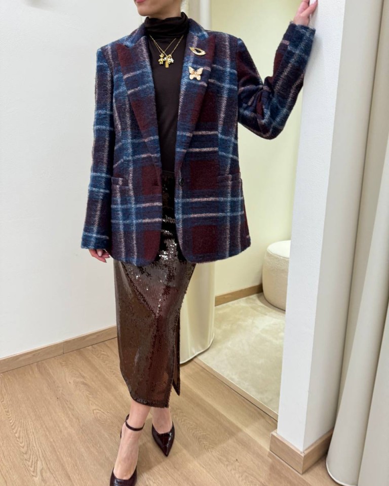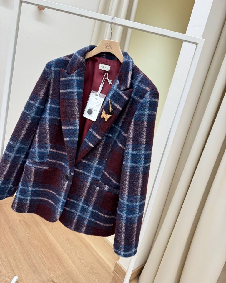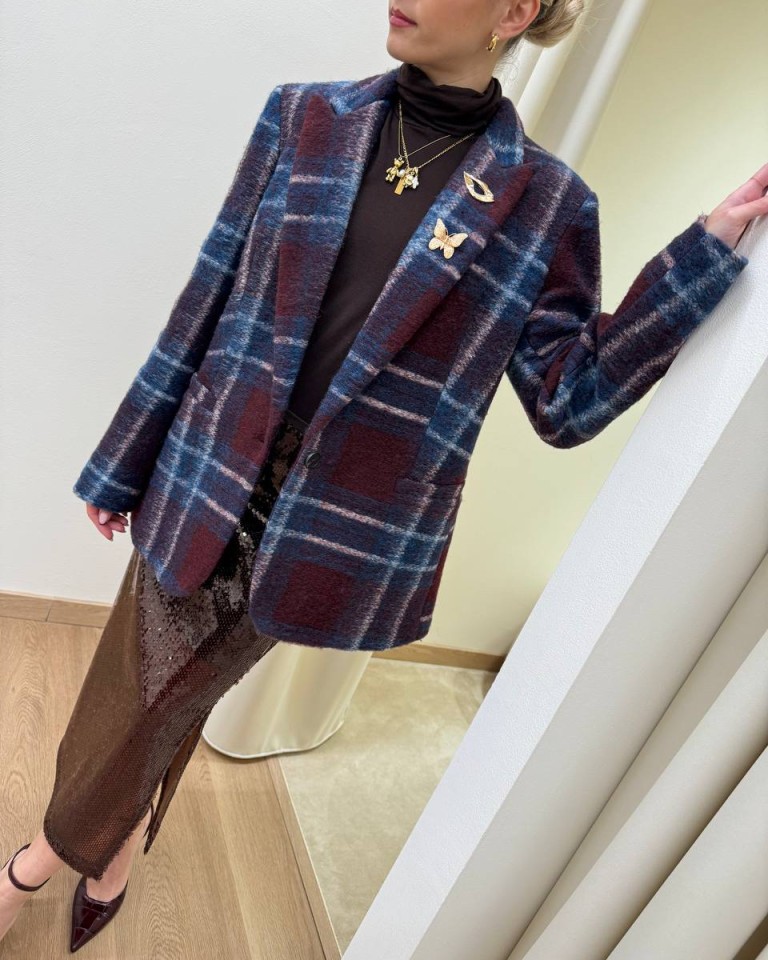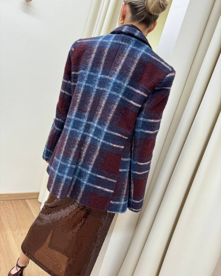 Blazer check blu e bordeaux con lana pettinata e foderata all’interno. Modello over con rever a lancia e spille, tasche a filetto e spacco dietro. Vestibilità ampia.