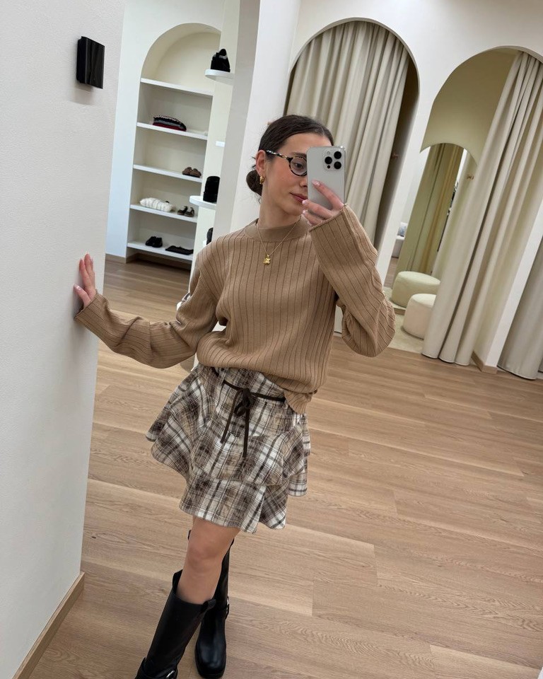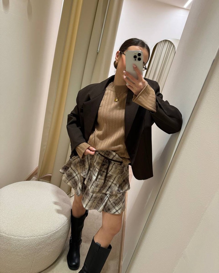 Un mix equilibrato tra tailoring e femminilità. Il blazer moro oversize dona struttura e carattere, abbinato a un maglione beige a coste dal gusto minimal. La gonna corta a quadri aggiunge un tocco trendy e dinamico, mentre gli stivali neri completano il look con personalità. Ideale per un daily look urbano e sofisticato.