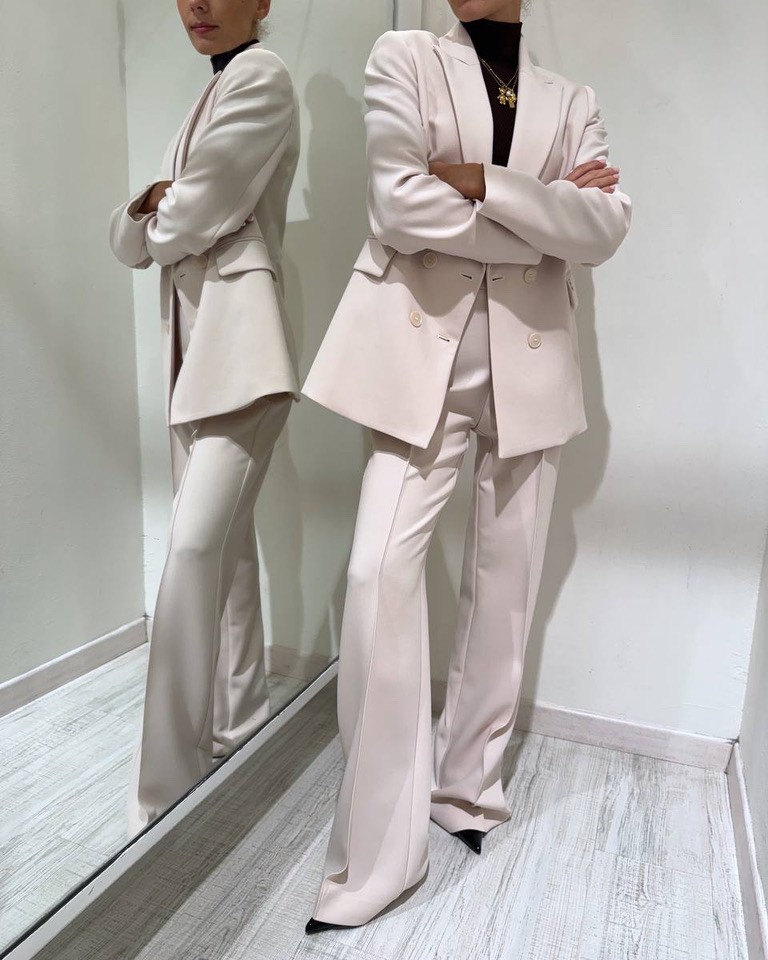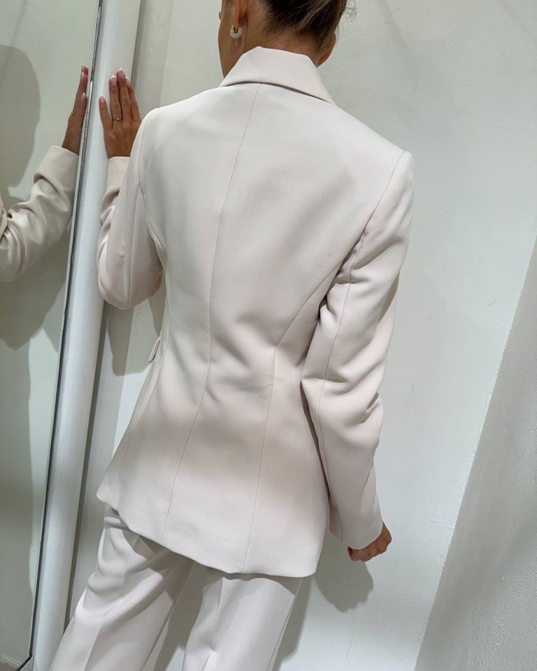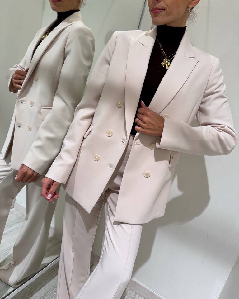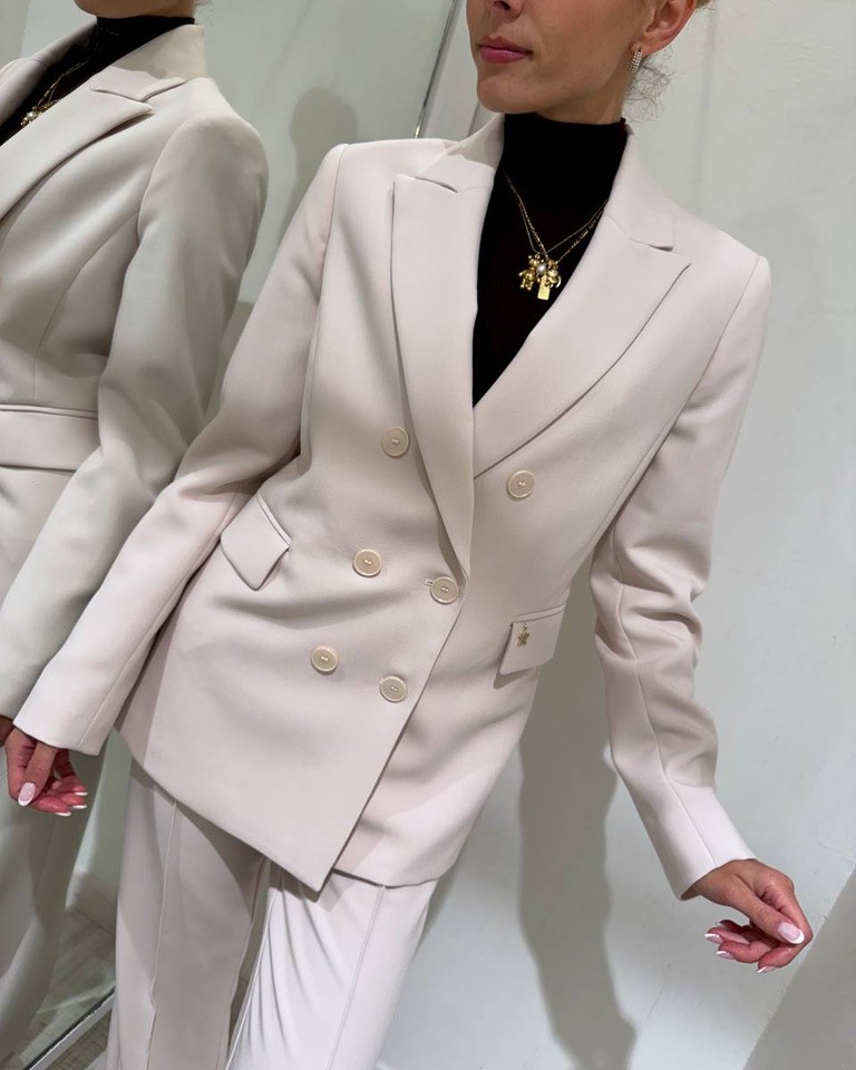 Blazer crema foderato all’interno, modello maniche lunghe, collo a revers e chiusura frontale doppiopetto. Tasche laterali con patta. Vestibilità regolare.