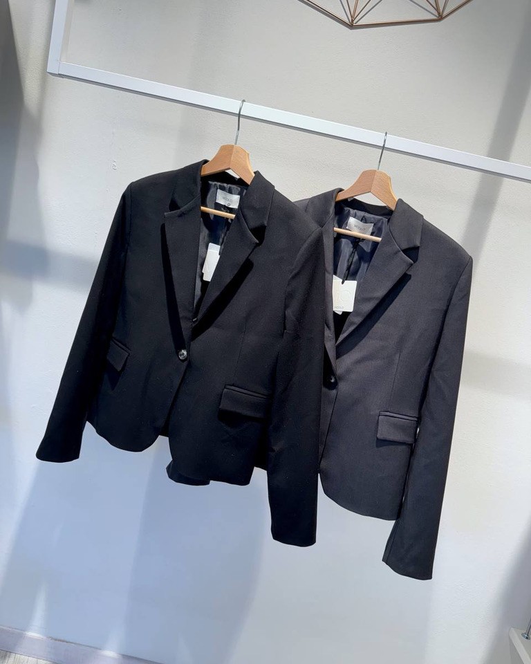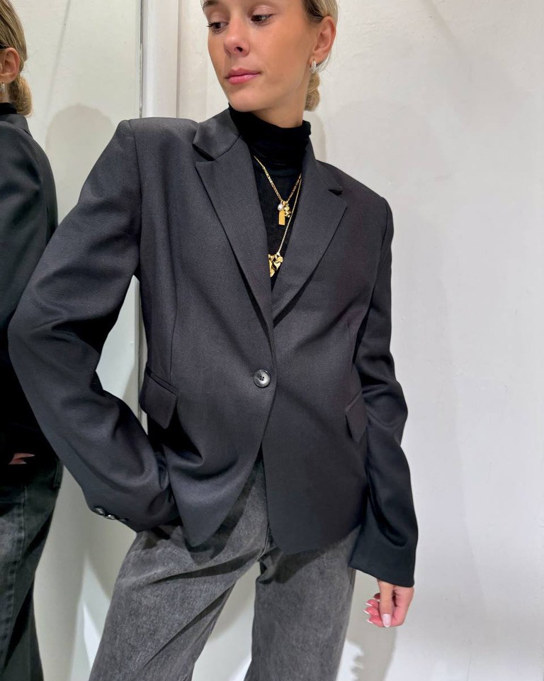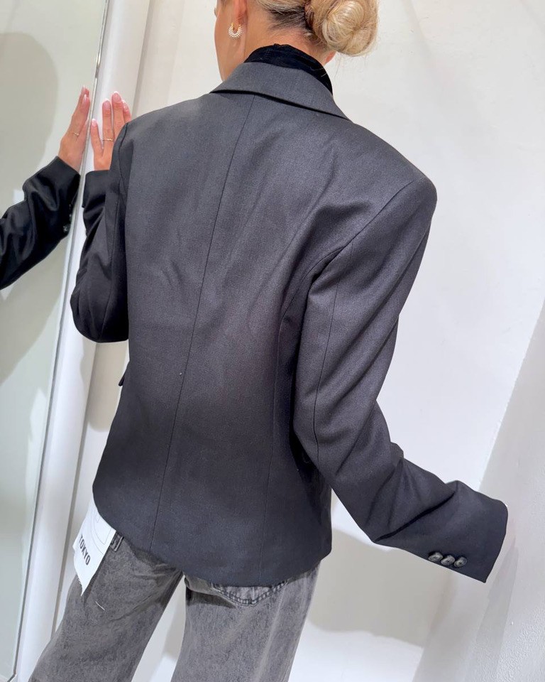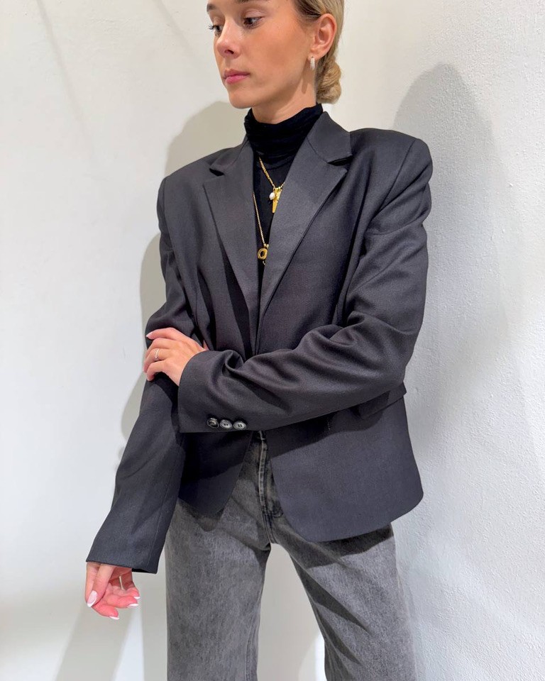 Blazer antracite, modello corto, maniche lunghe, collo a revers e chiusura monopetto un bottoni. Tasche laterali con patta. Vestibilità ampia.