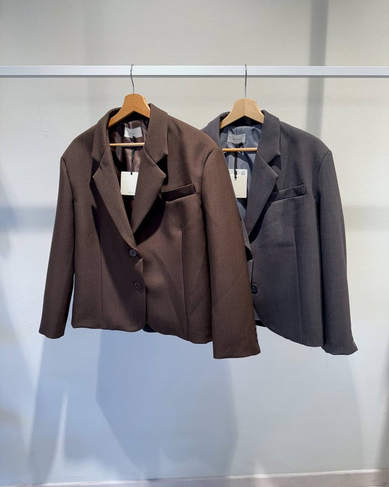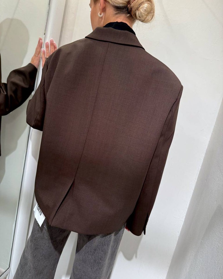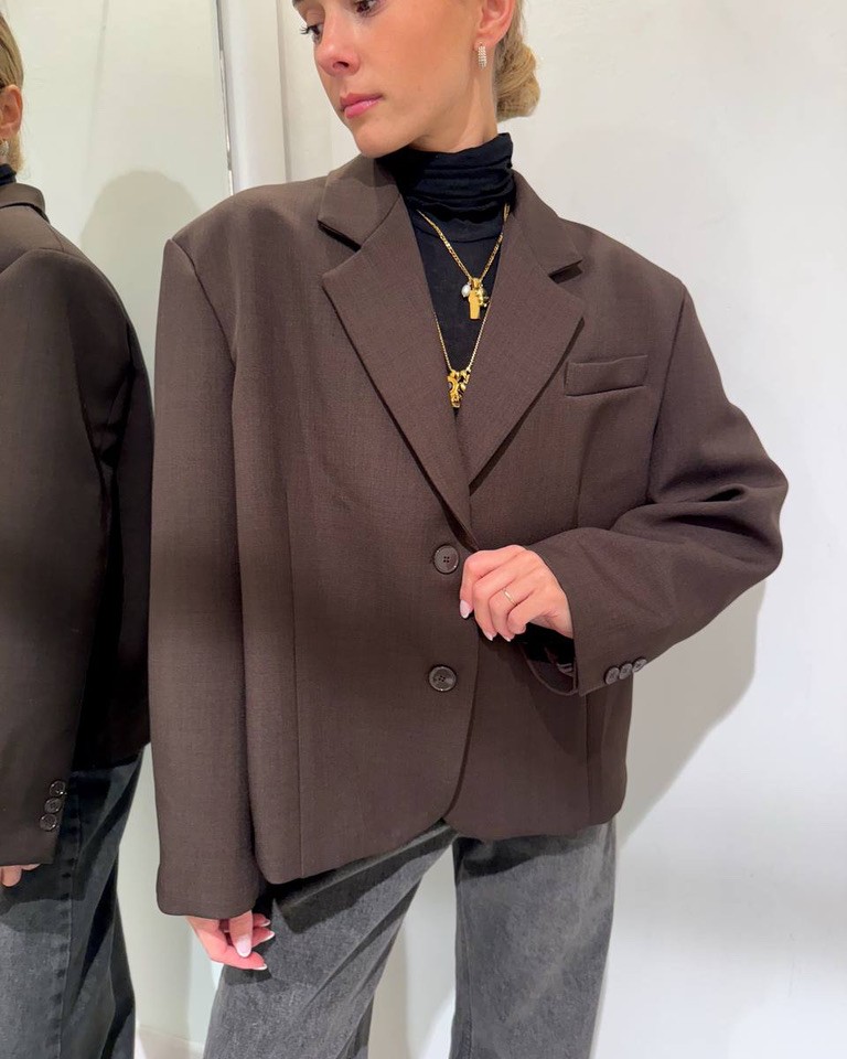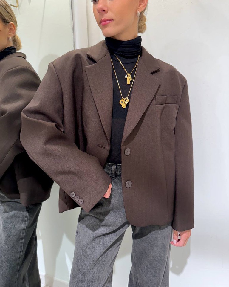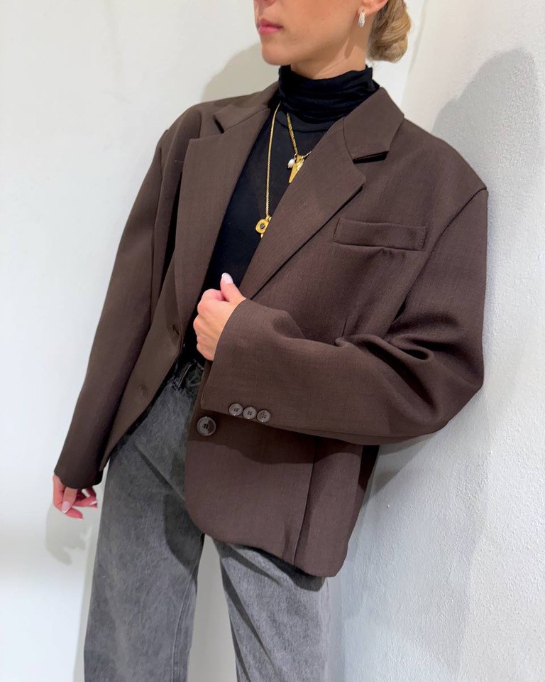 Blazer moro, modello corto oversize, maniche lunghe, collo a revers e chiusura monopetto due bottoni. Taschina laterale a filetto. Vestibilità ampia.