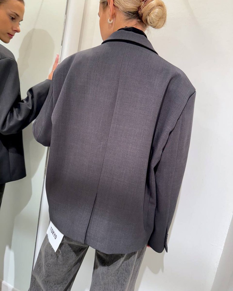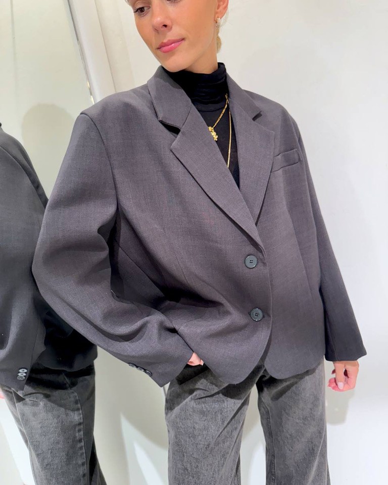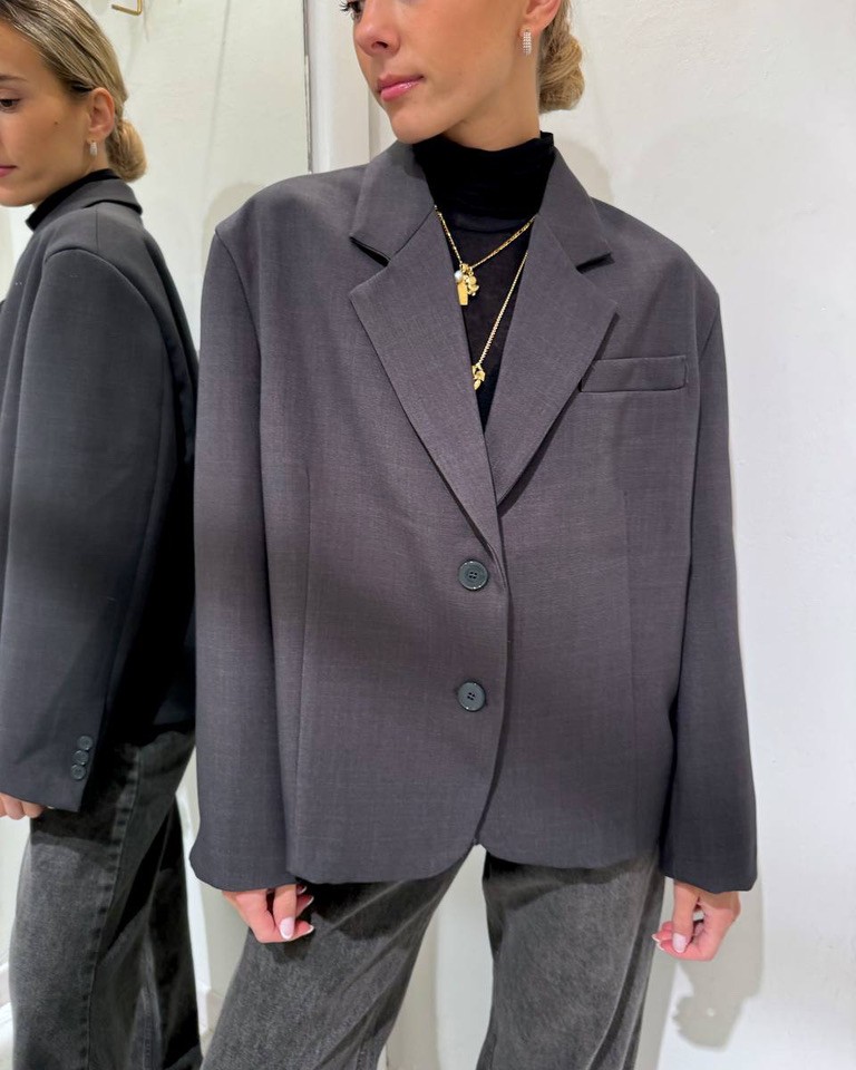 Blazer antracite, modello corto oversize, maniche lunghe, collo a revers e chiusura monopetto due bottoni. Taschina laterale a filetto. Vestibilità ampia.