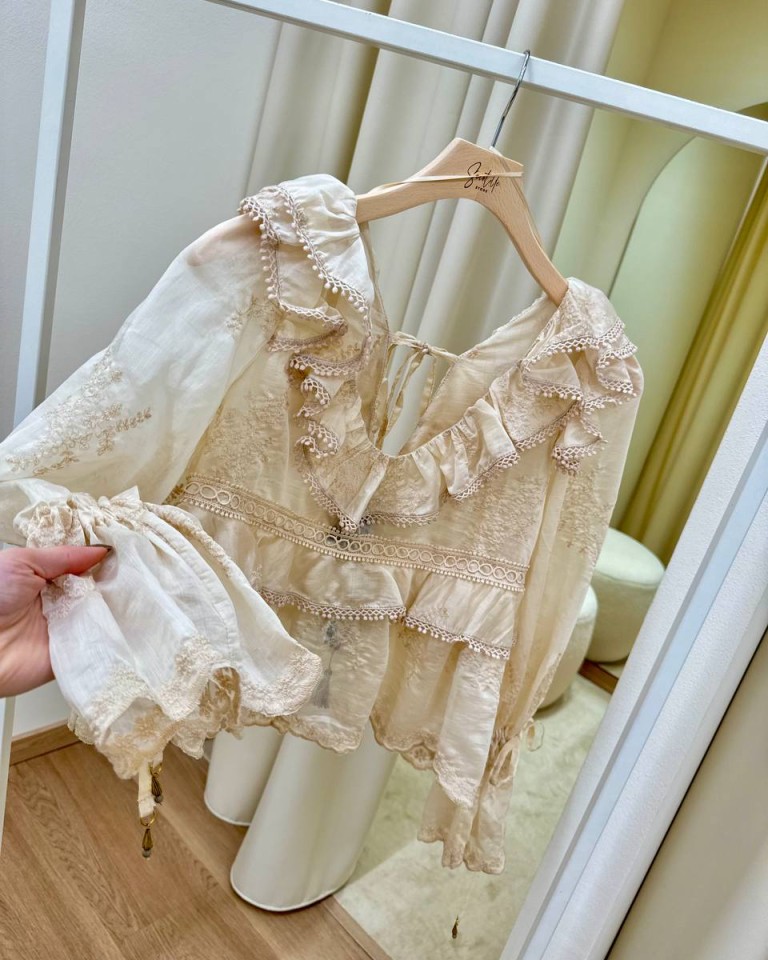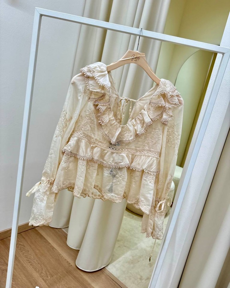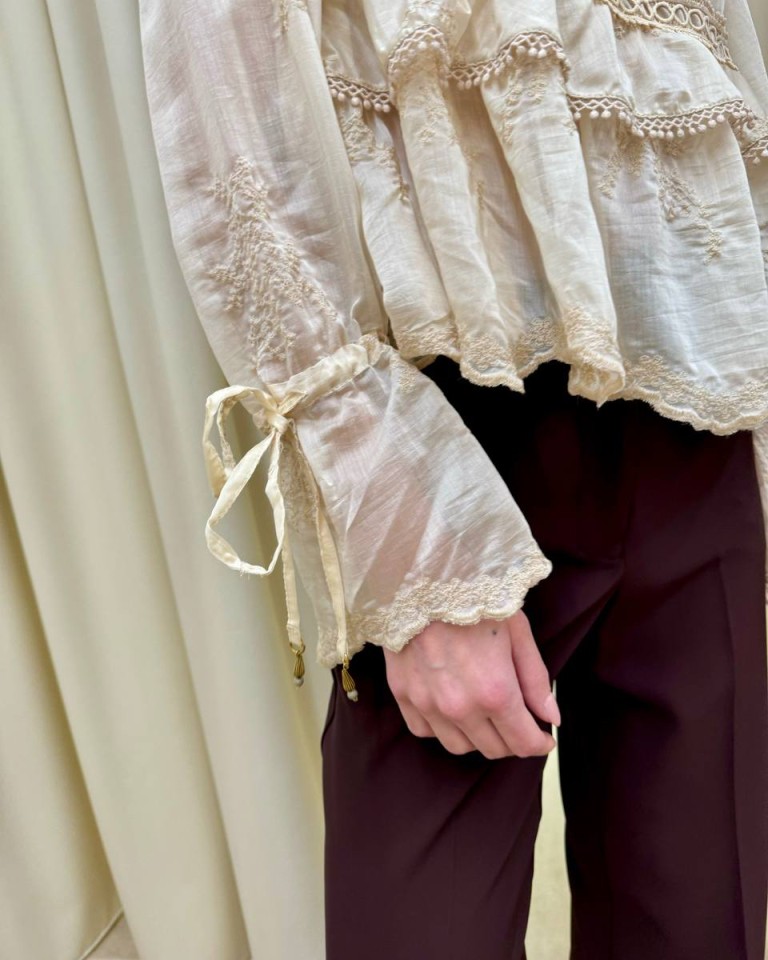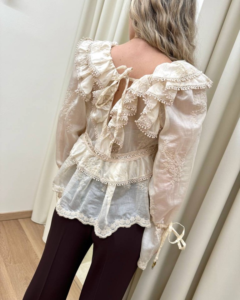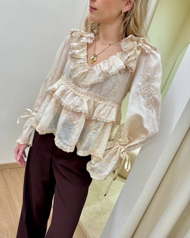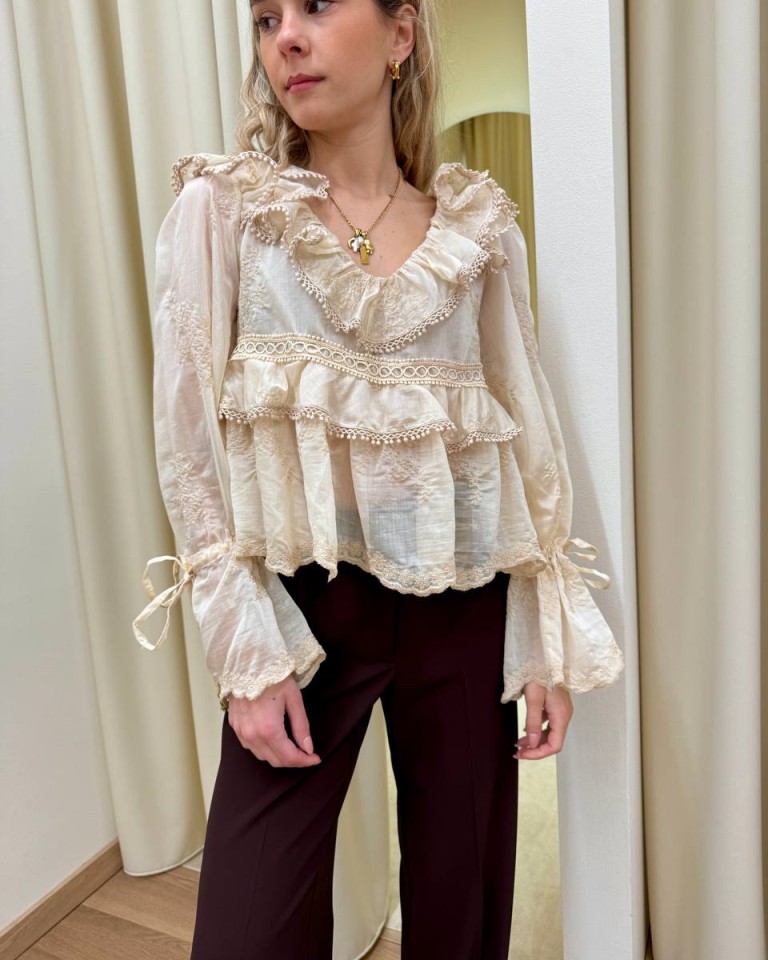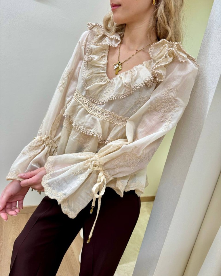 Blusa color burro con ricami, modello svasato con balze e rouches, scollo a v con nastro sul dietro, maniche lunghe con fondo a campana e coulisse regolabile con nastro. Vestibilità ampia.