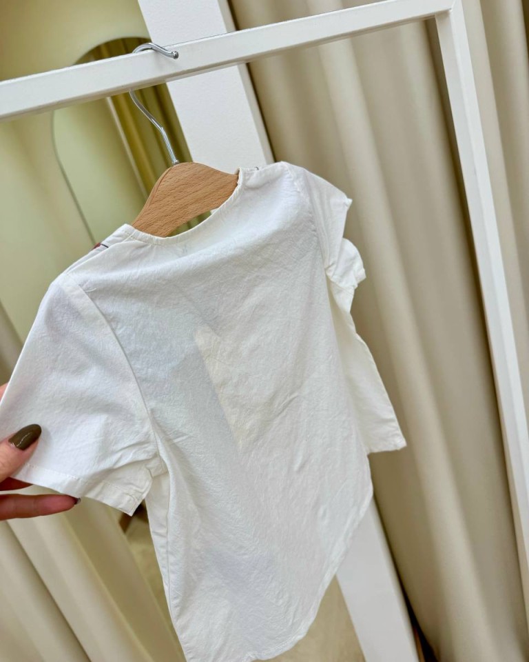 Blusa in cotone color burro con pieghette e ricamo floreale sul davanti. Modello dritto, mezze maniche e scollo squadrato, chiusura davanti con bottoncini in legno. Vestibilita regolare.