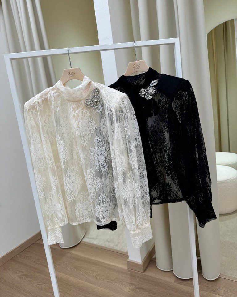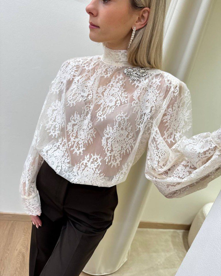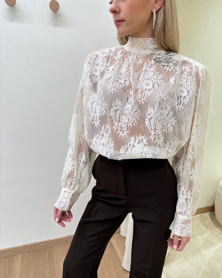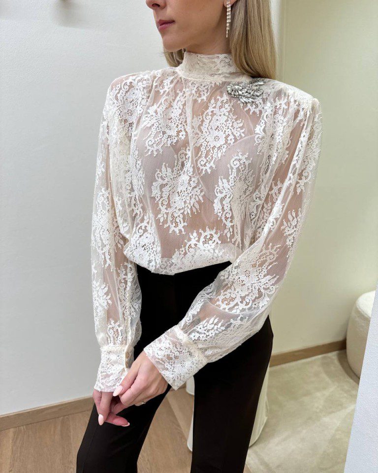 Blusa burro in pizzo, modello maniche lunghe con spalline imbottite, collo alto e dettaglio cabochon latrale. Chiusura con fiocco regolabile sul dietro. Vestibilità regolare.