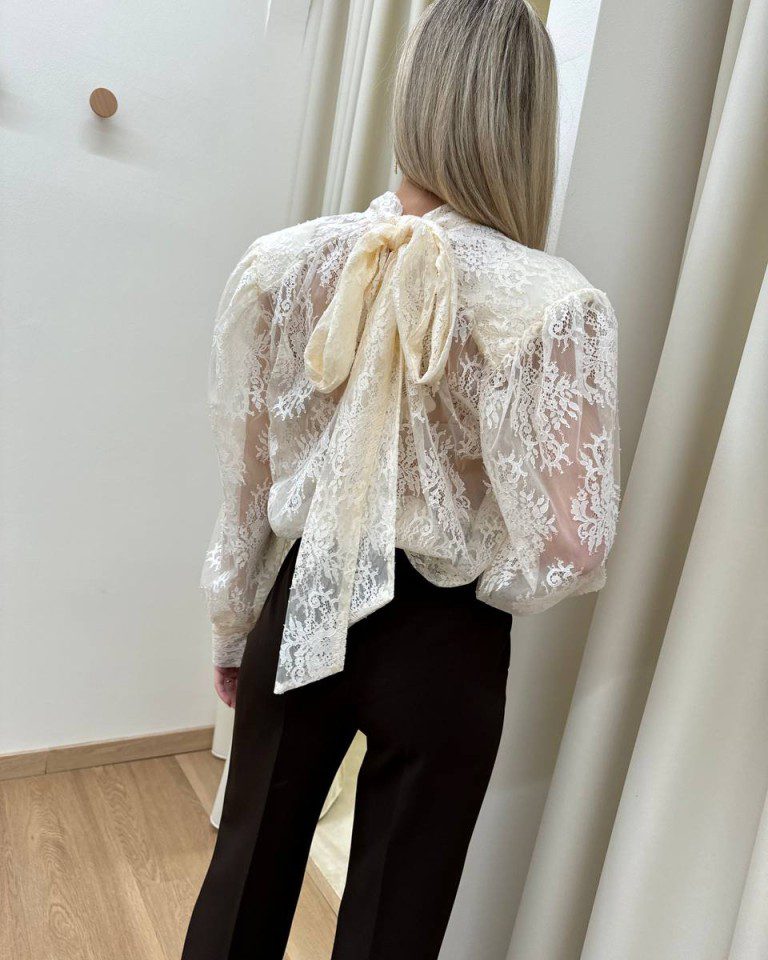 Blusa in pizzo burro dettaglio cabochon e fiocco dietro Kontatto