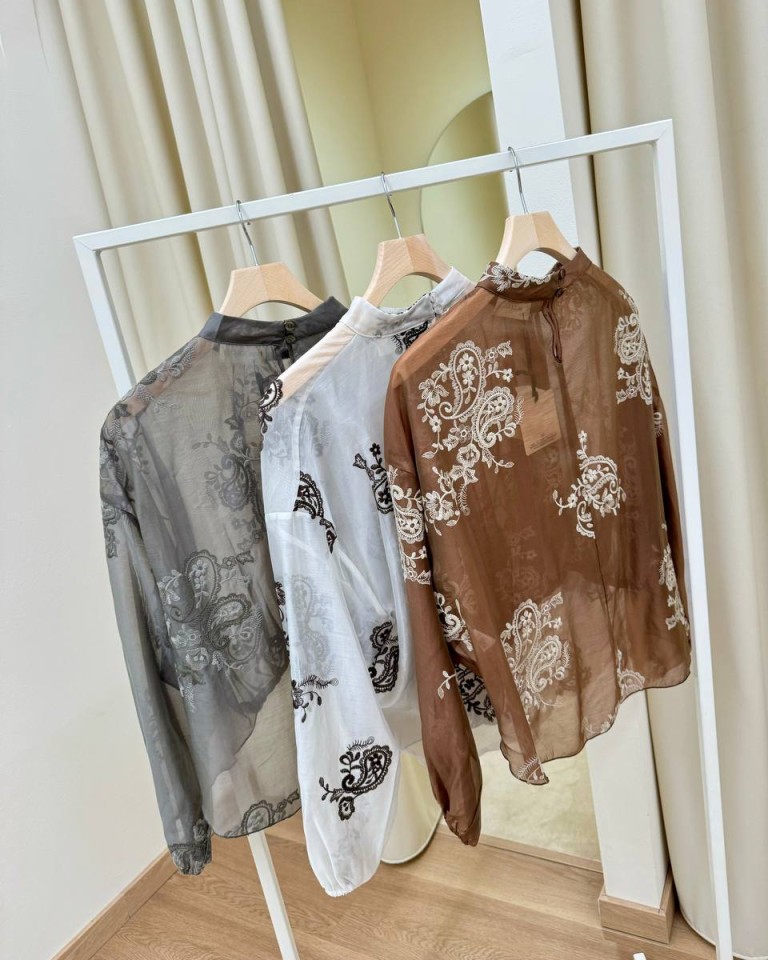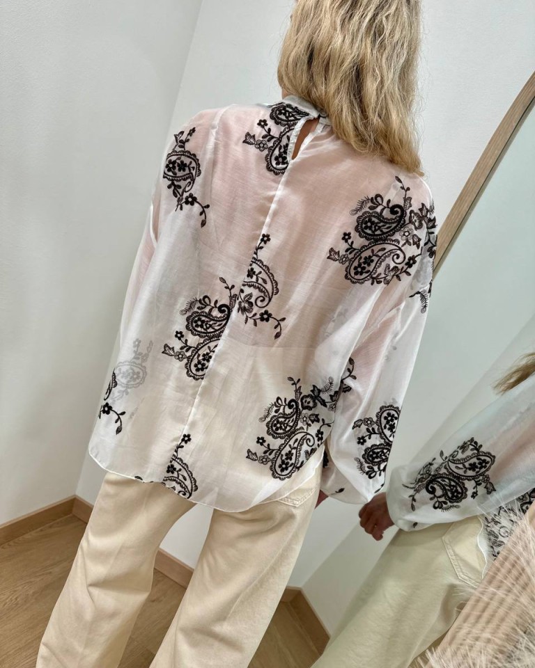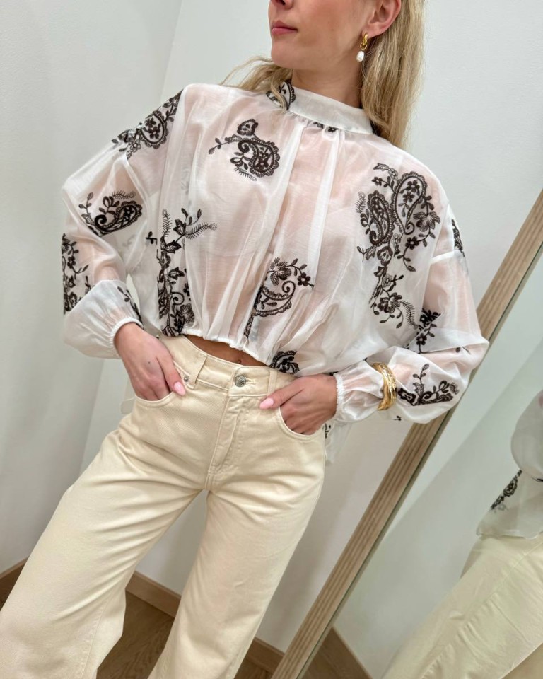 Blusa semitrasparente color panna con ricami floreali moro, modello over, piu corto davanti con arricciatura in vita, collo coreana con chiusura sul dietro con bottoncini, maniche lunghe a sbuffo con elastico sul polso. Vestibilità ampia.