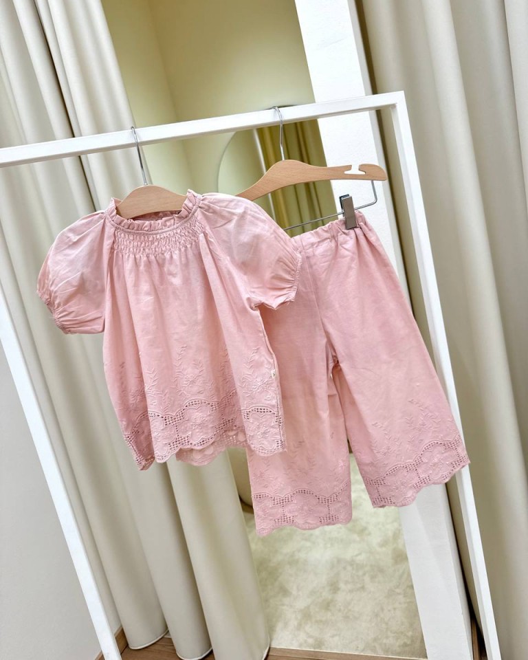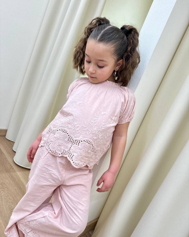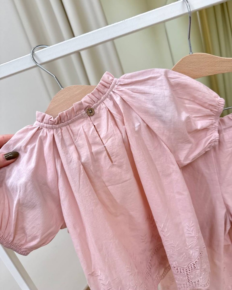 Blusa color rosa cipria, modello dritto, girocollo arricciato con rouches, manica raglan, corta a palloncino e orlo con motivo floreale in pizzo san gallo e ricami. Chiusura sul collo dietro con bottone. Vestibilità regolare.