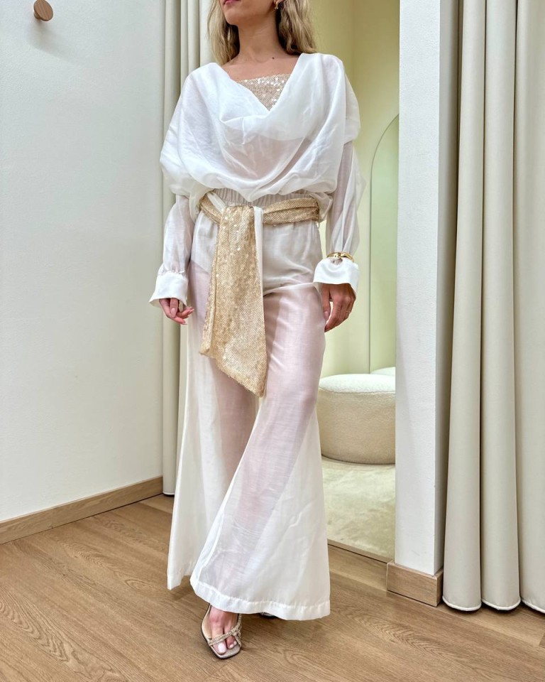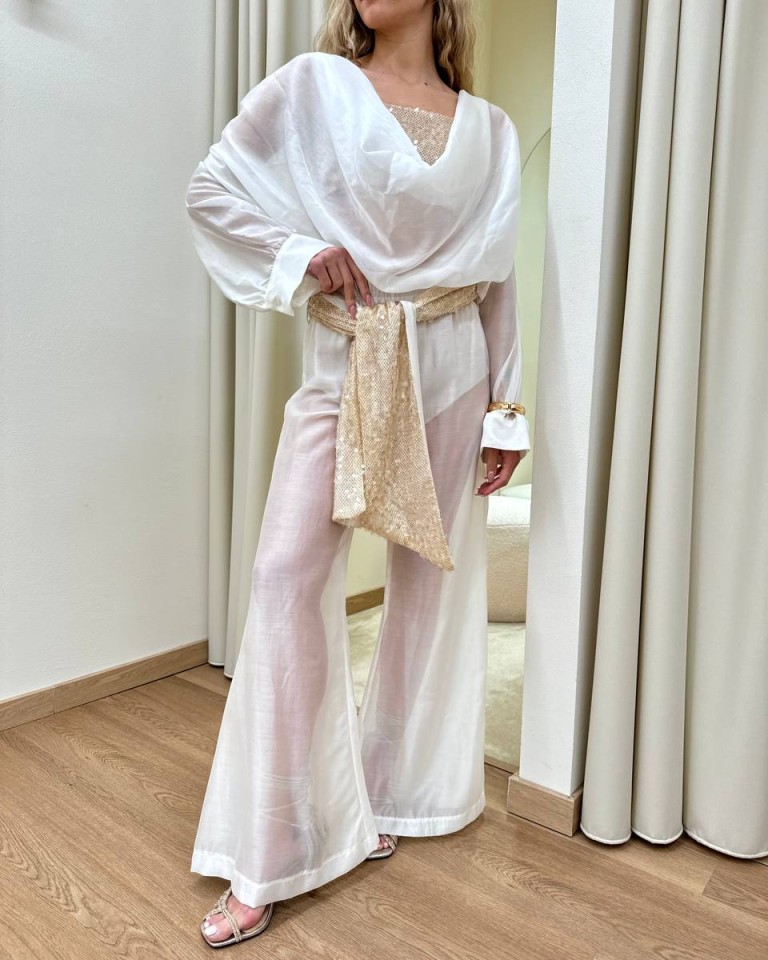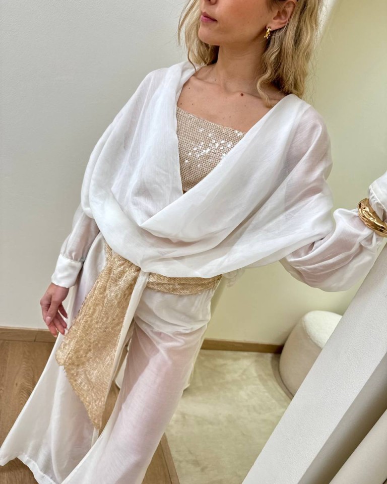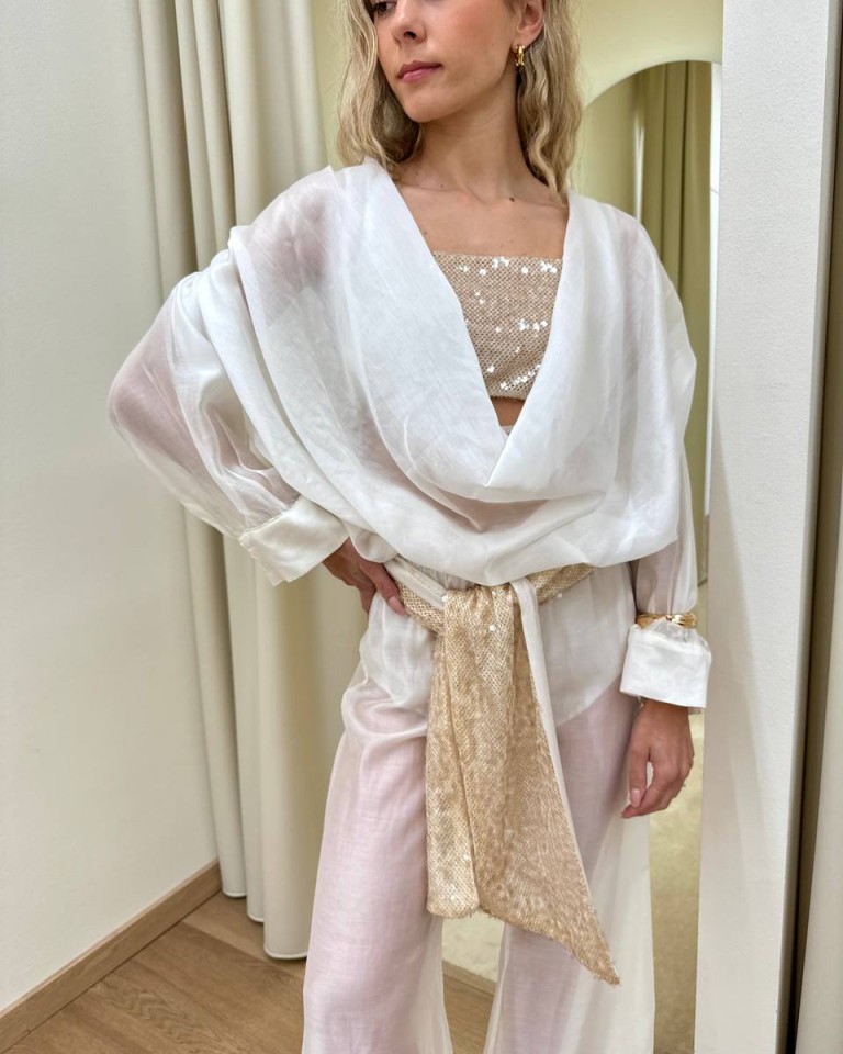 Blusa semitrasparente bianca, modello over con scollo profondo a gronda, maniche lunghe scese con spalle arricciate, top a fascia in paillettese beige abbinato con spalline regolabili, blusa e top sono due pezzi separati. Vestibilità ampia.