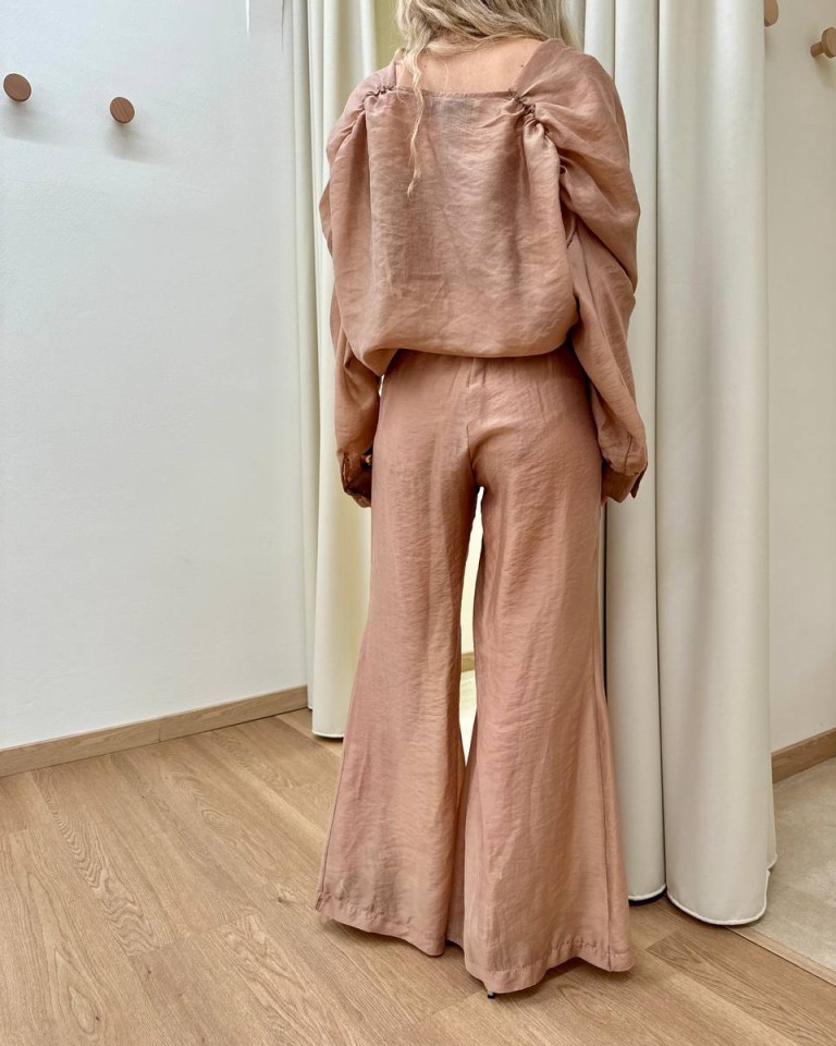 Blusa semitrasparente color nocciola, modello over con scollo profondo a gronda, maniche lunghe scese con spalle arricciate, top a fascia in paillettese abbinato con spalline regolabili, blusa e top sono due pezzi separati. Vestibilità ampia.