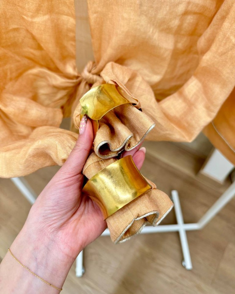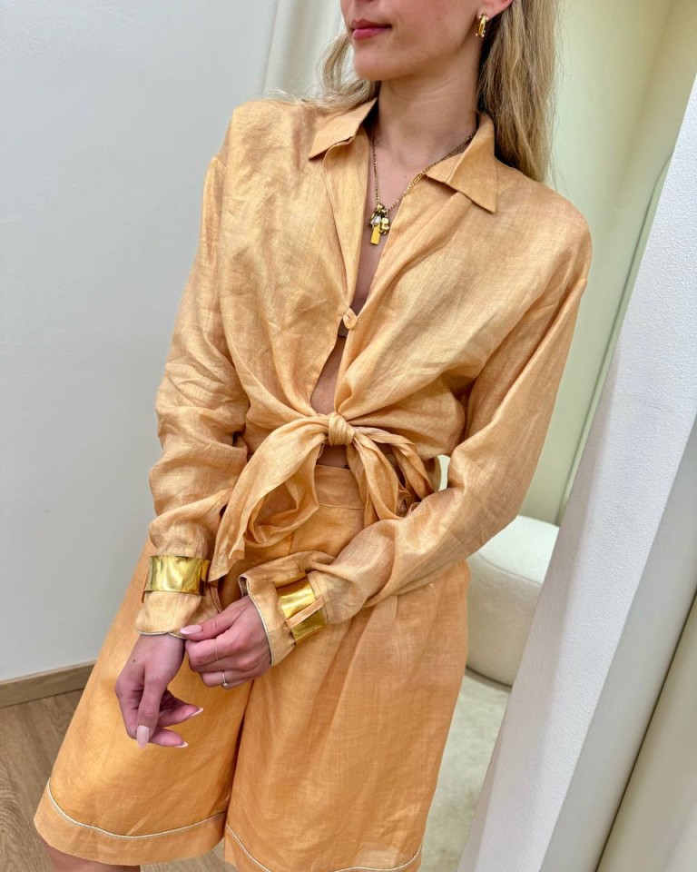 Blusa semitrasparente color albicocca con leggero effetto laminato oro. Modello over, corto, giro sceso e manica lunga con bracciali dorati ai polsi rimovibili, chiusura davanti con bottone e nodo in vita. Vestibilità ampia.