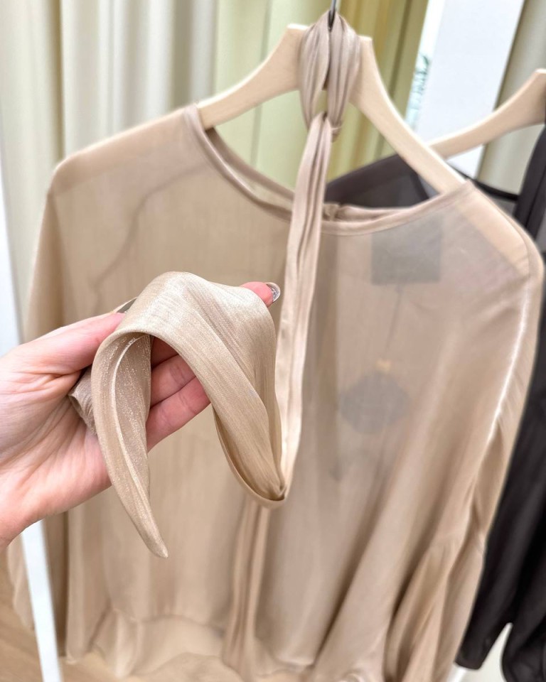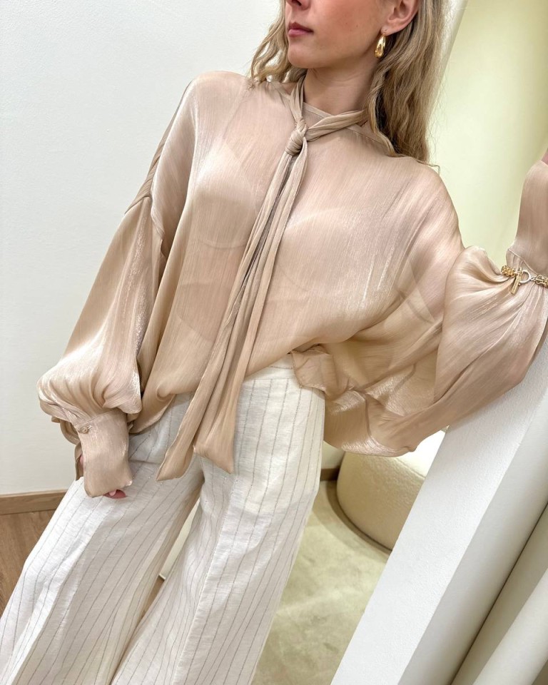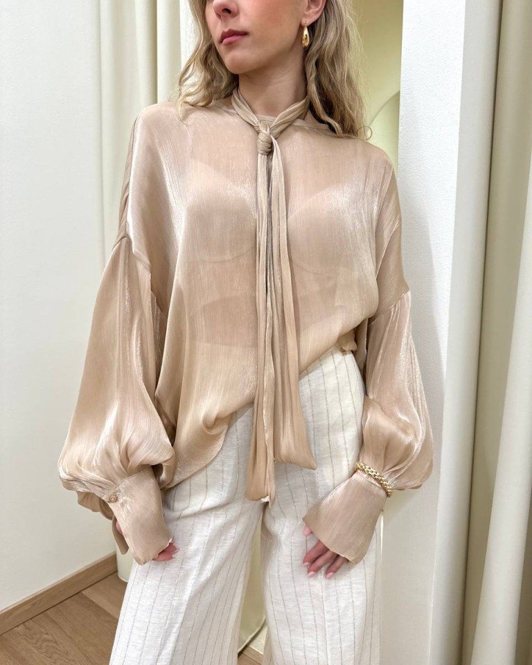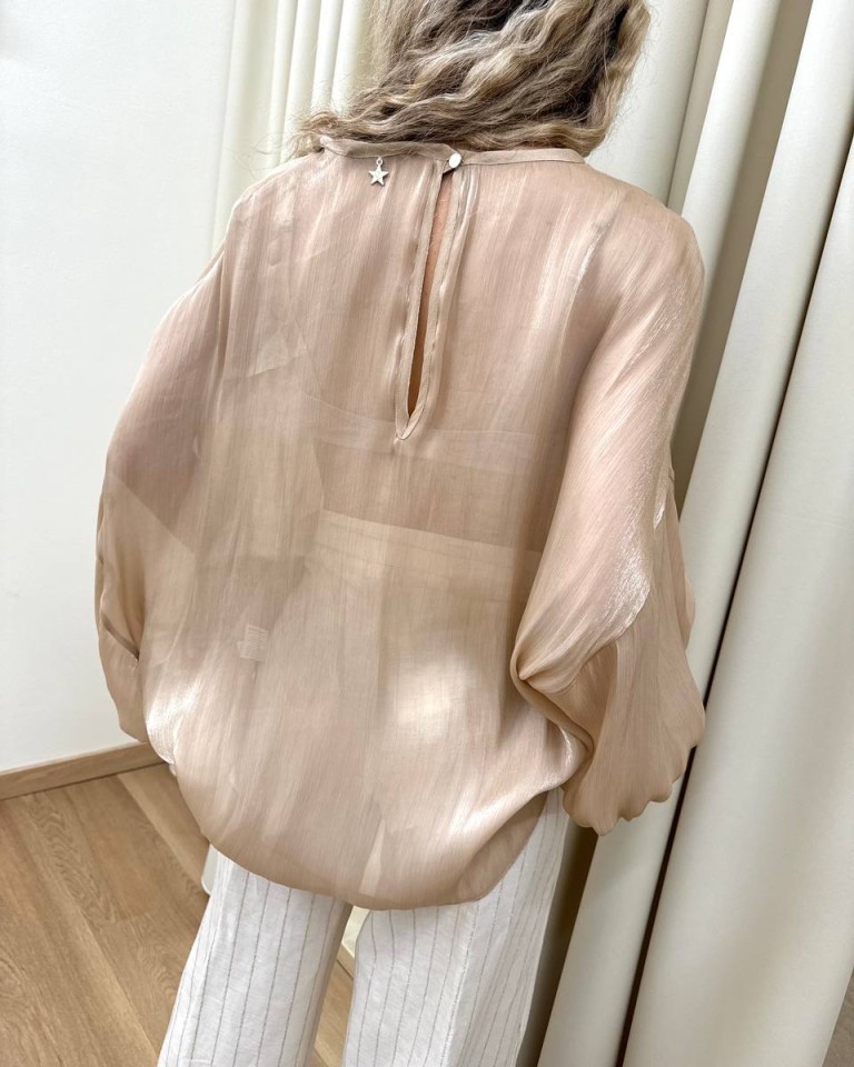 Blusa color oro in tessuto lucido semitrasparente, modello over, maniche ampie a pipistrello con polsini, girocollo con scollo a goccia dietro e fusciacca abbinata. Vestibilità ampia.