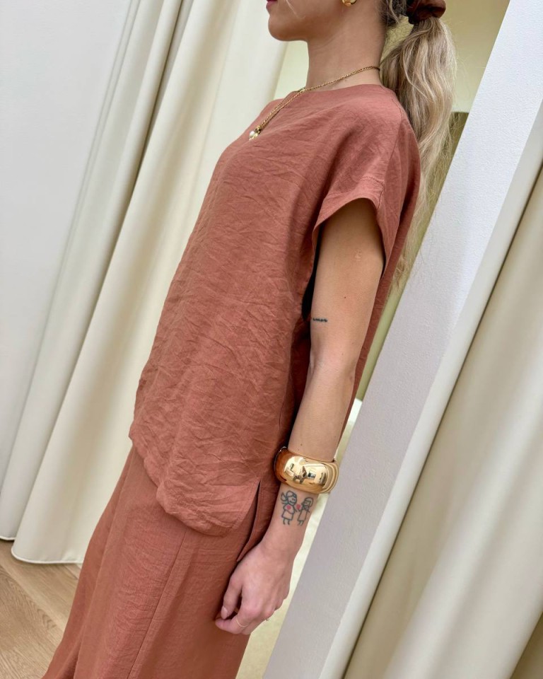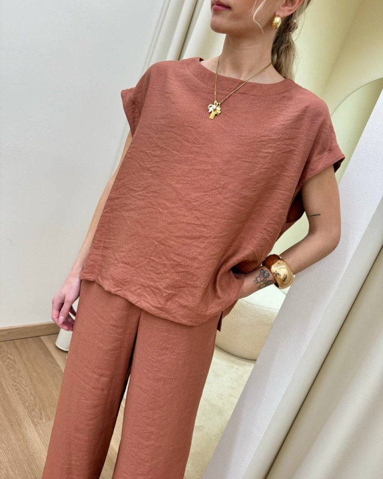Maglia color rame, modello a scatoletta smanicato, girocollo, spacchetti laterali, davanti leggermente più corto del dietro. Vestibilità ampia.