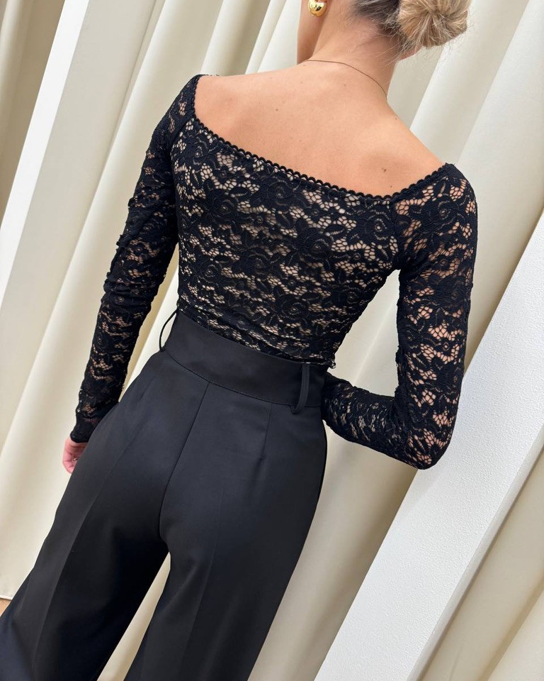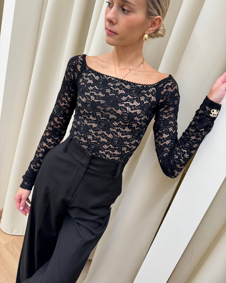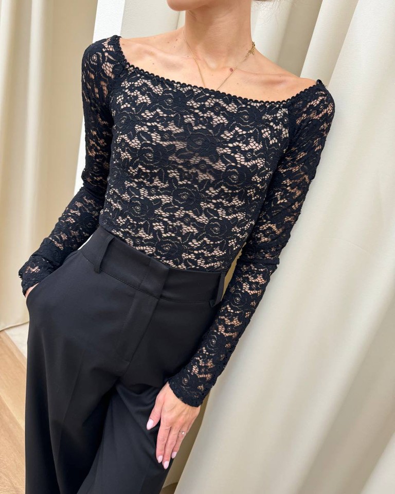 Body nero in pizzo foderato all’interno nude, modello scollo barca, maniche lunghe e chiusura con bottoncini. Vestibilità piccola e aderente.