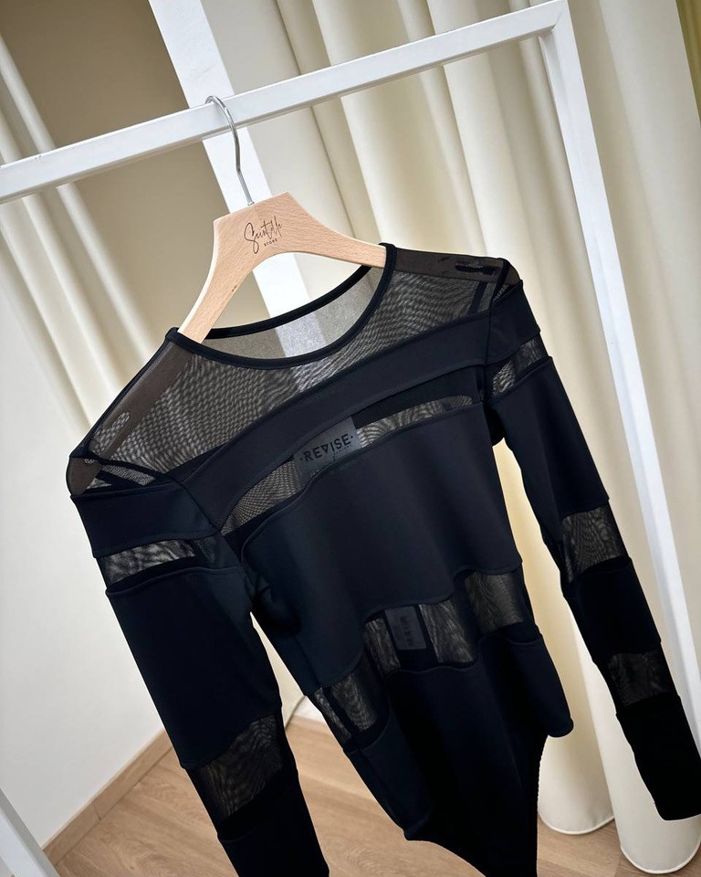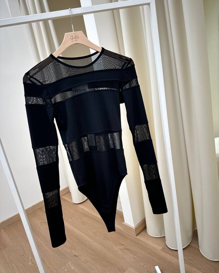 Body nero in tulle combinato, modello girocollo con maniche lunghe con asole e chiusura con bottoncini. Vestibilità aderente.
