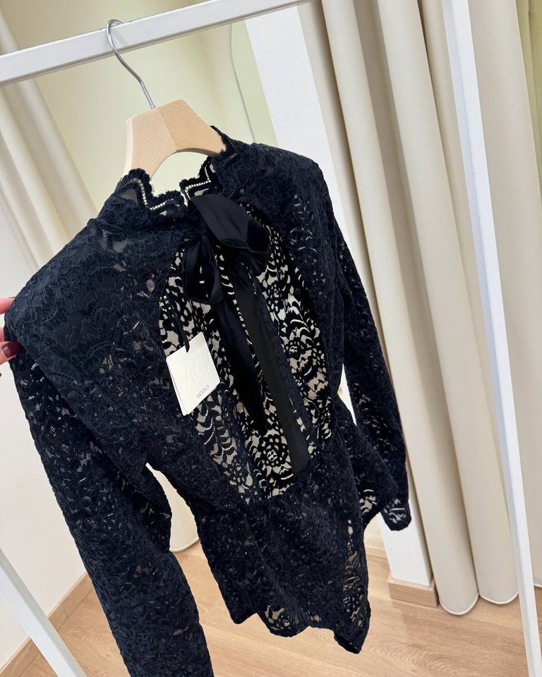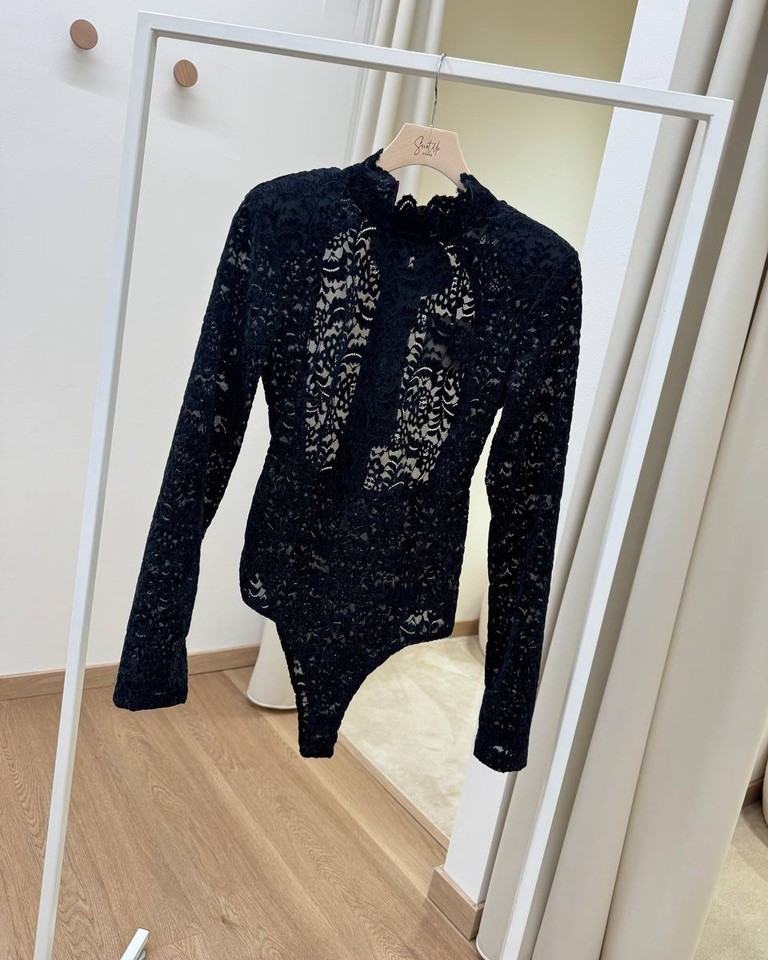Body nero in pizzo di velluto, modello con collo alto, maniche lunghe, spalline imbottite e profondo scollo sulla schiena con fiocco al collo in raso nero. Chiusura sullo slip con bottoni automatici. Vestibilità aderente.