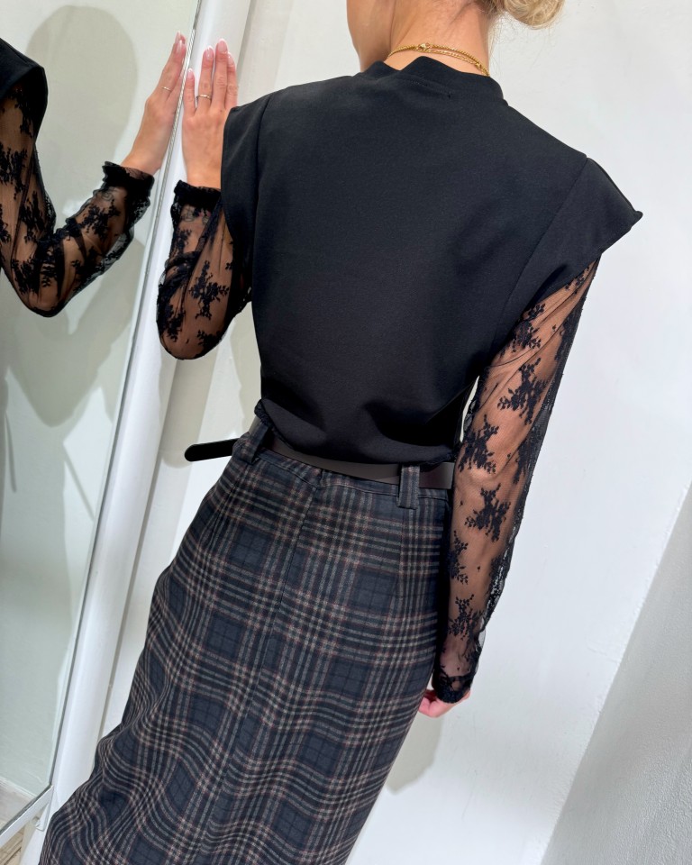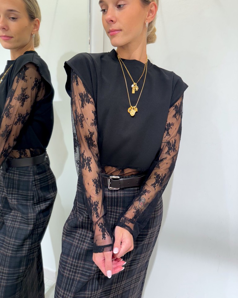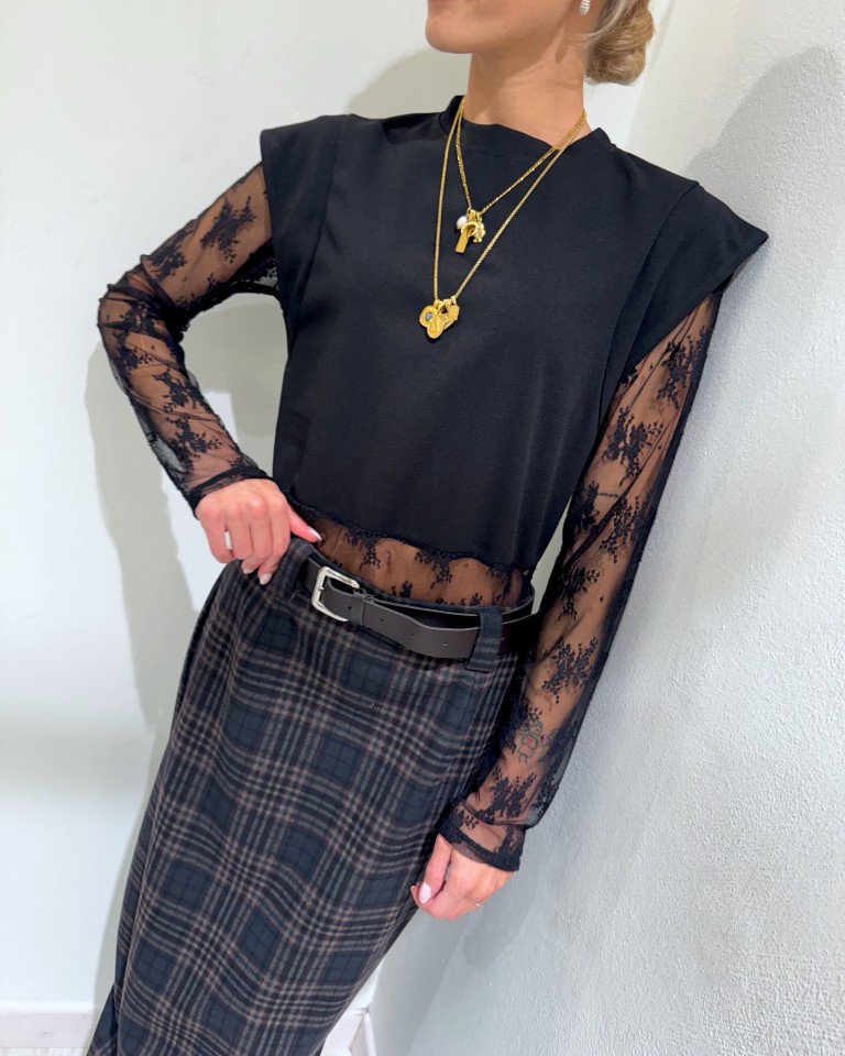 Body nero combinato, con maniche e fondo in pizzo. T-shirt attaccata smanicata con giro ampio. Vestibilità regolare. Con bottoncini sotto.