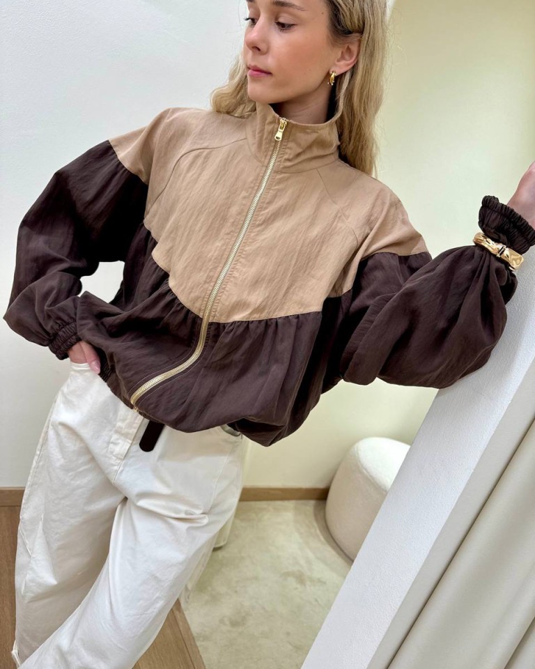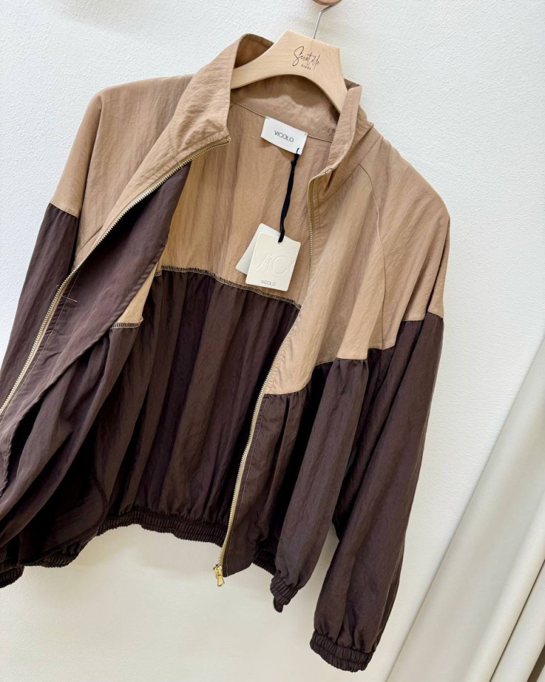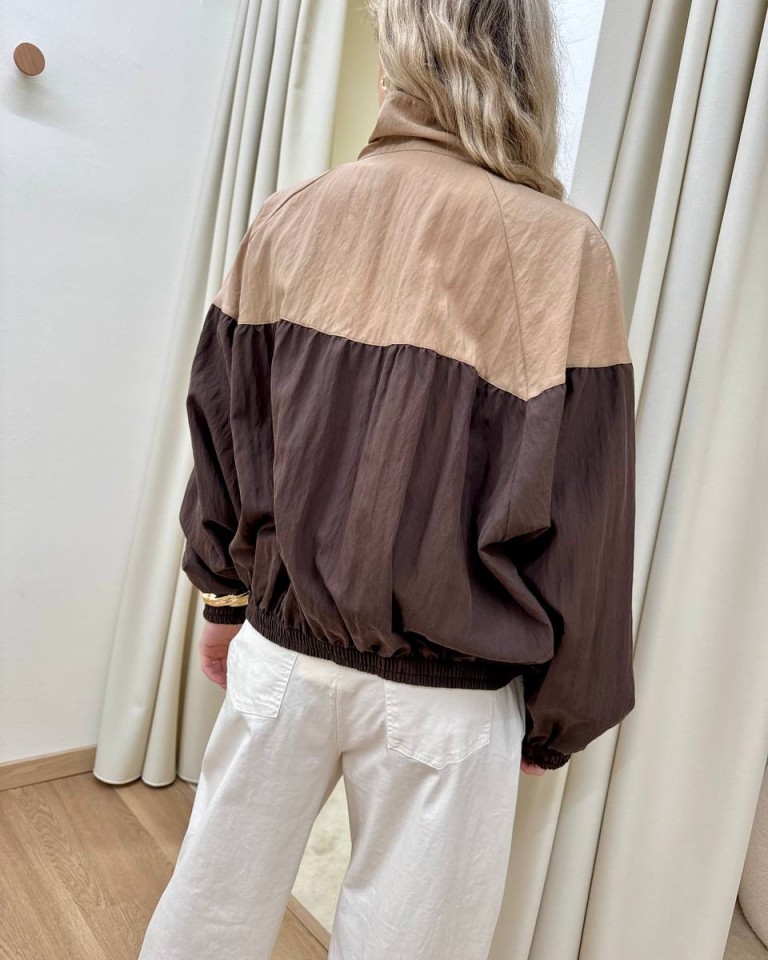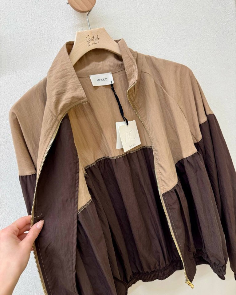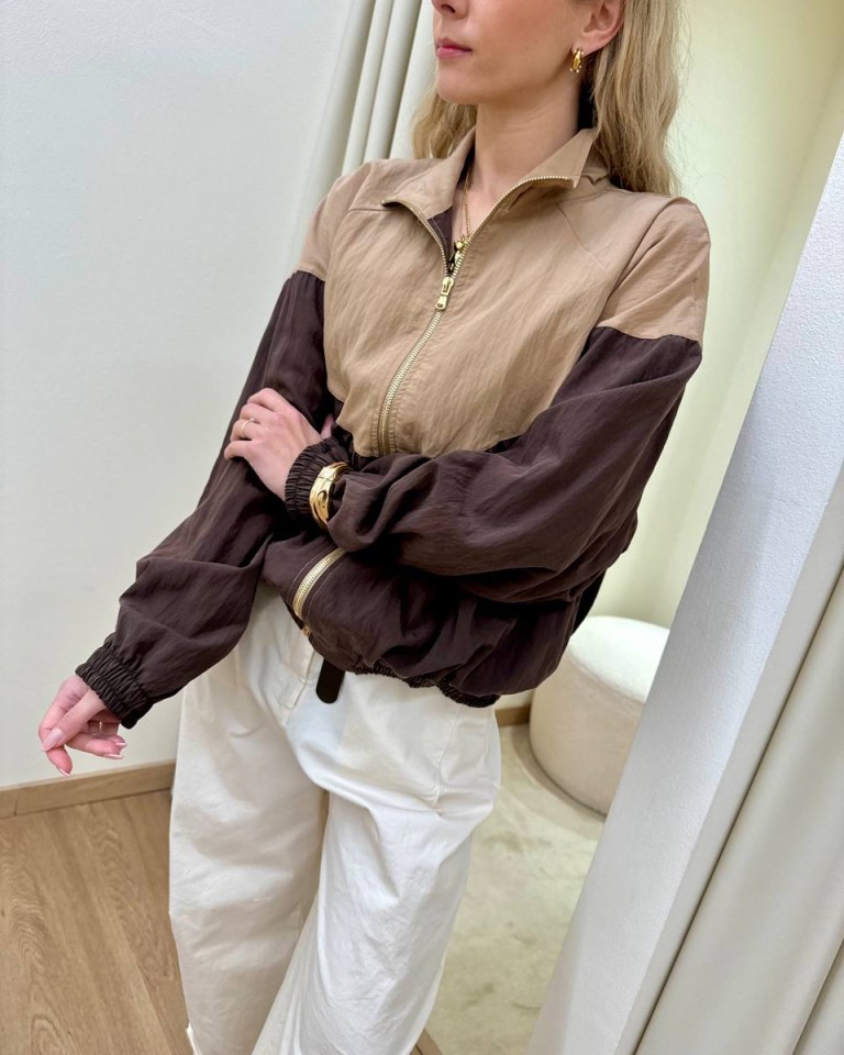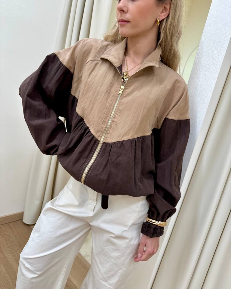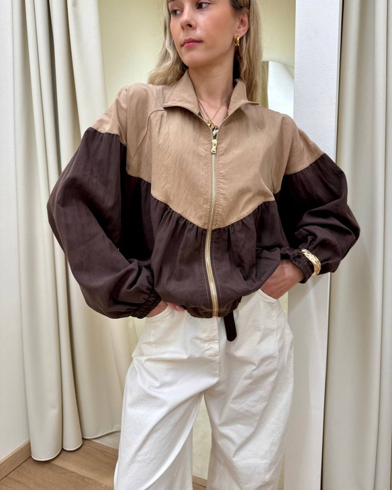 Bomber con taglio geometrico moro e cammello, modello over con maniche lunghe raglan a pipistrello con polsino elasticizzato, collo alto, taglio diagonale con arricciatura, arricciato in vita con elastico, chiusura davanti con zip dorata, sfoderato. Vestibilità ampia.