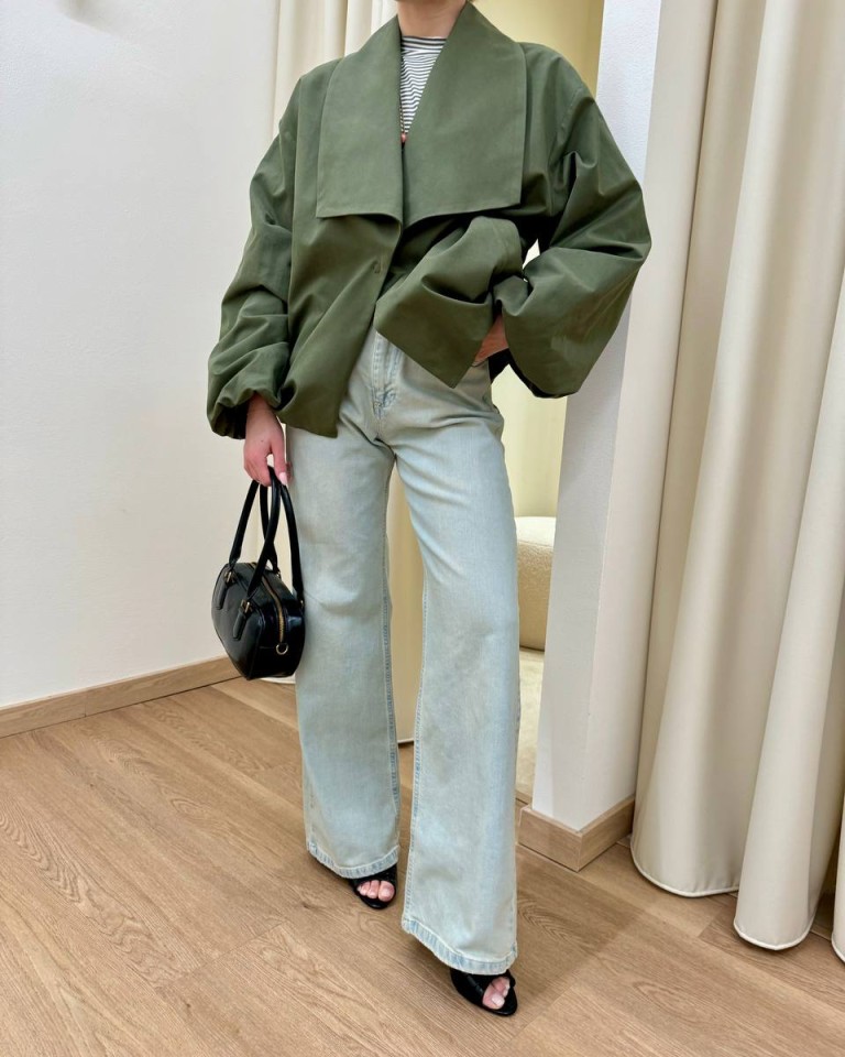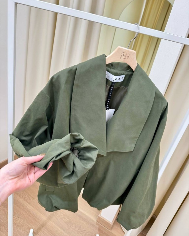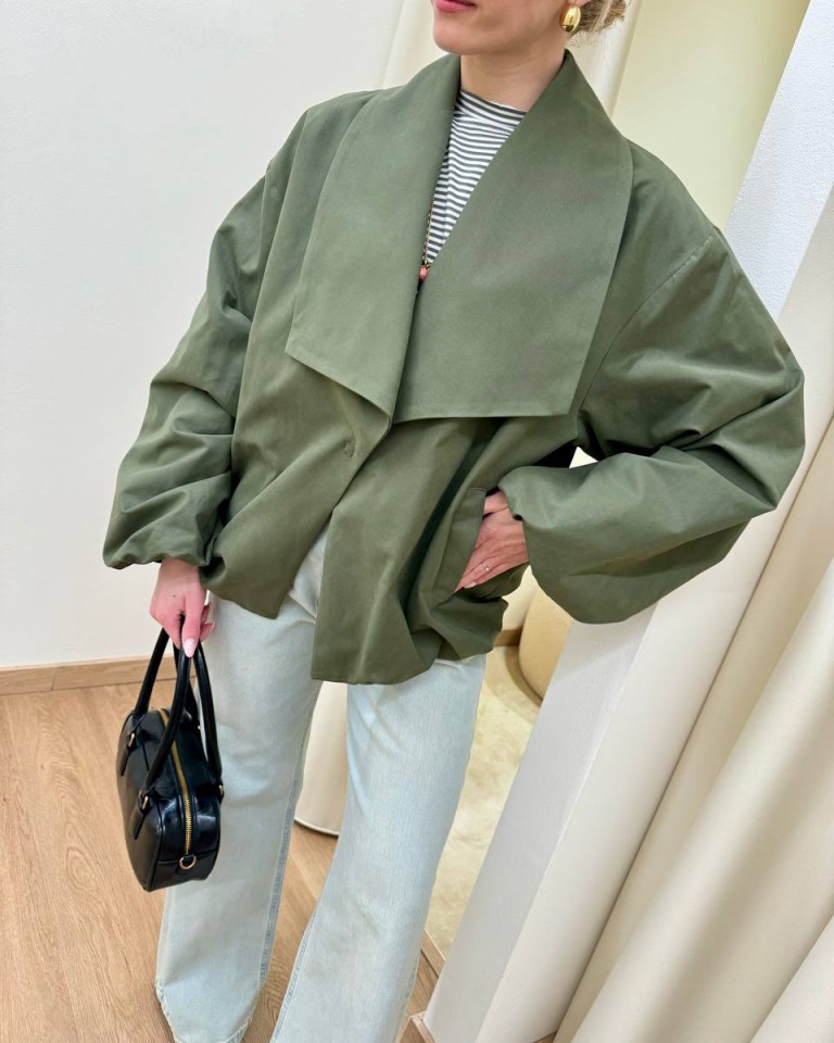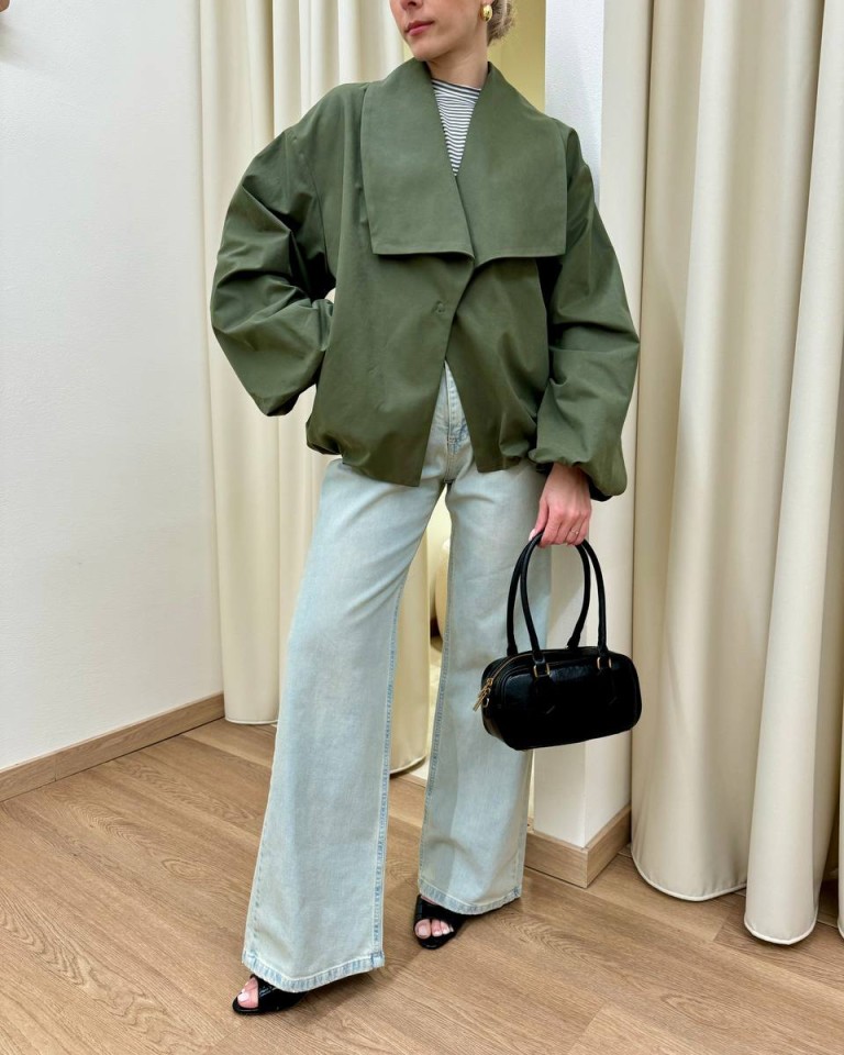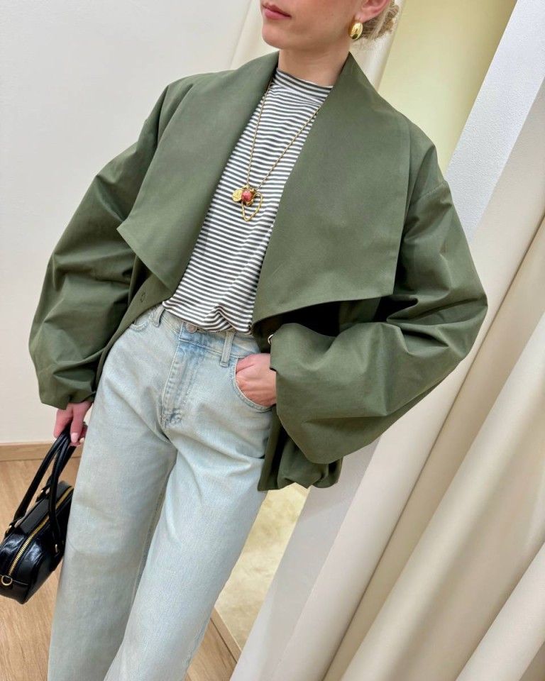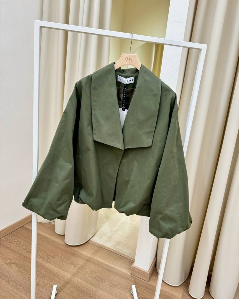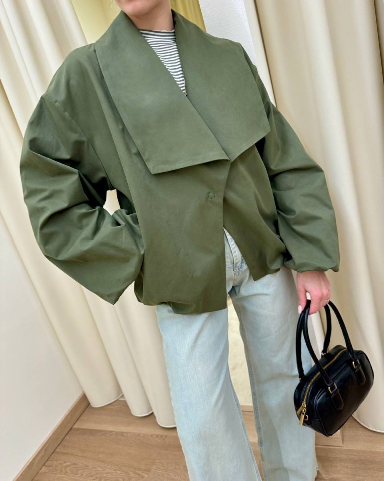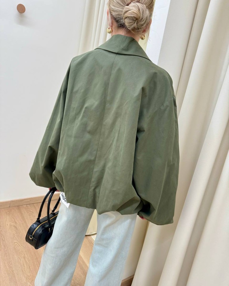 Bomber color verde militare, modello tipo trench con collo a scialle squadrato, manica lunga arricciata sul polso con giro sceso, tasche oblique, arricciatura sul fondo, chiusura con bottone automatico. Vestibilità ampia.