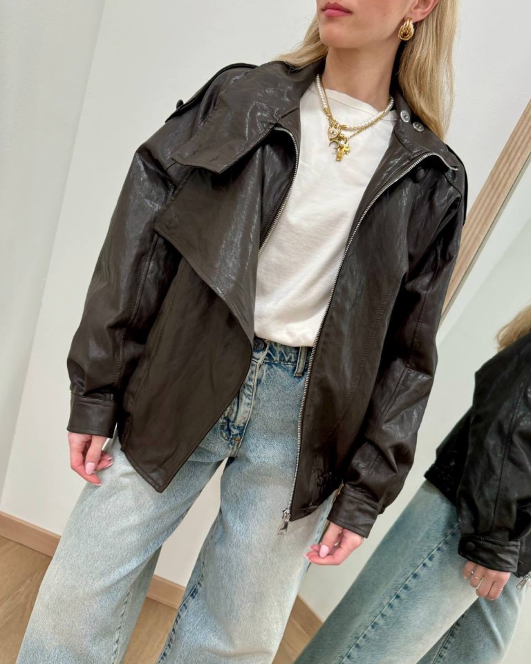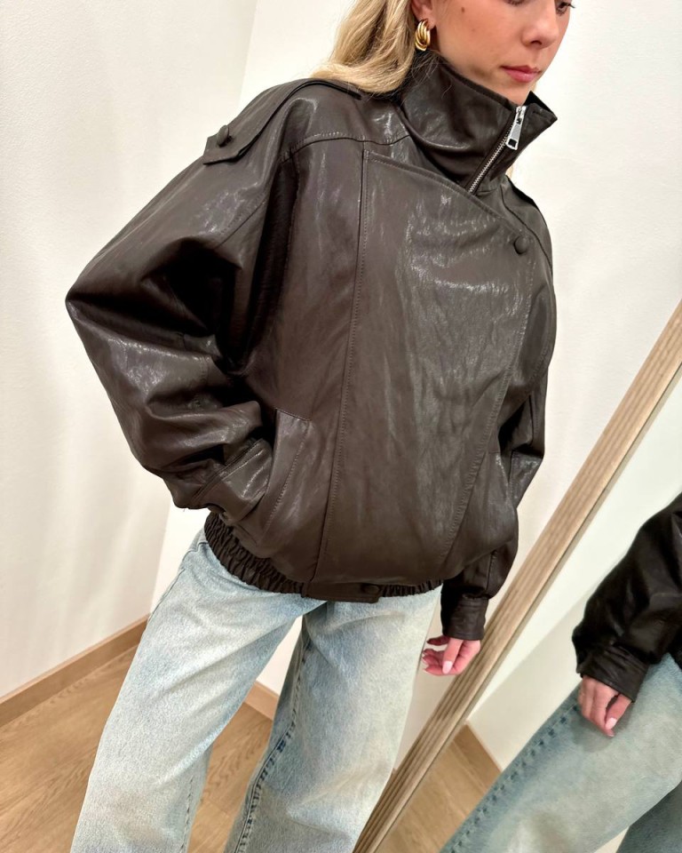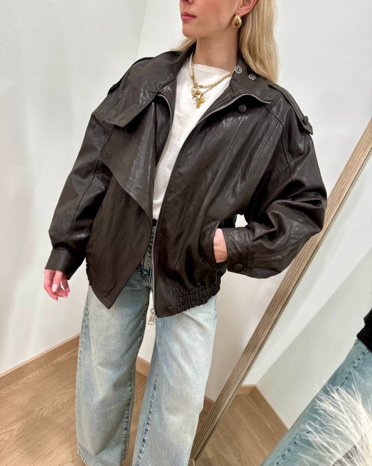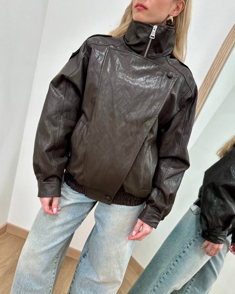 Bomber in ecopelle moro, modello maniche lunghe, doppiopetto, arricciatura con elastico in vita, chiusura davanti con zip nascosta. Vestibilità ampia.