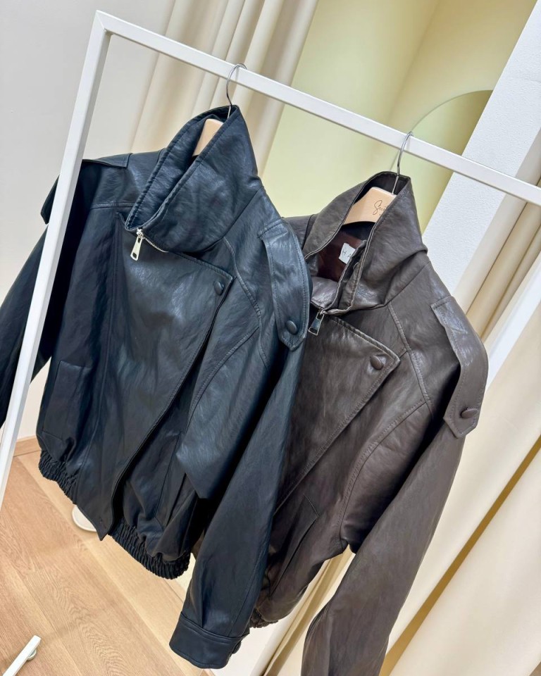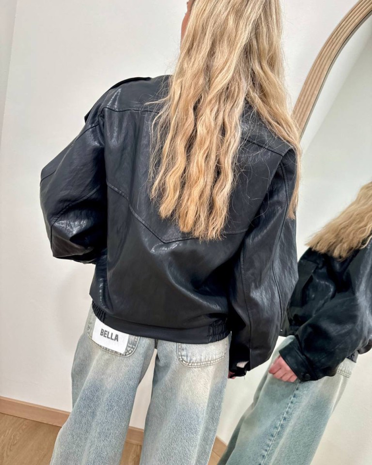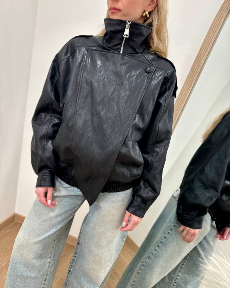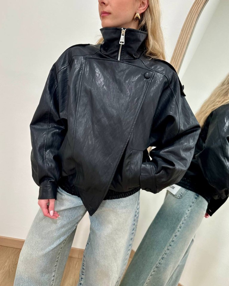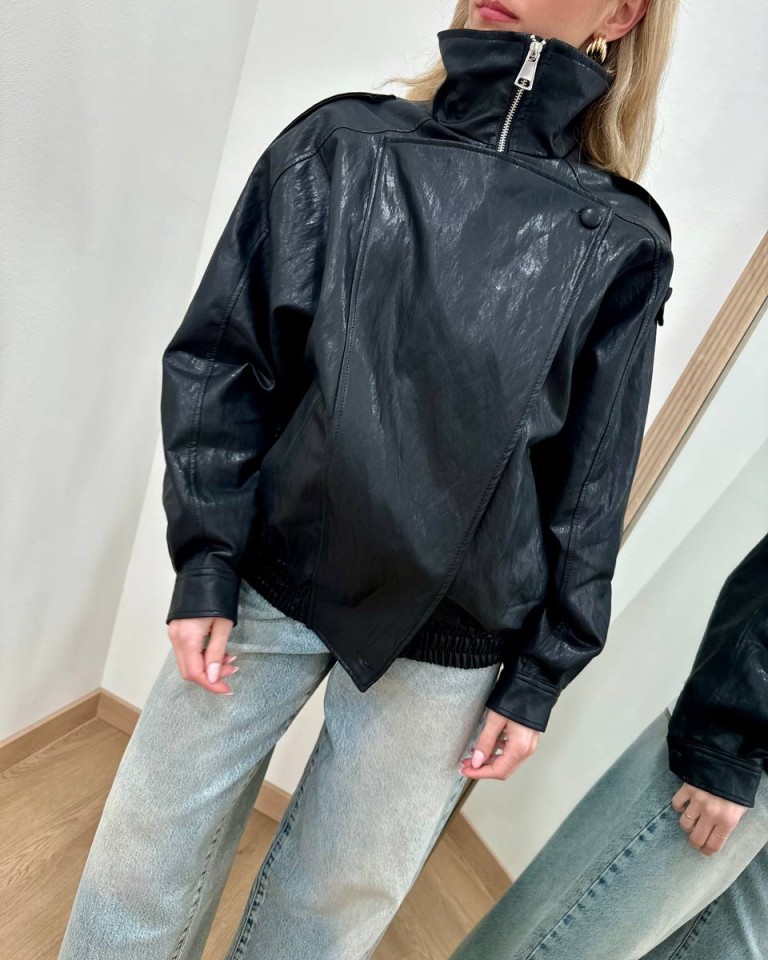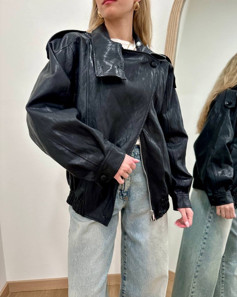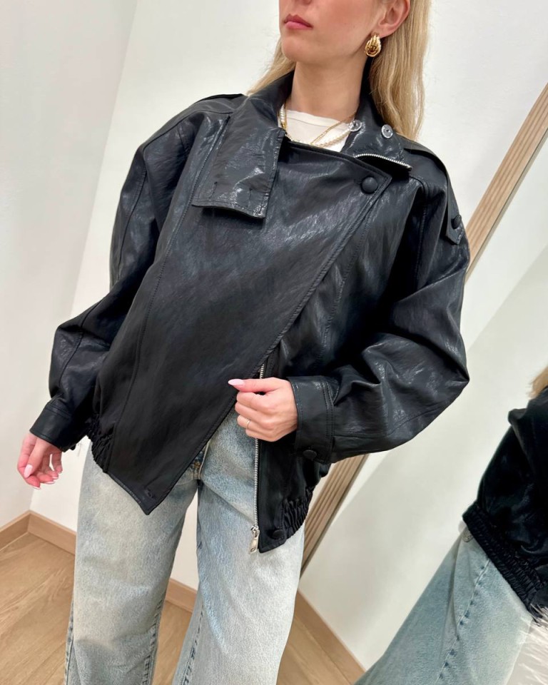 Bomber in ecopelle nero, modello maniche lunghe, doppiopetto, arricciatura con elastico in vita, chiusura davanti con zip nascosta. Vestibilità ampia.