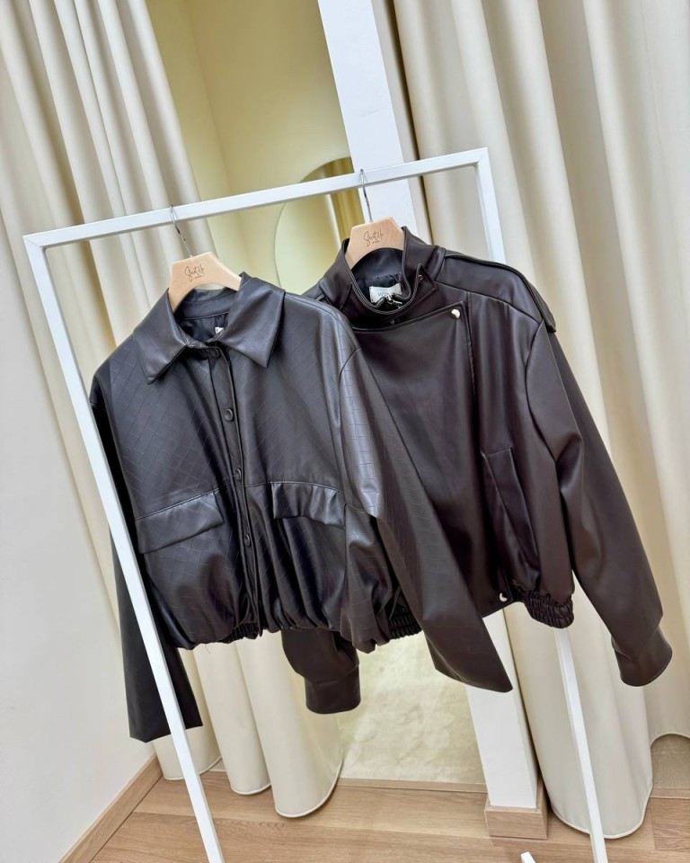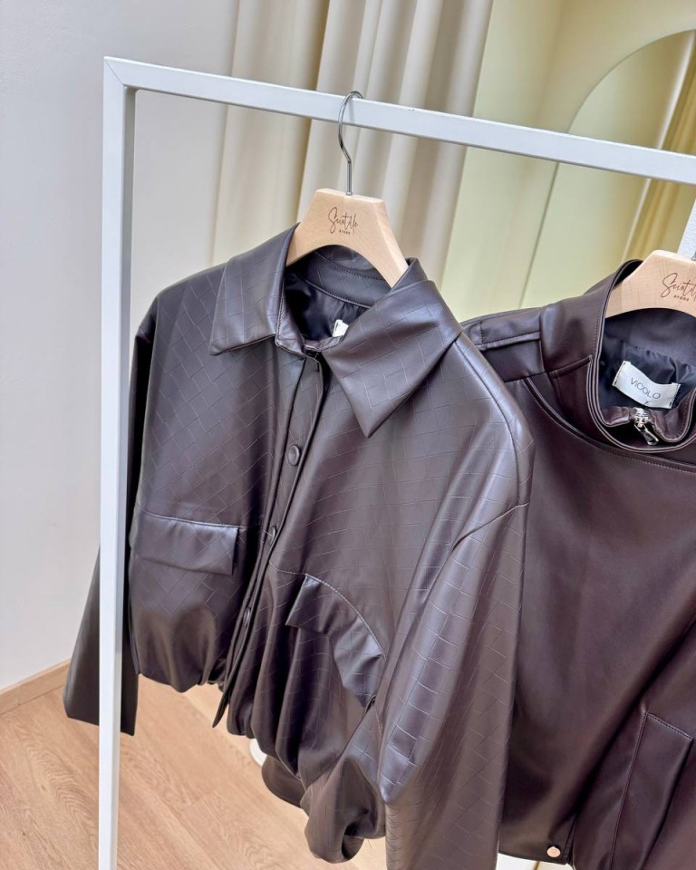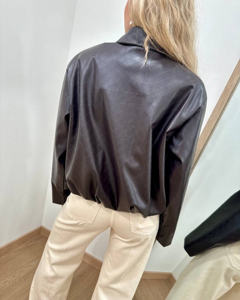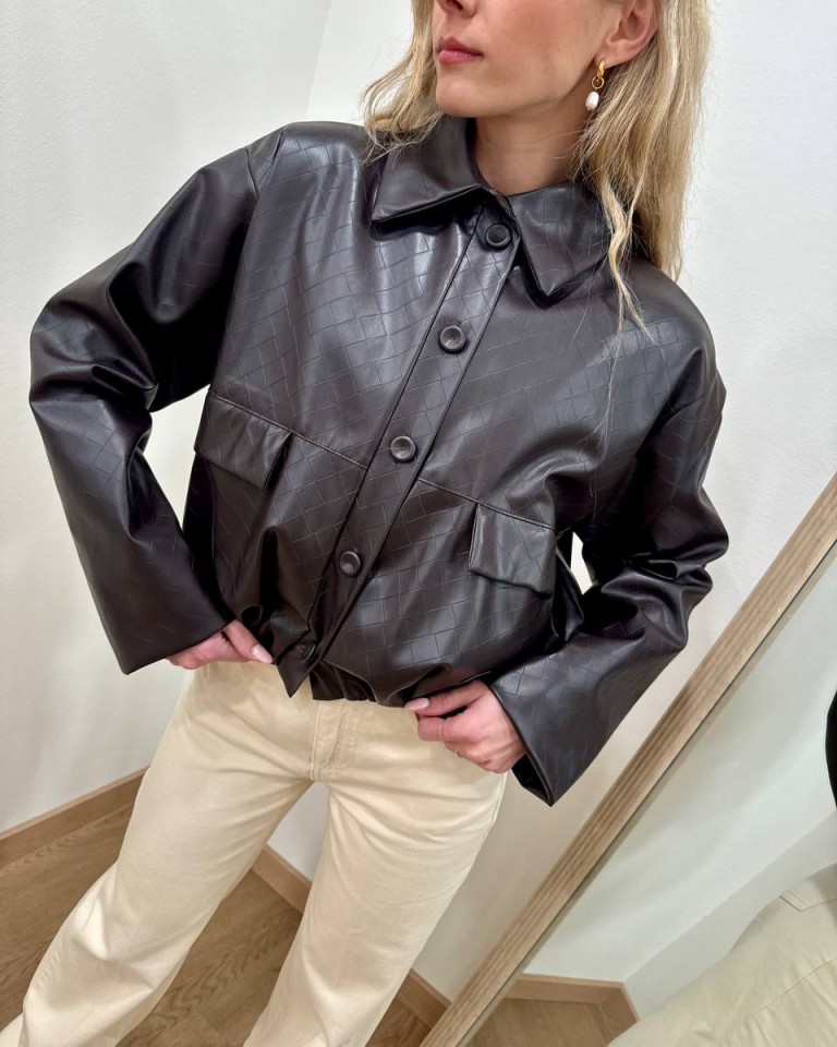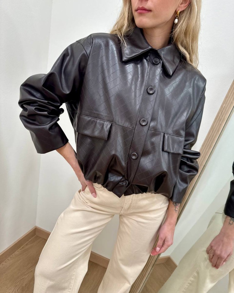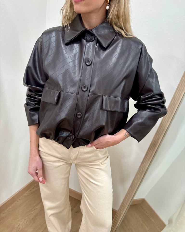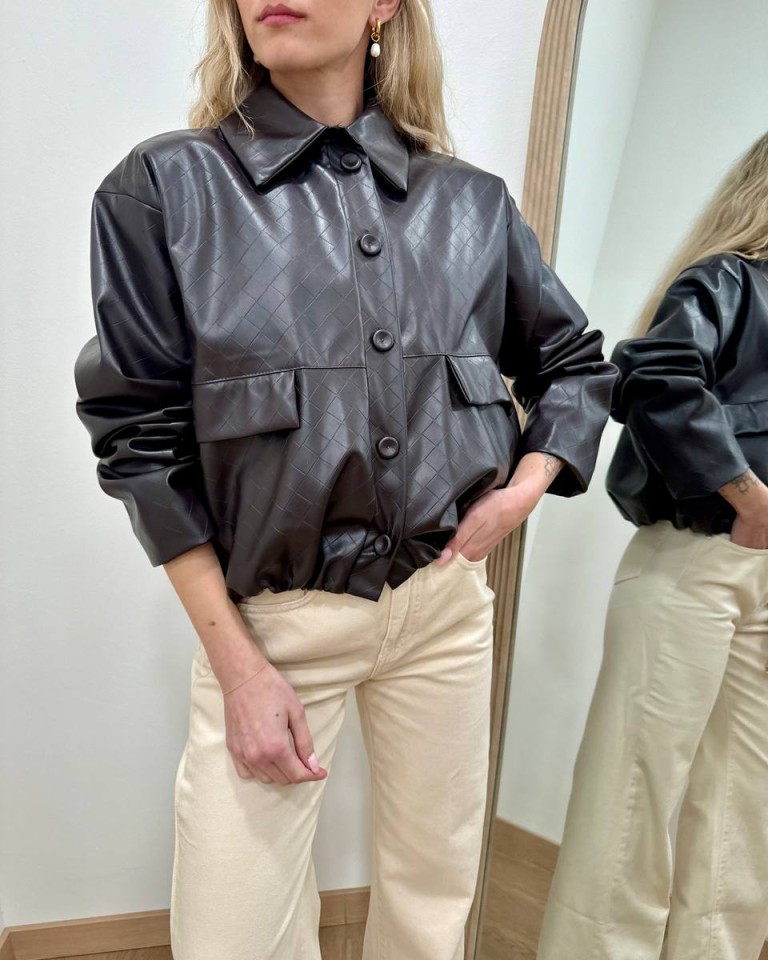 Bomber in ecopelle effetto intrecciato color moro, modello maniche lunghe con giro sceso, colletto a camicia, arricciatura con elastico in vita, tasche con patta, chiusura davanti con bottoni. Vestibilità ampia.